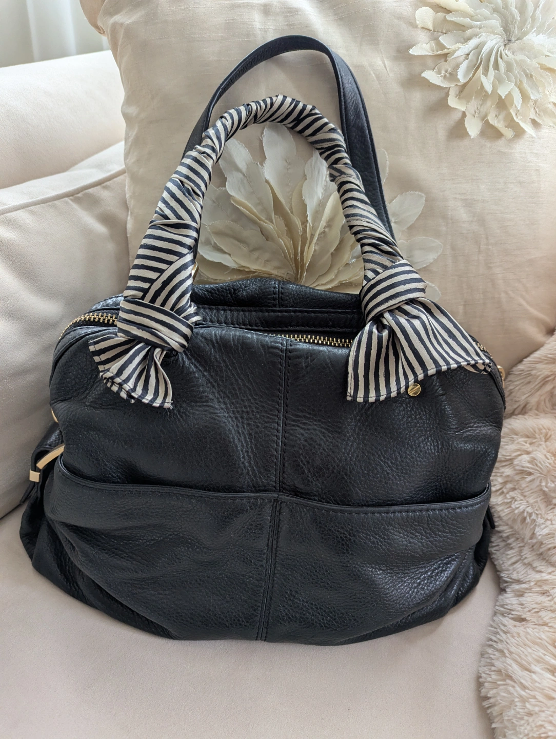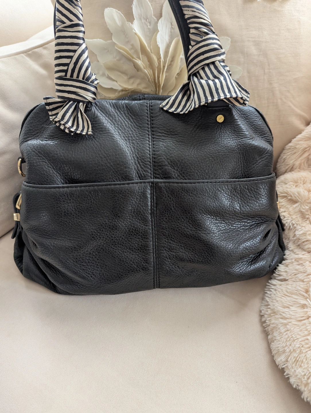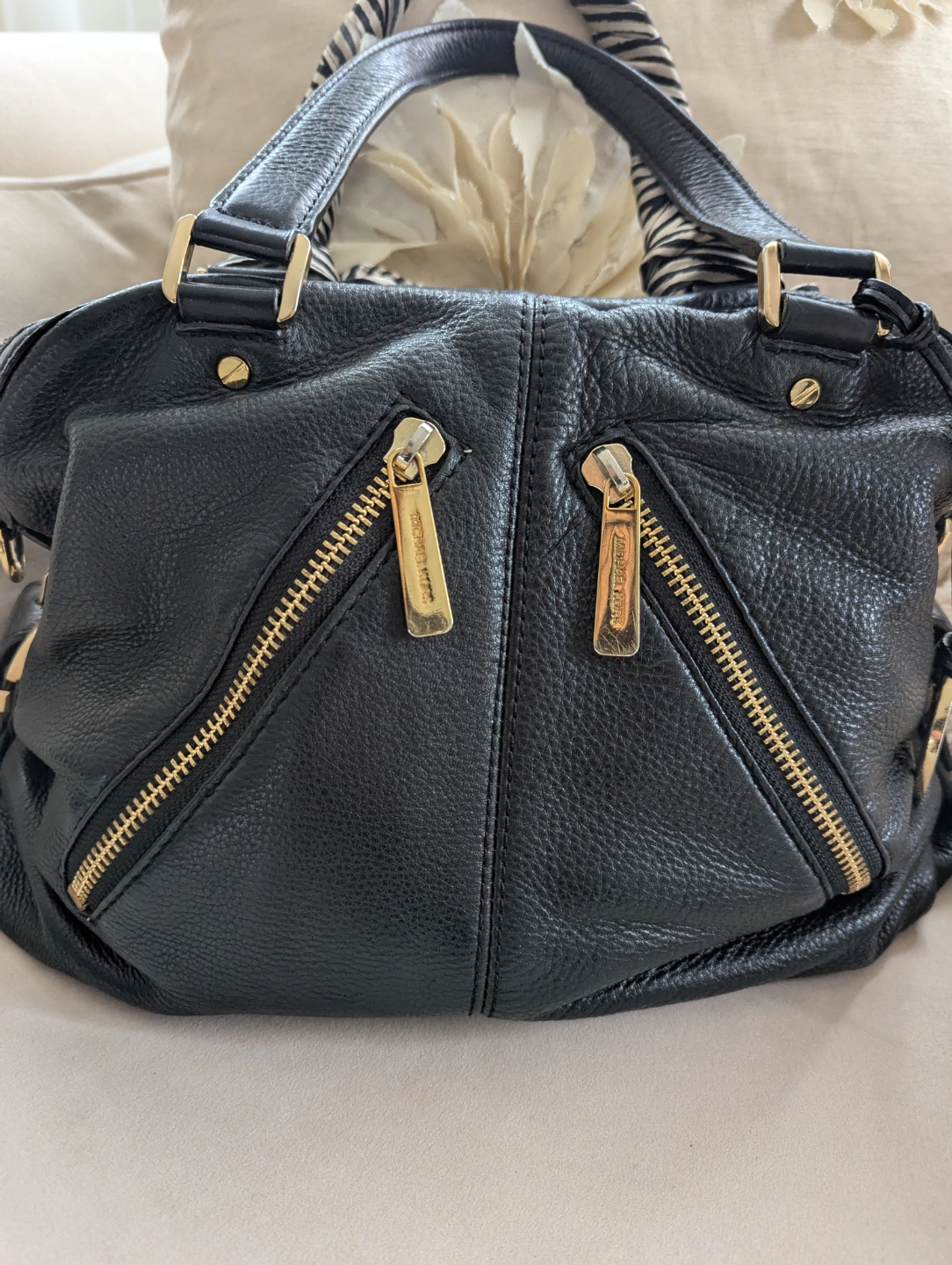 MK Black leather handbag. Goldtone hardware. Multiple zipper compartments. Top handles. Additional crossbody strap is included. excellent condition, velvet soft leather and a very practical size. The black and white striped scarf accent is not included.