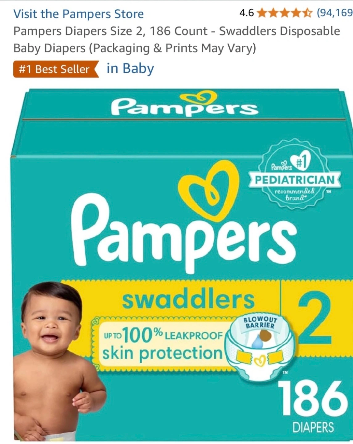 Baby diapers. Size 2. 186 count. Swaddlers. Packaging and prints may vary.