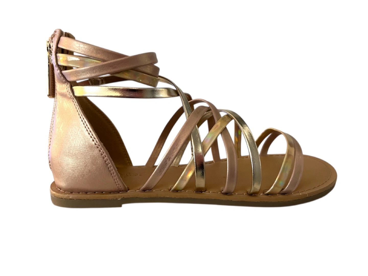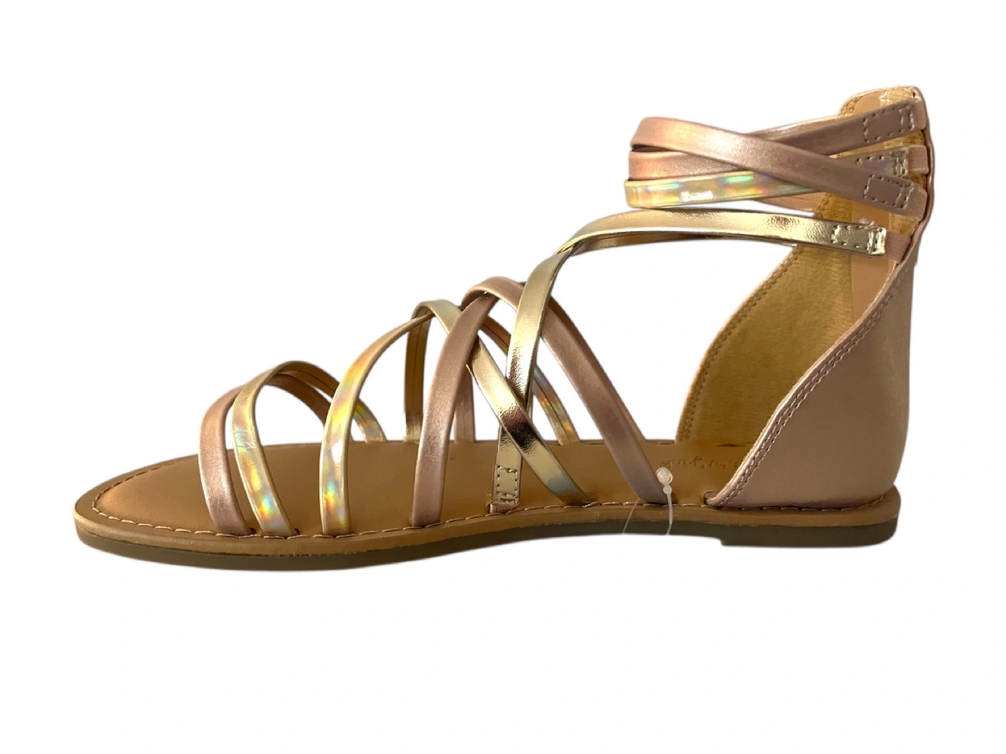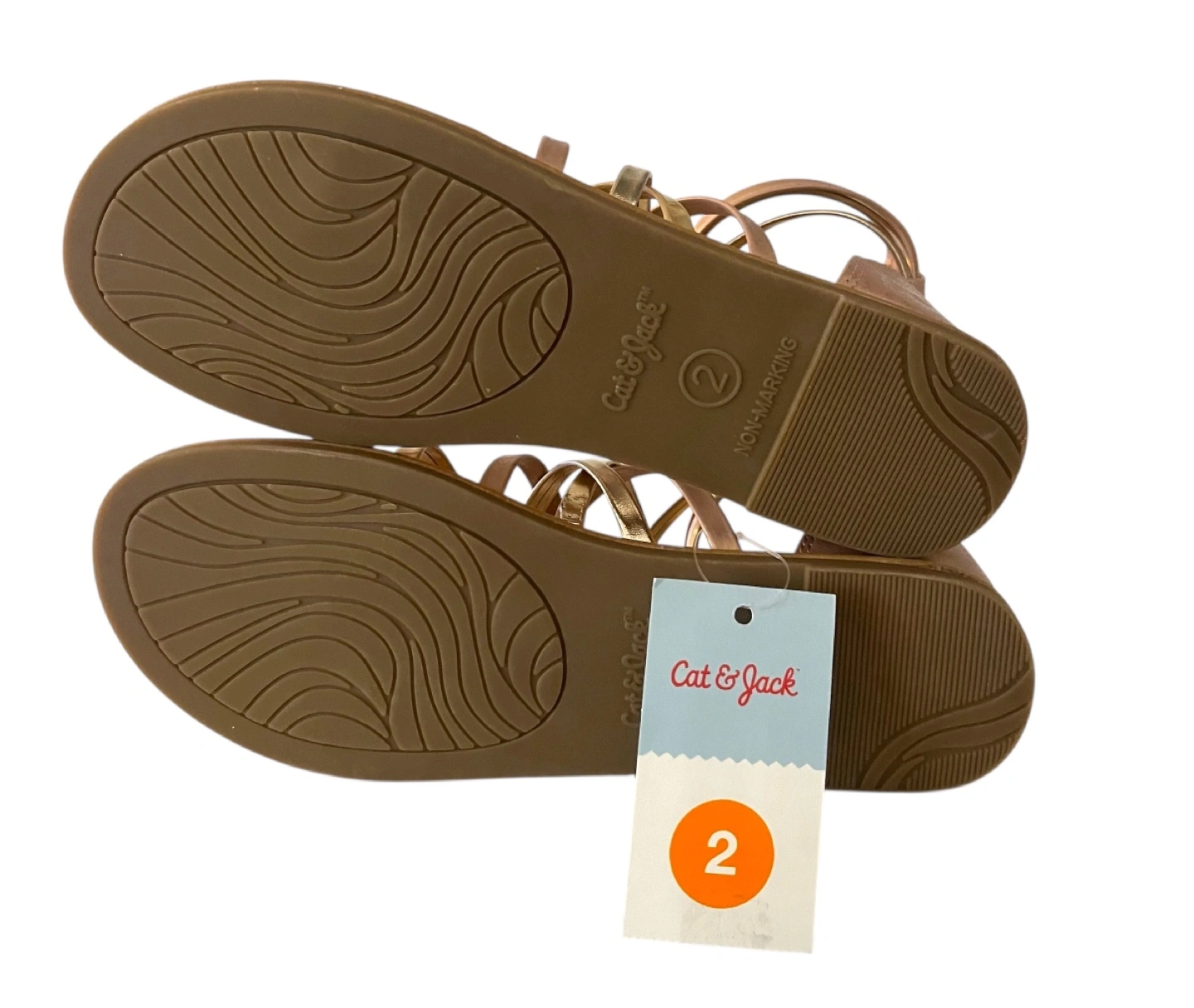 Step into sunshine with these adorable gladiator sandals! A cascade of metallic gold and rose-toned straps creates a dazzling effect, perfect for adding a touch of sparkle to any outfit. The convenient back zipper ensures easy on-and-off, while the strappy design keeps little feet cool and comfortable. These sandals are ideal for a day at the park, a family outing, or even a dressy occasion where a bit of playful elegance is desired. Department: Girls Style: Gladiator Color: Gold Type: Sandal Occasion: Casual, Dress, Party Character Family: None Performance/Activity: Beach, School, Walking, Dance Upper Material: Synthetic Accents: Zipper, Glitter, Straps Model: Cat & Jack Gladiator Closure: Zip Heel Height: Flat (Under 1 in) PU Ottawa & Westmount, Kitchener Keywords: Cat & Jack, gladiator sandals, strappy sandals, metallic sandals, gold sandals, rose gold sandals, toddler girls shoes, kids sandals, size 2, summer shoes, dress sandals, casual sandals, back zipper, new with tags