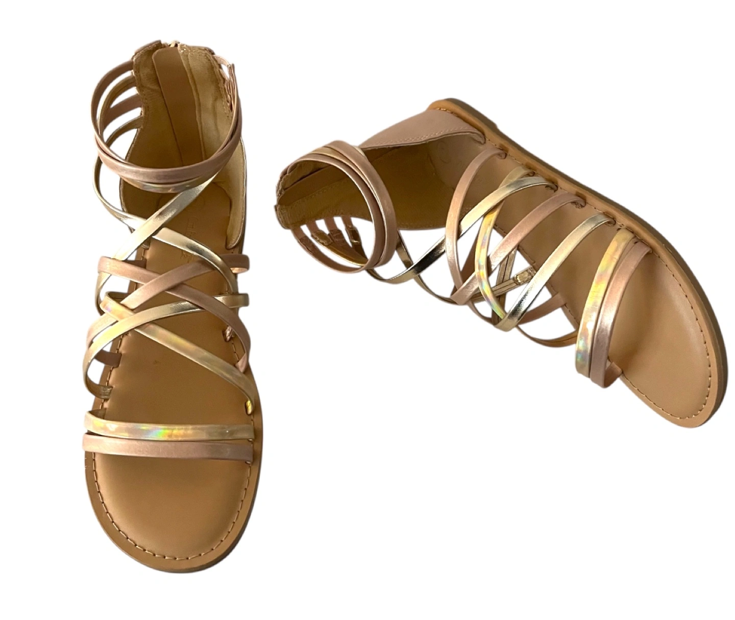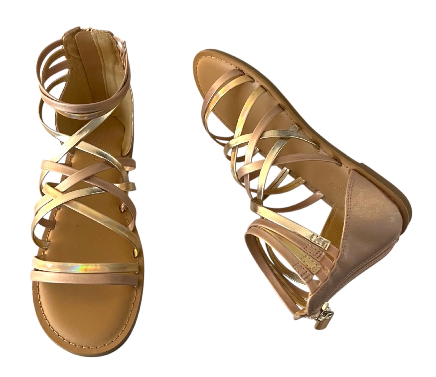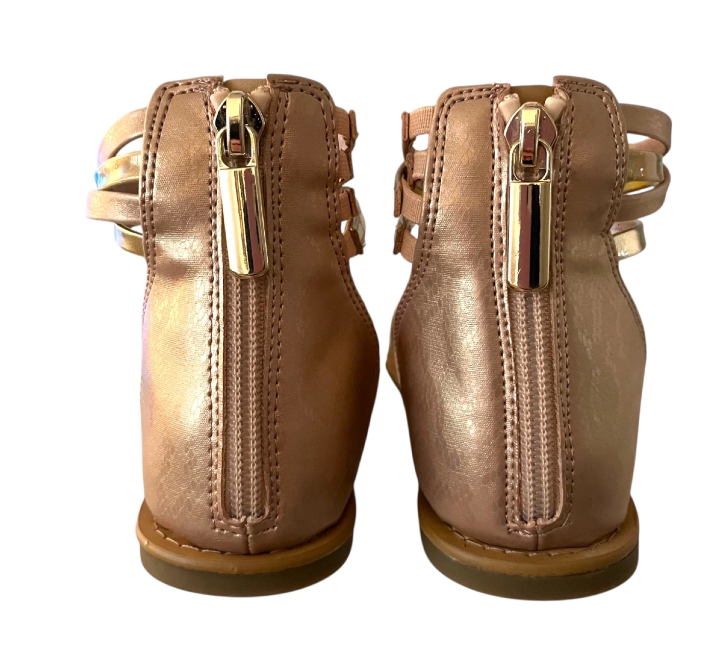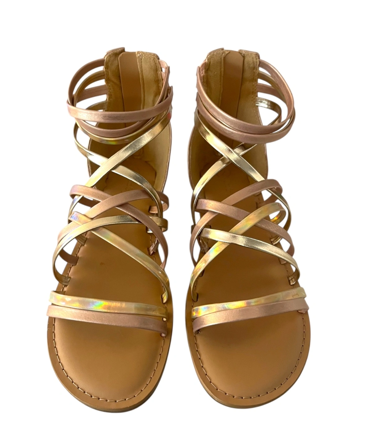 Step into sunshine with these adorable gladiator sandals! A cascade of metallic gold and rose-toned straps creates a dazzling effect, perfect for adding a touch of sparkle to any outfit. The convenient back zipper ensures easy on-and-off, while the strappy design keeps little feet cool and comfortable. These sandals are ideal for a day at the park, a family outing, or even a dressy occasion where a bit of playful elegance is desired. Department: Girls Style: Gladiator Color: Gold Type: Sandal Occasion: Casual, Dress, Party Character Family: None Performance/Activity: Beach, School, Walking, Dance Upper Material: Synthetic Accents: Zipper, Glitter, Straps Model: Cat & Jack Gladiator Closure: Zip Heel Height: Flat (Under 1 in) PU Ottawa & Westmount, Kitchener Keywords: Cat & Jack, gladiator sandals, strappy sandals, metallic sandals, gold sandals, rose gold sandals, toddler girls shoes, kids sandals, size 2, summer shoes, dress sandals, casual sandals, back zipper, new with tags