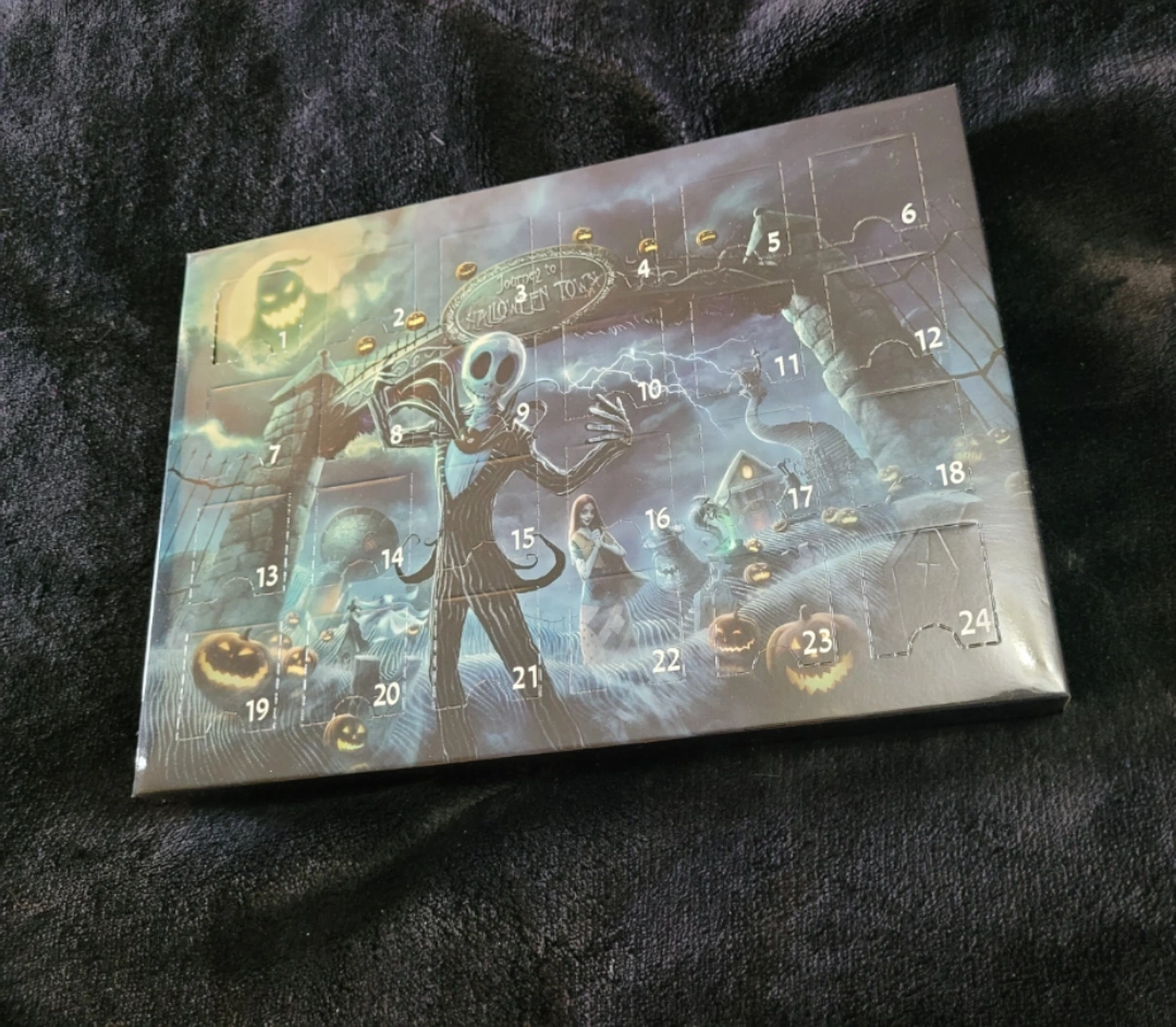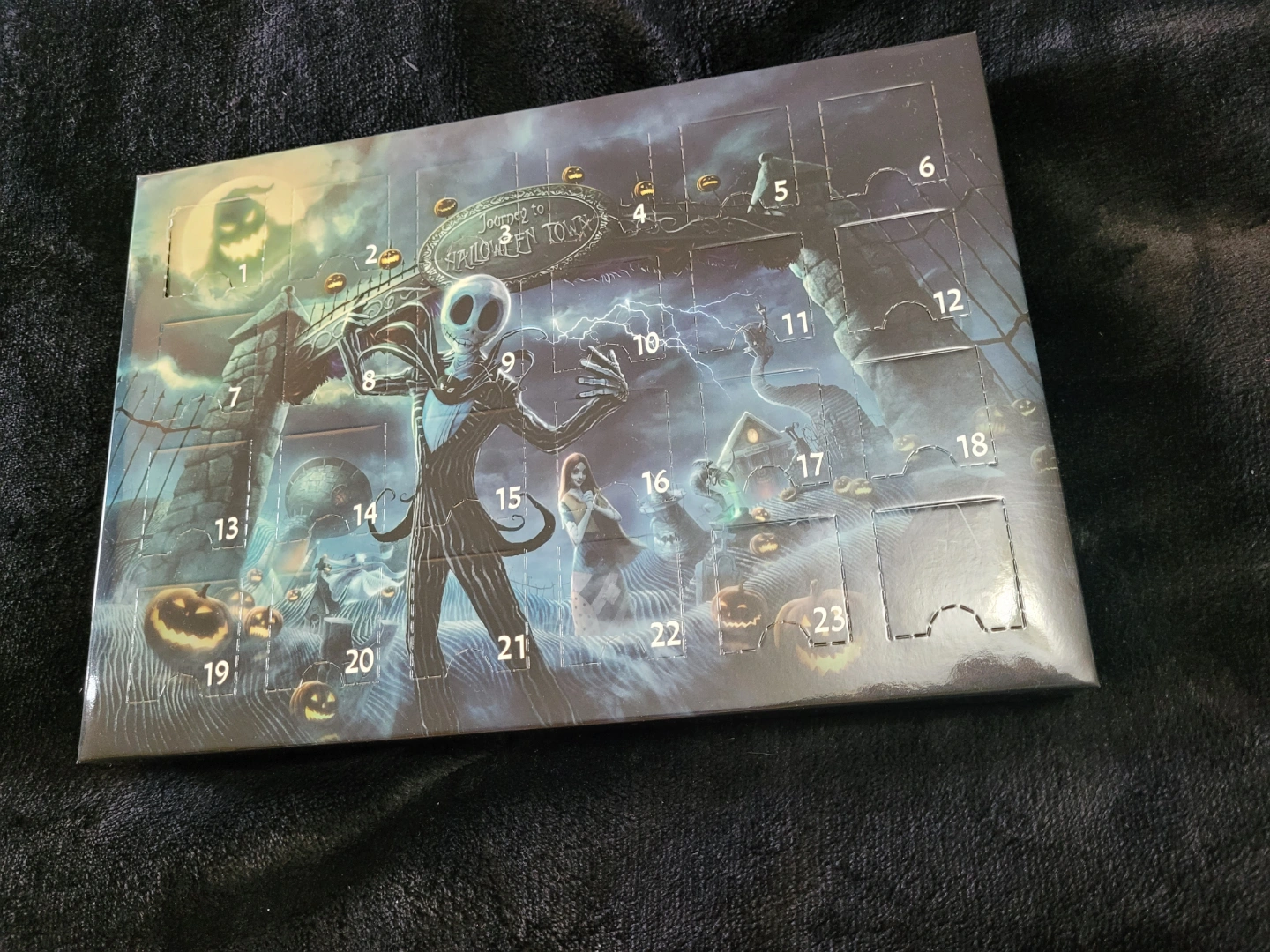 Nightmare Before Christmas advent calendar. Features 24 doors, each concealing a small collectible figurine. Box shows Jack Skellington and Halloween Town imagery. One figurine already opened. Great for fans of Tim Burton and Halloween. Pick up only, Don Mills and York Mills area.