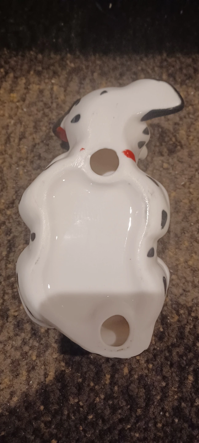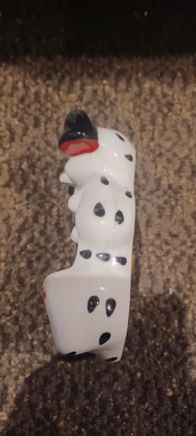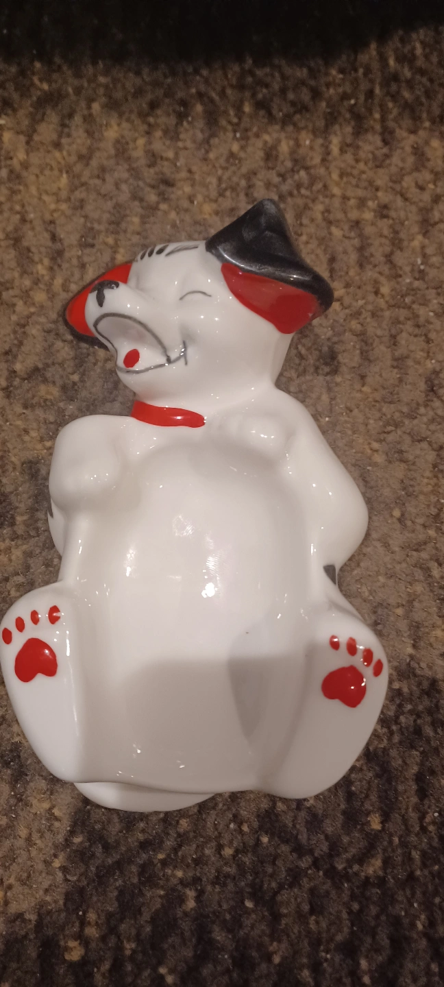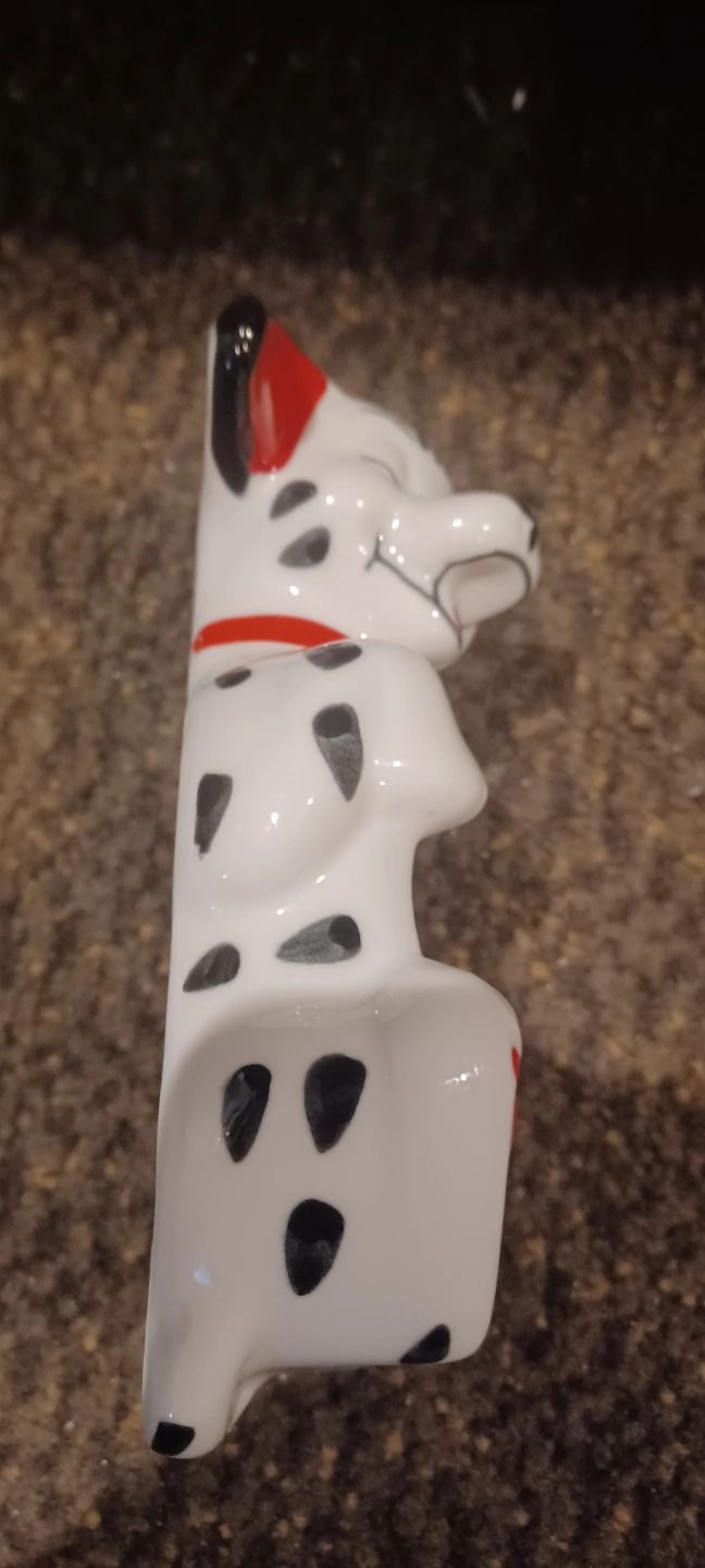 This vintage Dalmatian dog soap dish is a unique and charming addition to any bathroom decor, featuring a playful design with red accents. This item is used. In good condition Size 5.8 inches tall and 3.4 inches wide Pick up in Etobicoke Near Eglinton and Renforth
