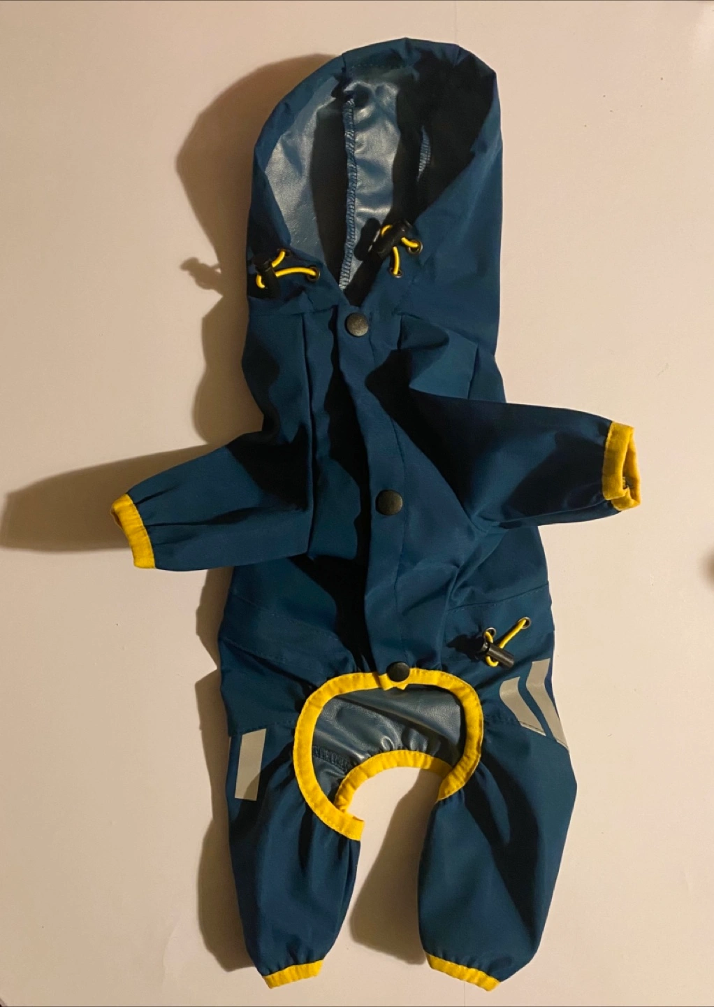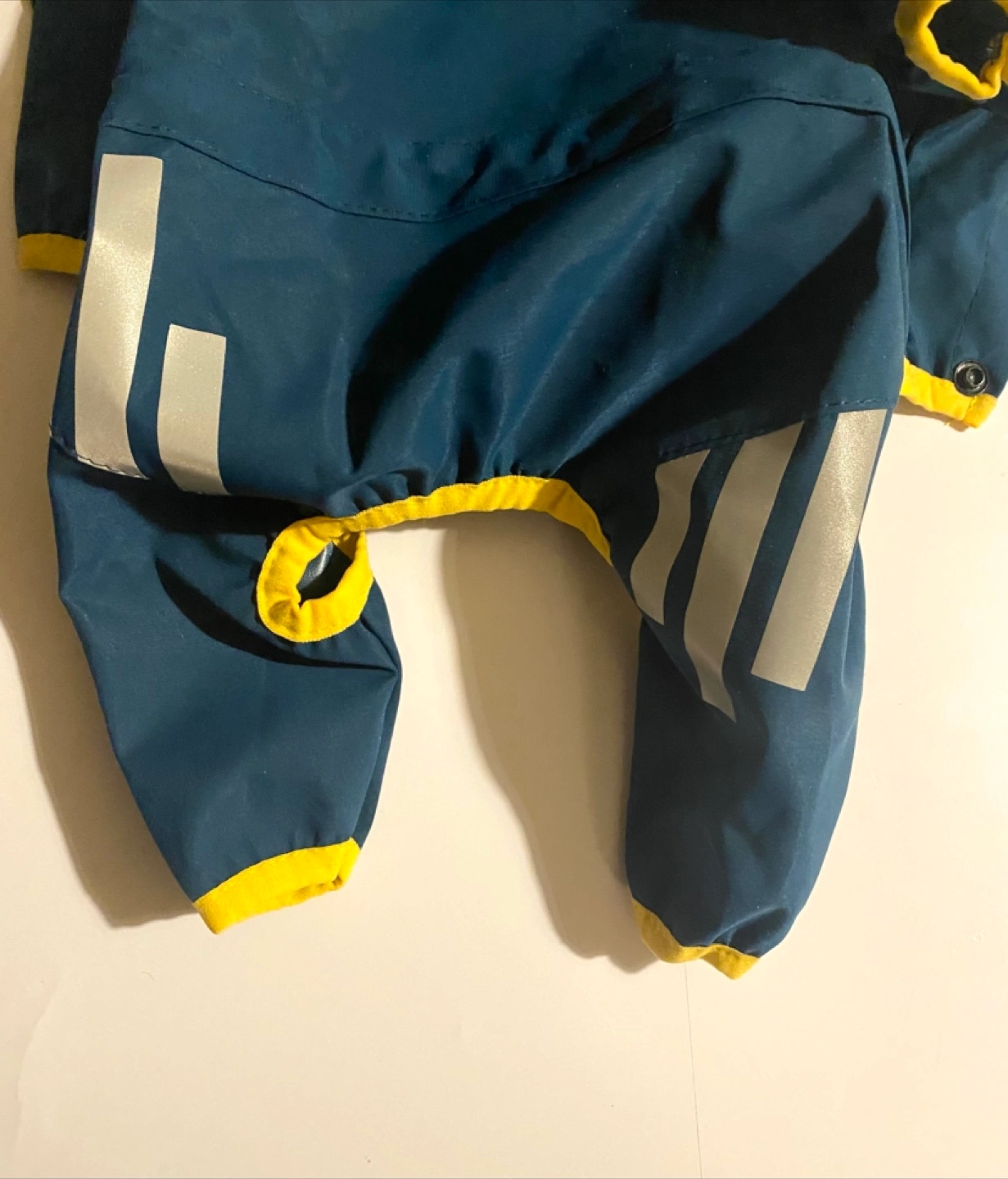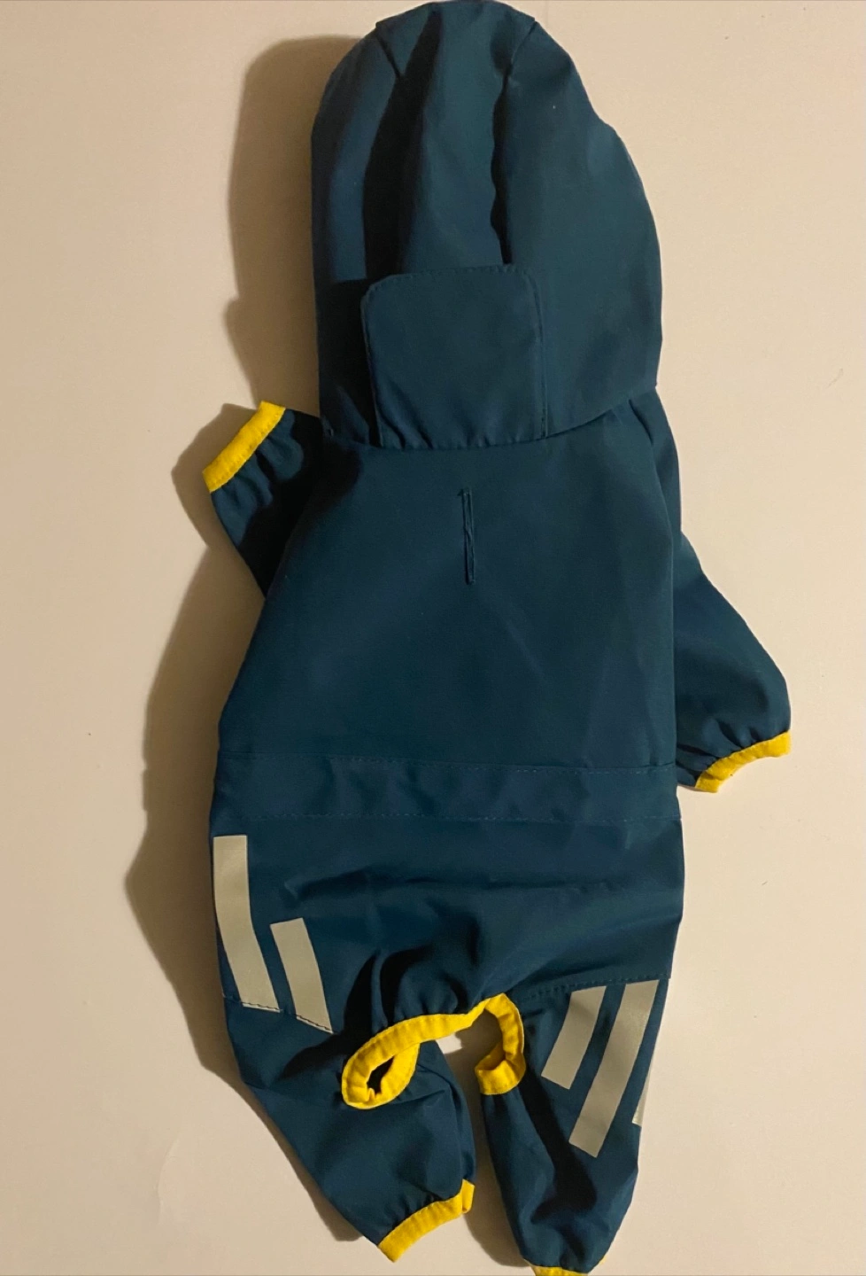 Joyful Pattern Pet Supplies. Blue waterproof raincoat. Size medium. Hooded. Leash hole. Reflective strips. Yellow accents. For small dogs -see measurement chart. New just tried on dog, too small. Pick Up Cash Only Please If It’s Posted & Not Reserved It’s Still Available.