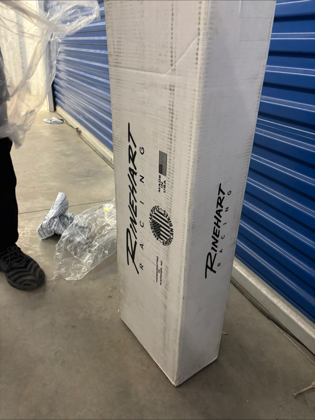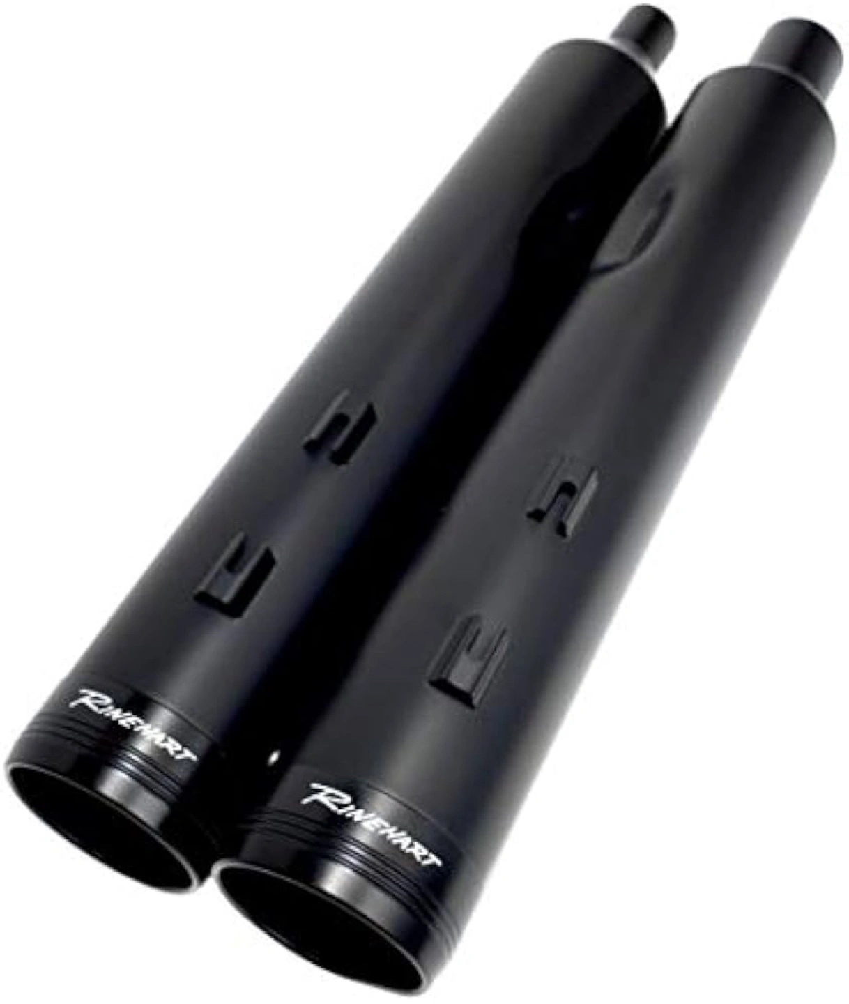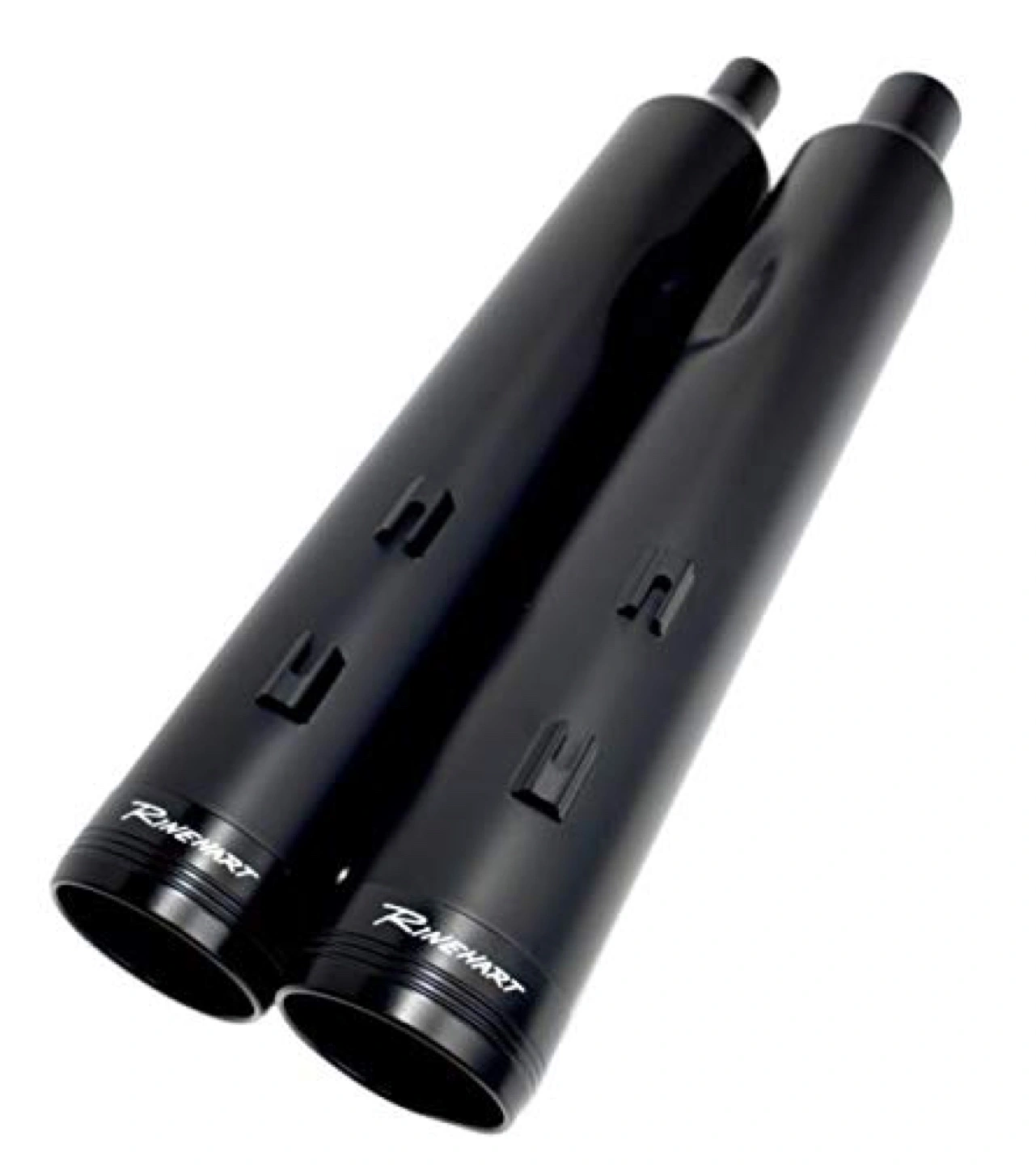 Pair of black Rinehart Racing exhaust pipes. New in box. Long, slender design. Looks great on a motorcycle.