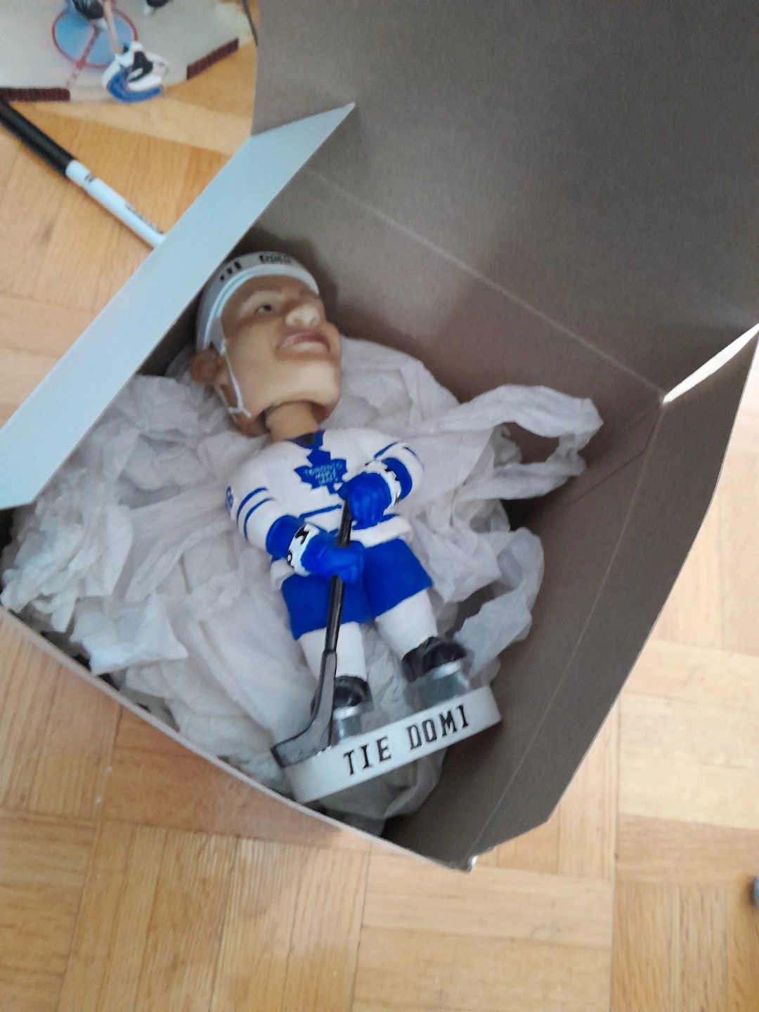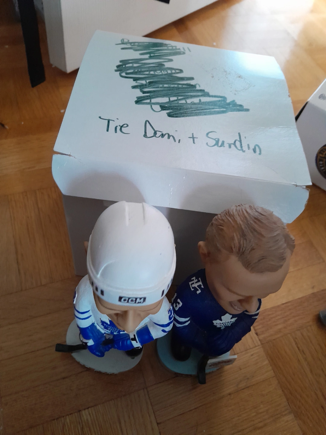 Two Toronto Maple Leafs bobbleheads. Tie Domi and Mats Sundin. Collectible figurines.