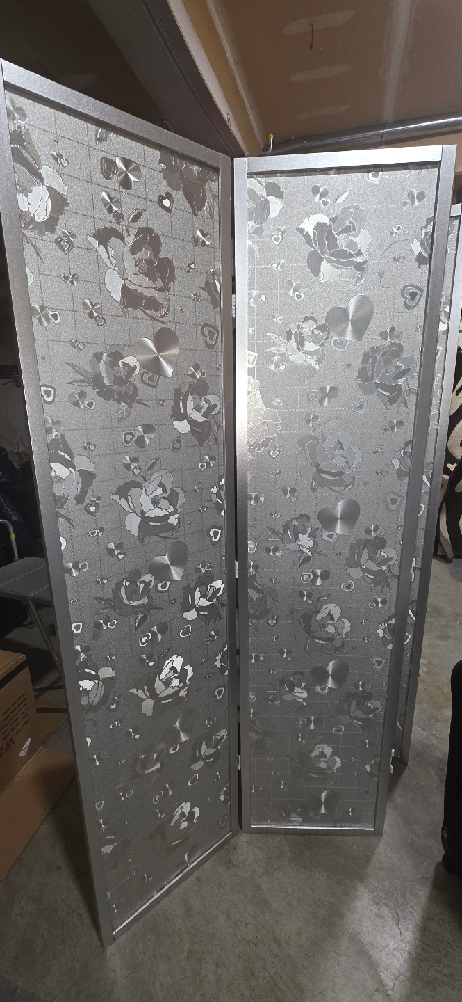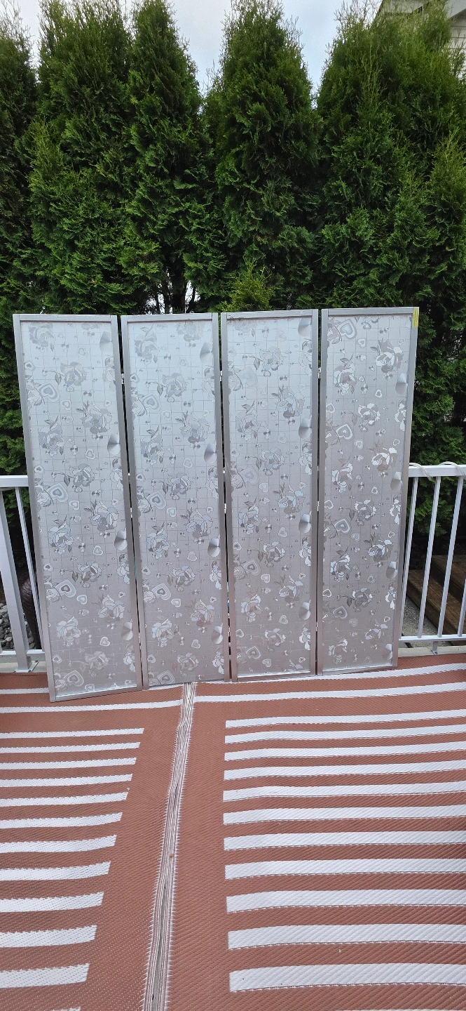 Silver coloured wood frame. Floral pattern and heart pattern. Good condition. Four panels, two sets.