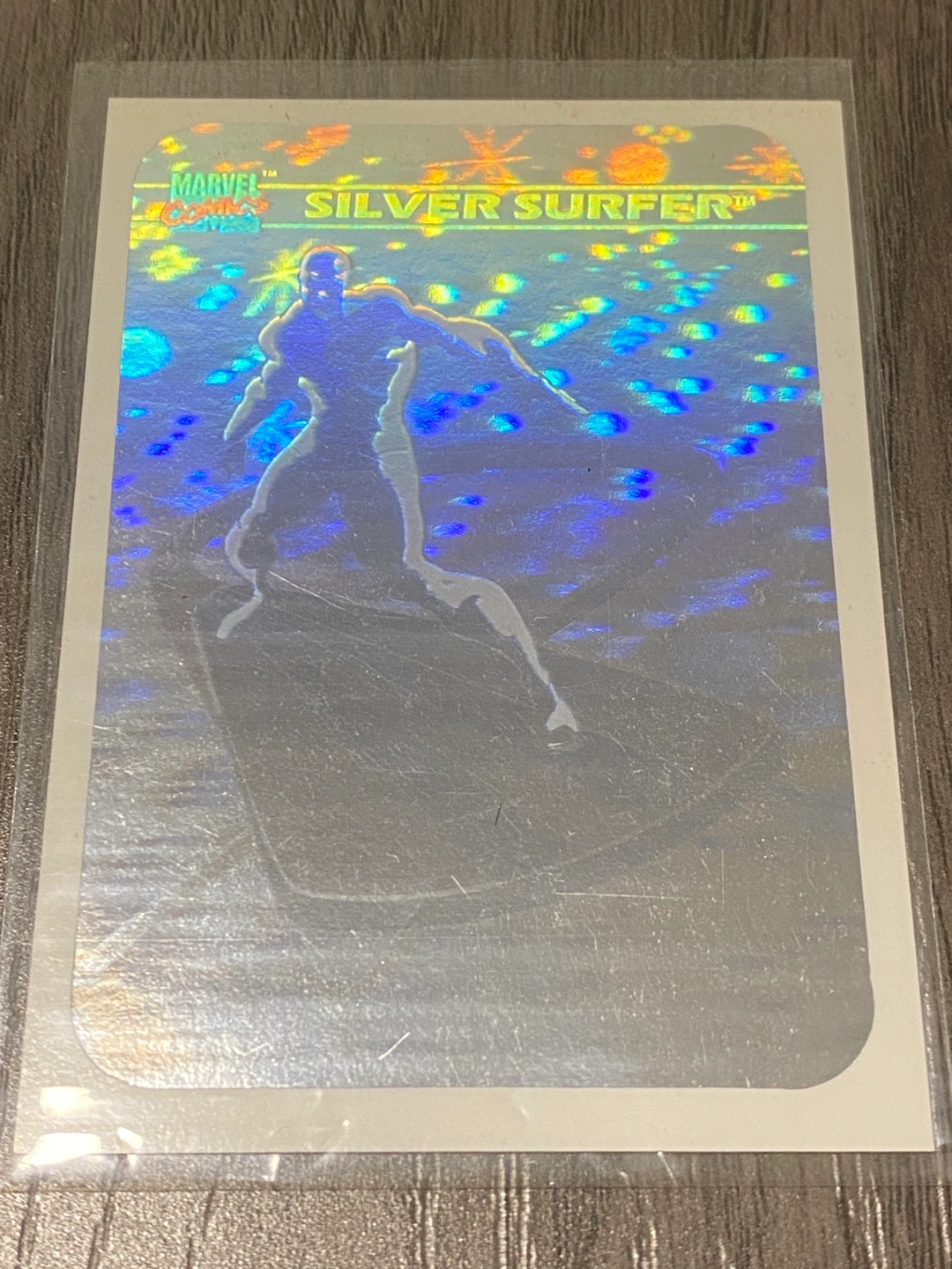 1990 Marvel Universe hologram card. Silver Surfer image. Part of a 5-card collector's set. Collectible card. Protected in a plastic and hard sleeve.