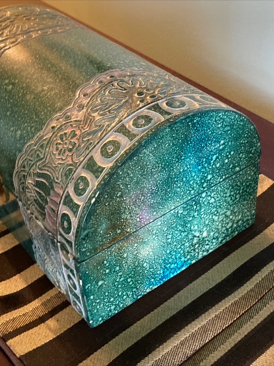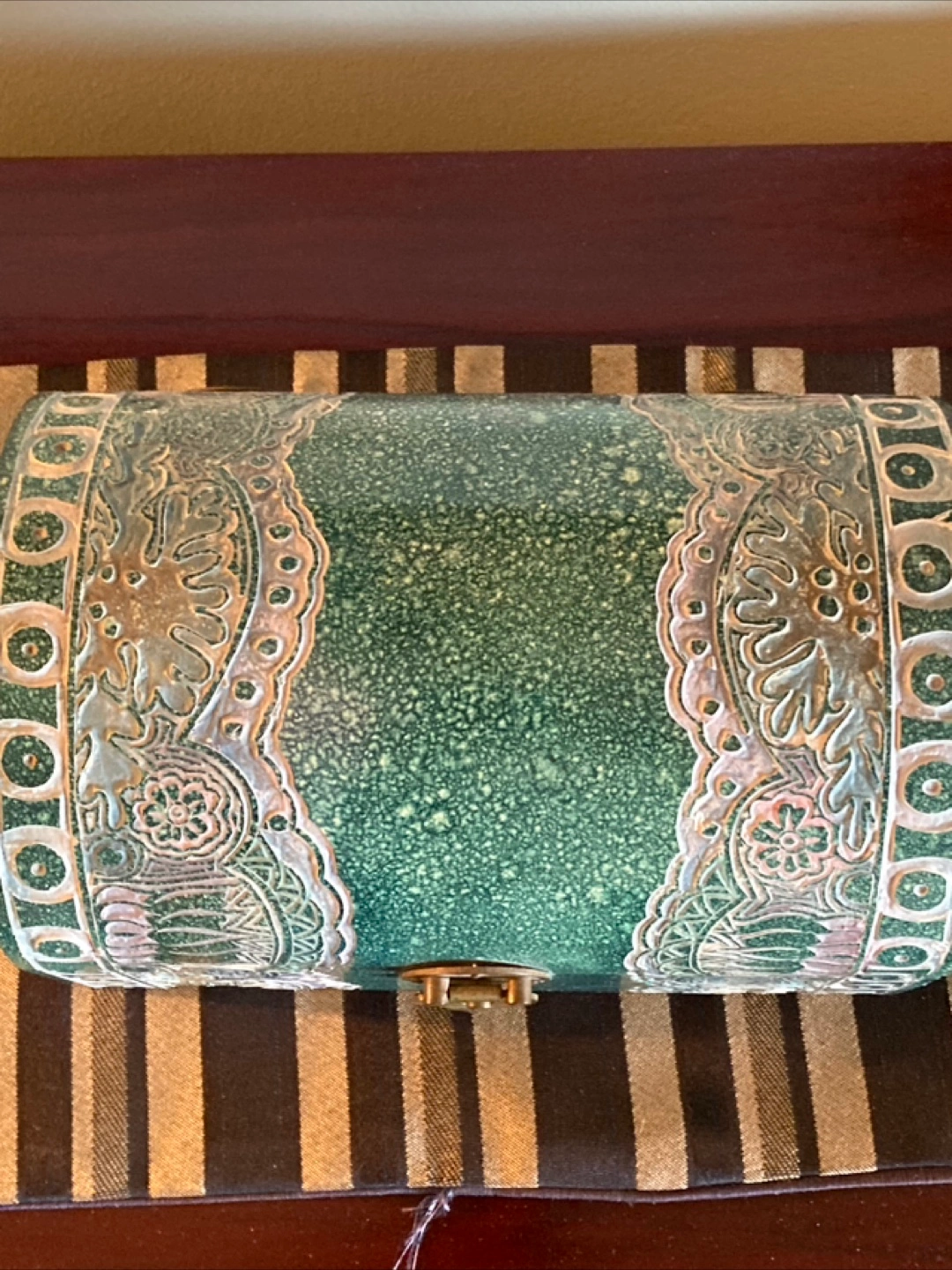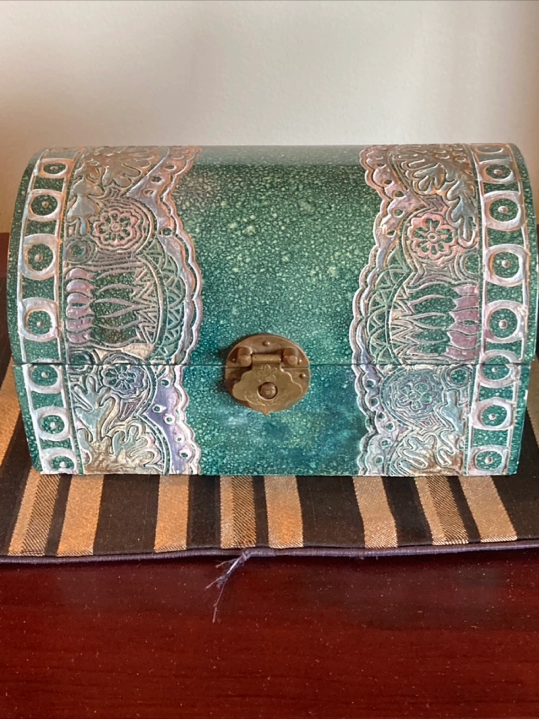 10” 6” 4” Small decorative box. Green finish with embossed floral accents. Brass clasp. Interior lined with green fabric. Perfect for jewellery or small keepsakes. Shows some wears and tears. The lock and key are missing.