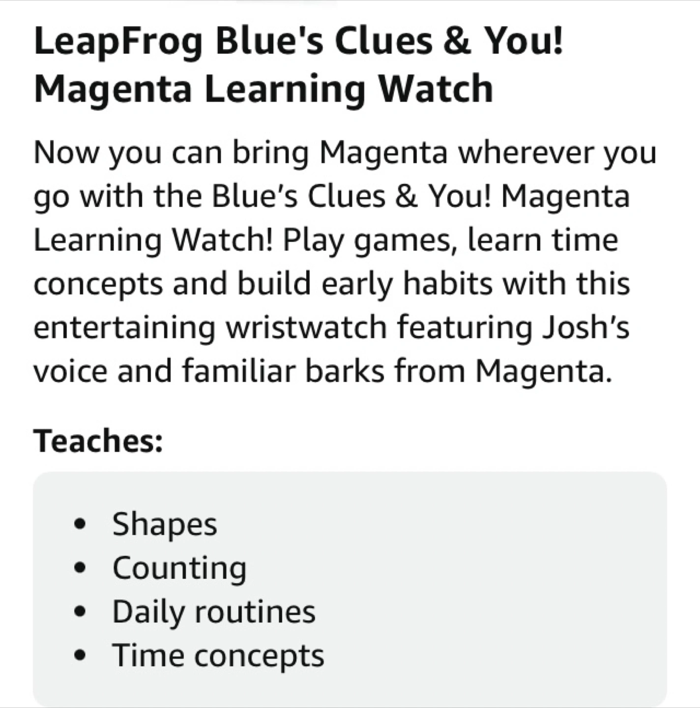 Great Xmas gift. Magenta Learning Watch. Features games, teaches time For ages 2+. Requires 3 AAA batteries (included )