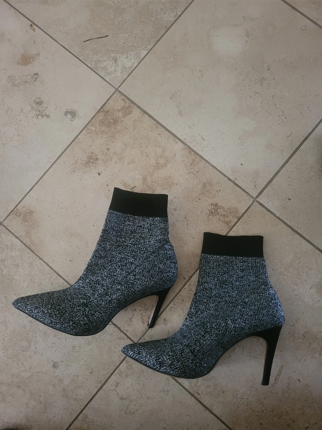 Pair of silver glitter knit booties. Pointed-toe design. High heels. Black knit cuff. black suede on heel paid 250 at browns