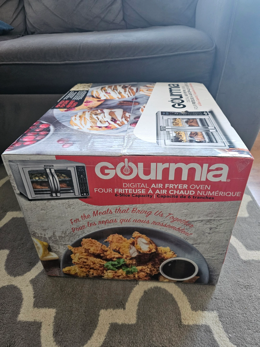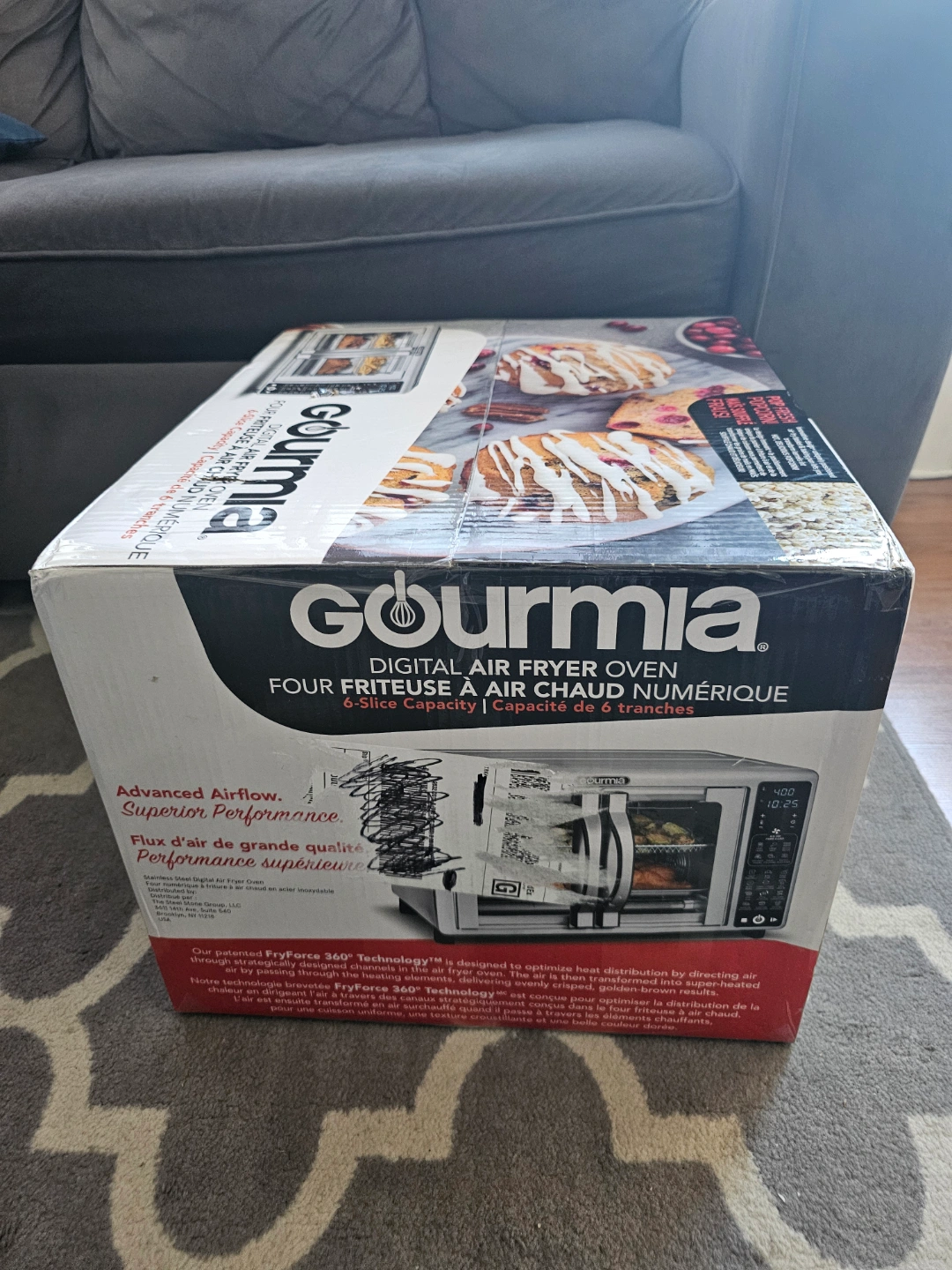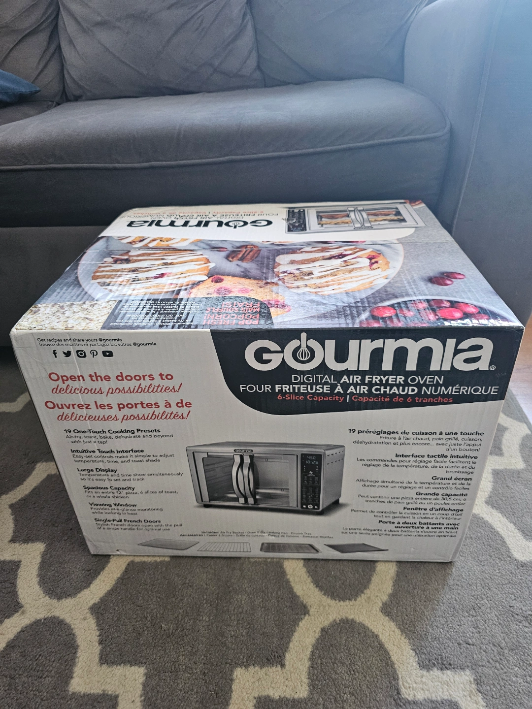 BNIB Cooks food quickly and evenly with little to no oil French doors open with a single-handle pull 19 One-Touch Cooking Presets include Air Fry, Toast, Slow Cook, Dehydrate, etc. Dehydrate function transforms fruits and vegetables into healthy dried snacks Intuitive touchscreen makes it simple and easy to adjust the temperature, time, and toast shade Large display shows you the temperature and time simultaneously so it’s easy to set and track Large viewing window enables you to monitor the food at a glance while locking in heat Fingerprint resistant stainless steel finish for a shiny exterior even after long usage Stainless steel design makes the air fryer aesthetically pleasing, complementing any kitchen Includes an air fry basket, oven rack, baking pan, and crumb tray FINAL SALE Accepting cash only please