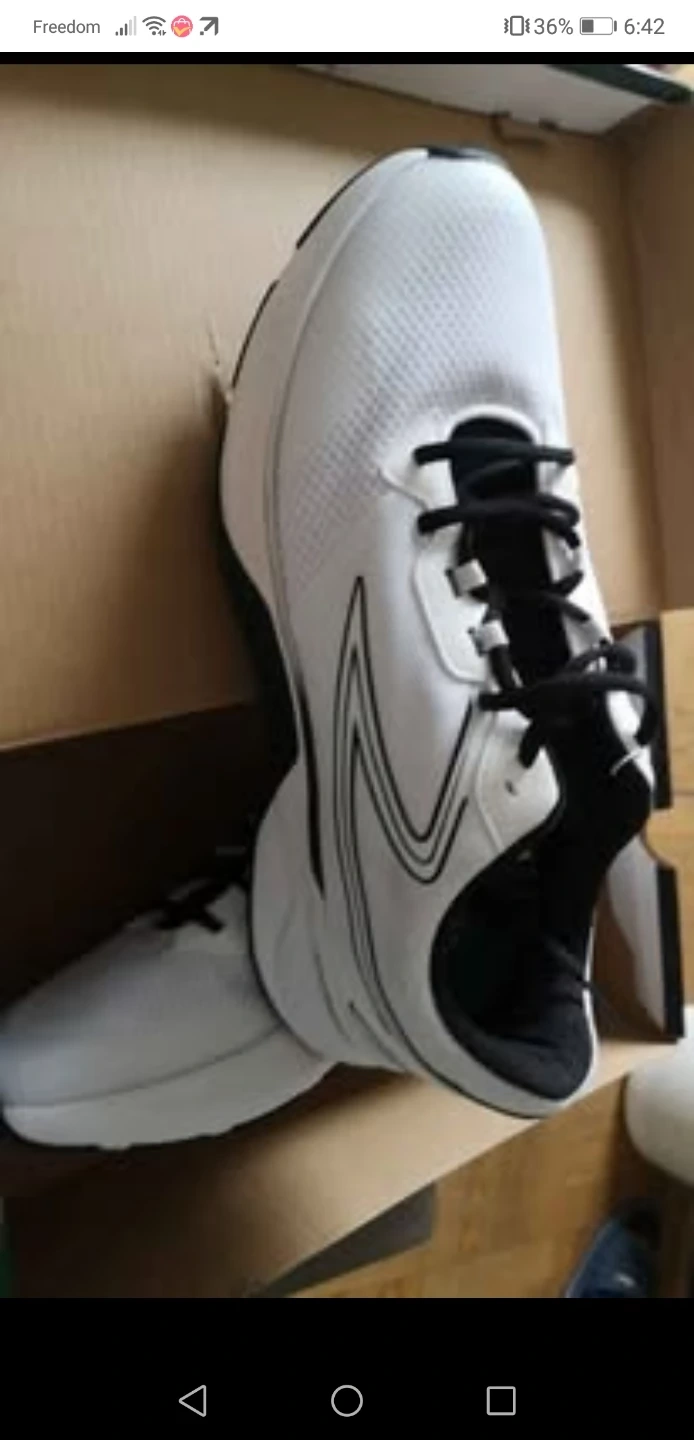 Pair of white running shoes with black accents. Lace-up closure. Lightweight design. Good for running or casual wear.