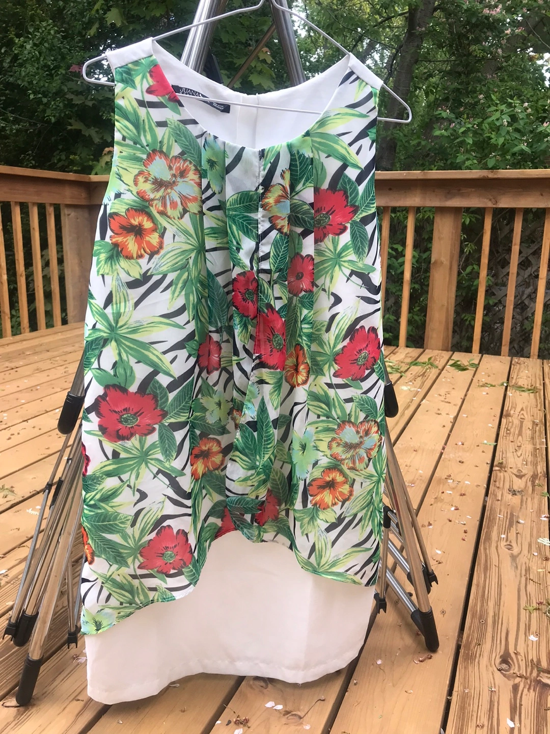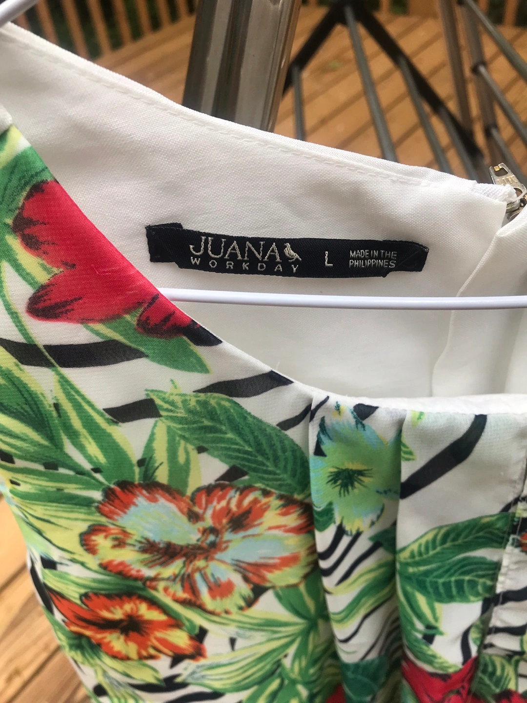 Beautiful sleeveless dress. White background with tropical print. Layered design. Size large. Made in the Philippines.