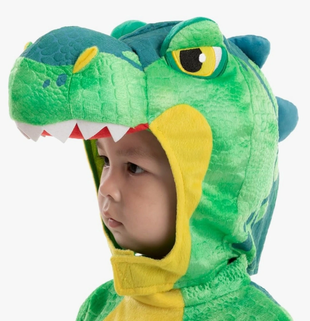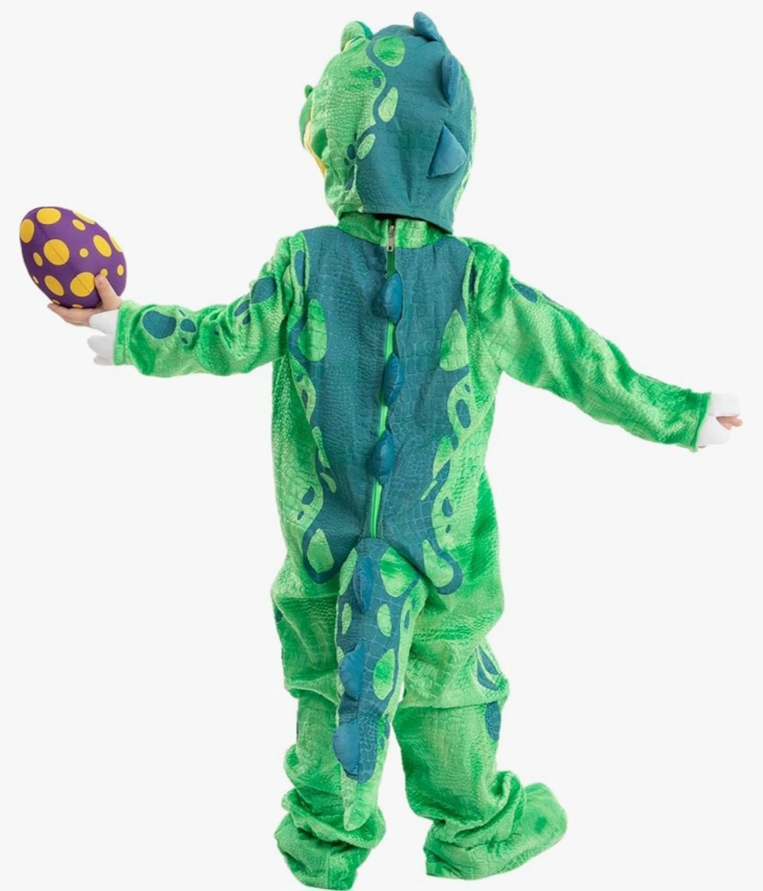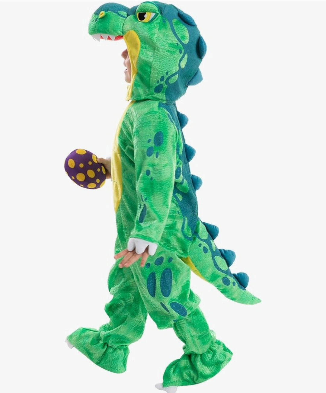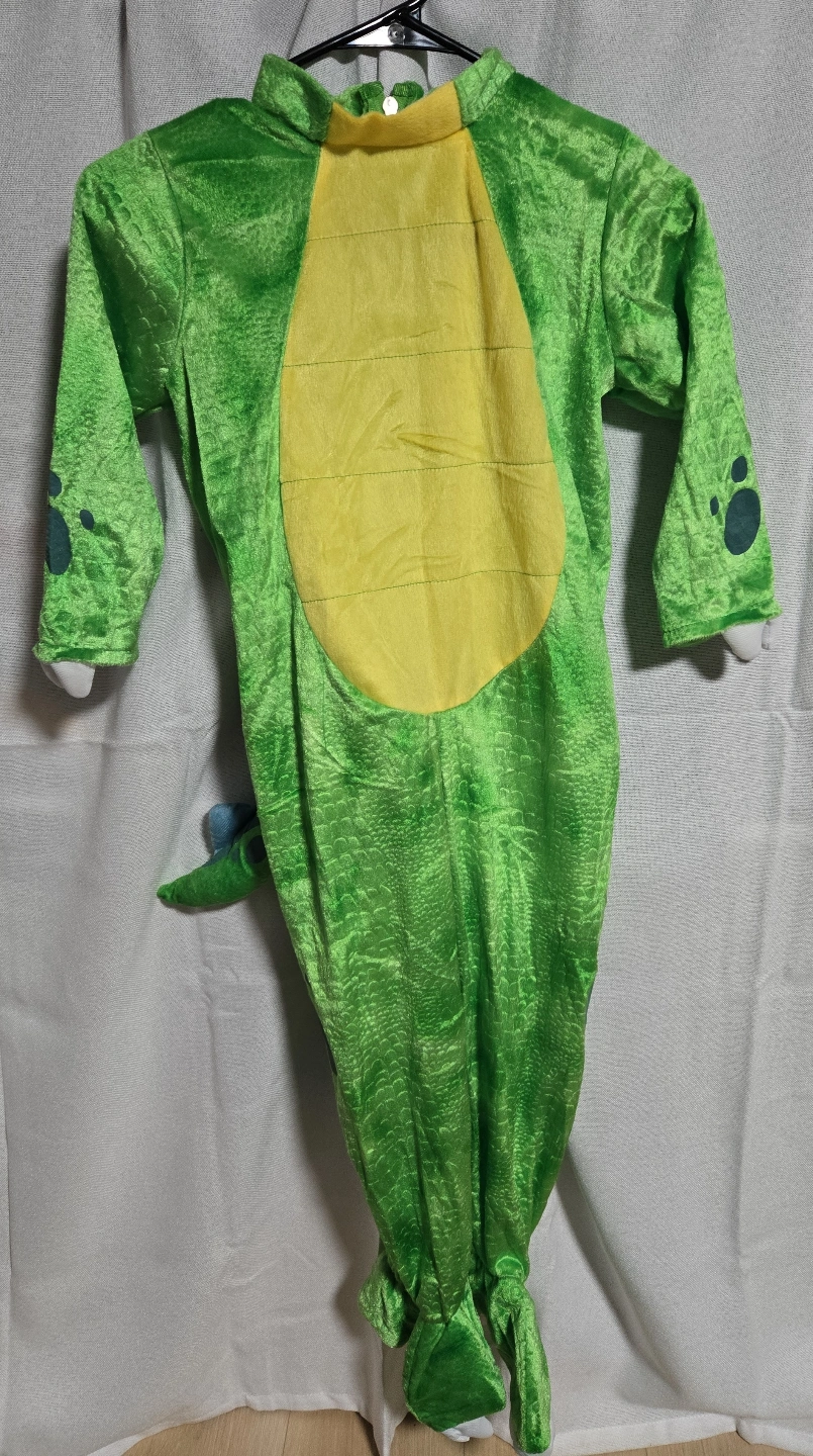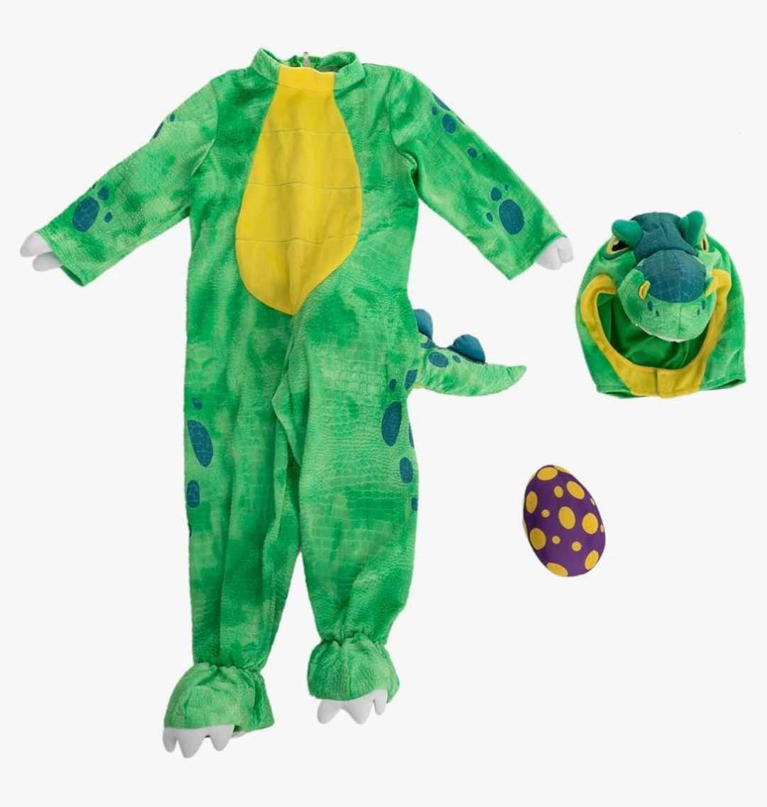 Green dinosaur costume. Includes matching egg. Soft material. Great for Halloween or playtime.
