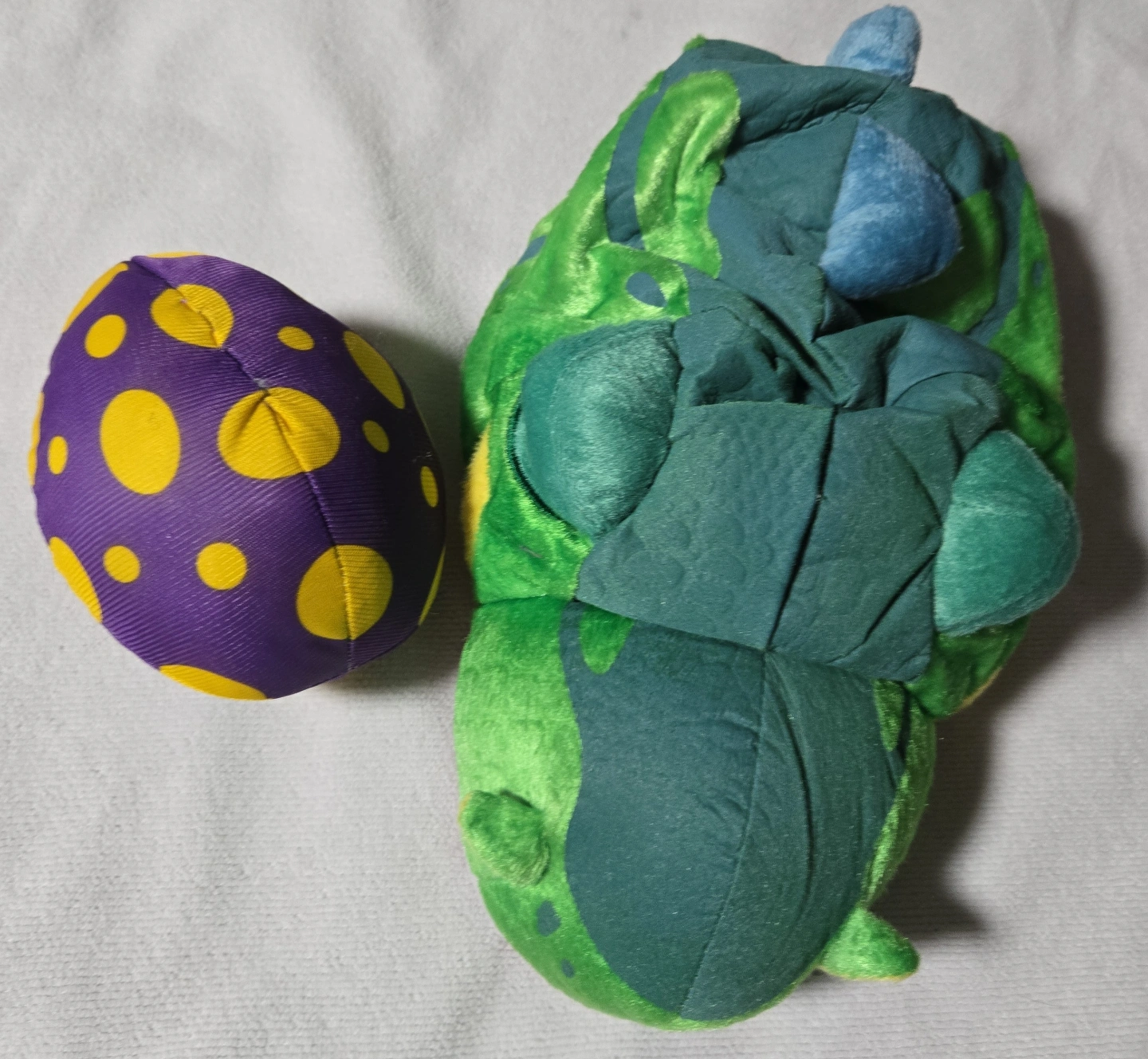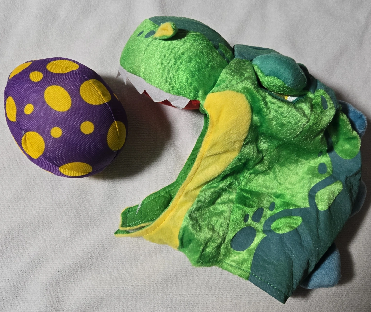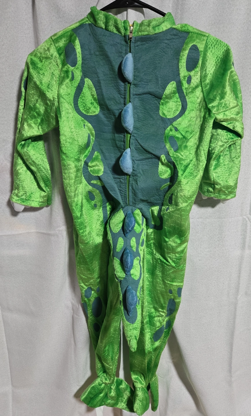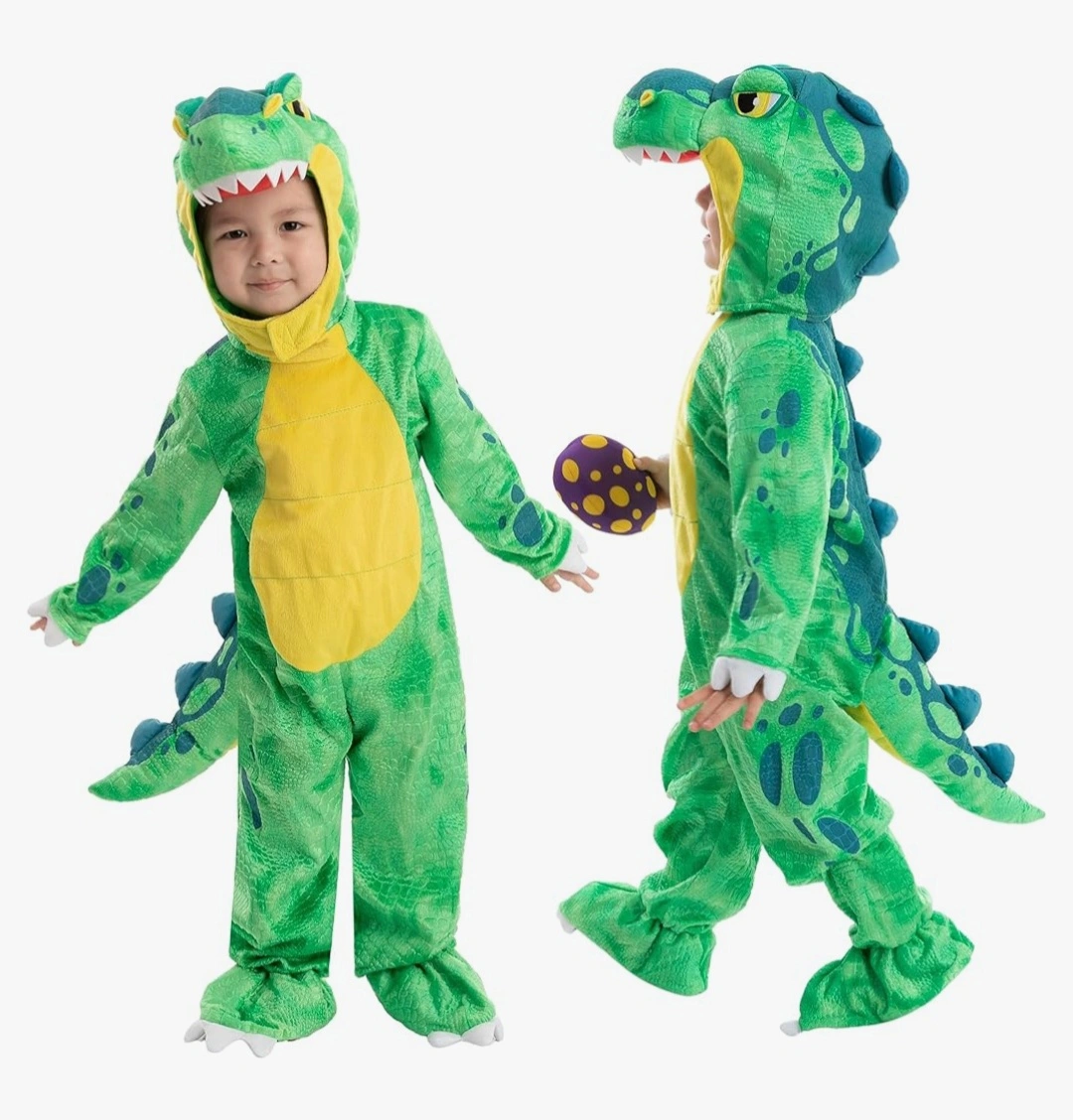 Green dinosaur costume. Includes matching egg. Soft material. Great for Halloween or playtime.