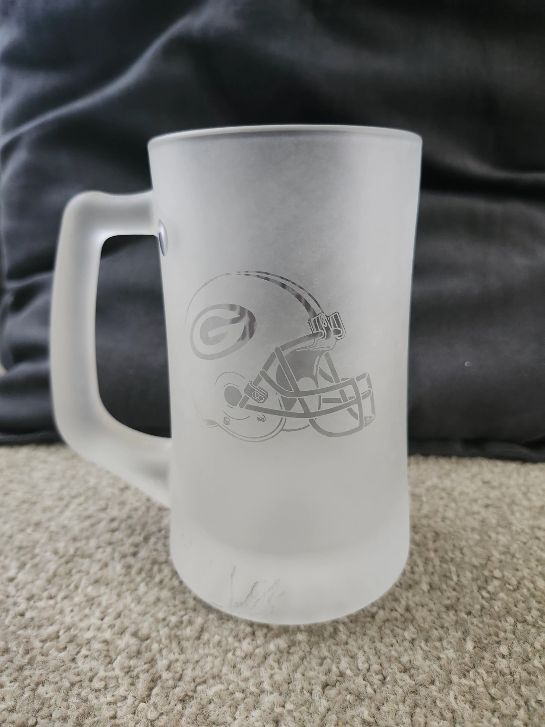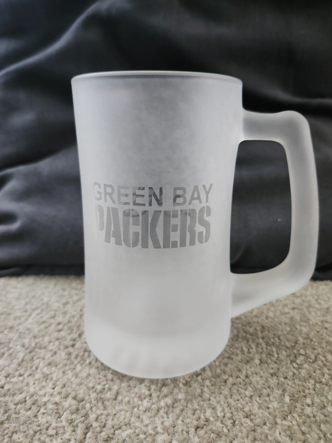 Frosted glass beer stein. Features Green Bay Packers logo and lettering. Great for Father's day