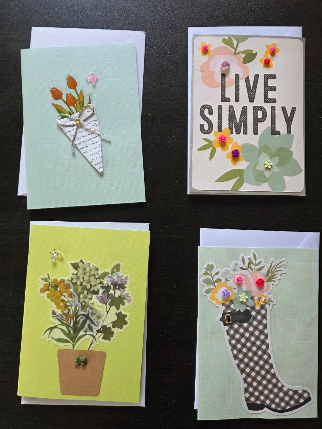 Set of four floral greeting cards. Floral designs, various colours and styles. With 3d flowers, butterflies, and bows. Perfect for any occasion. Includes envelopes. Price for each - $1.5 Price for all four - $5