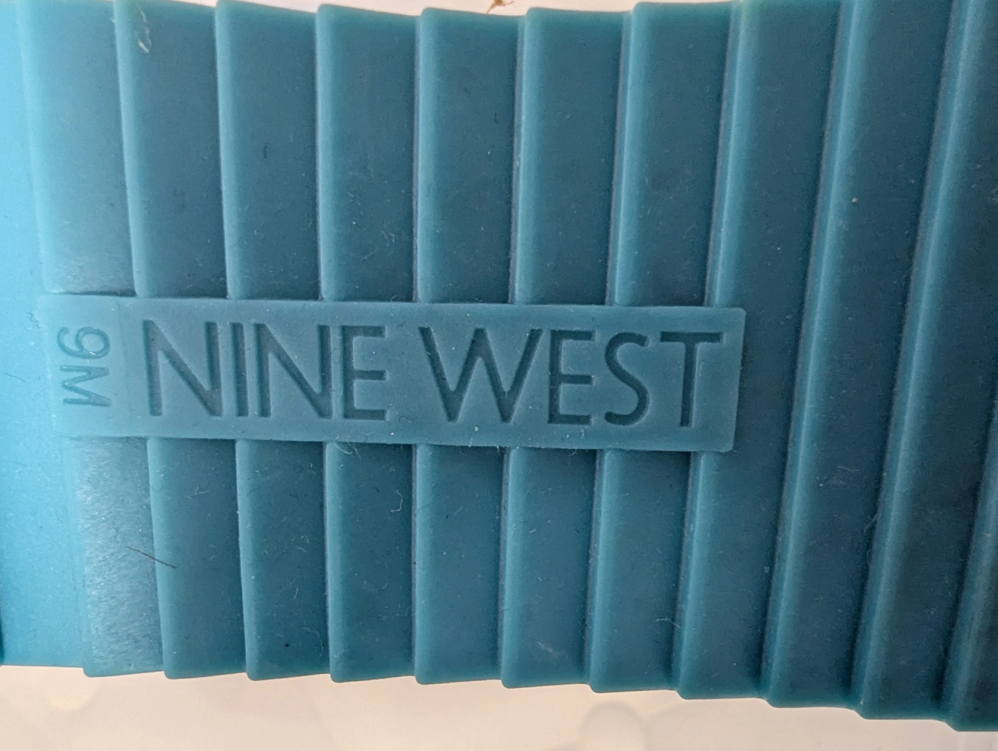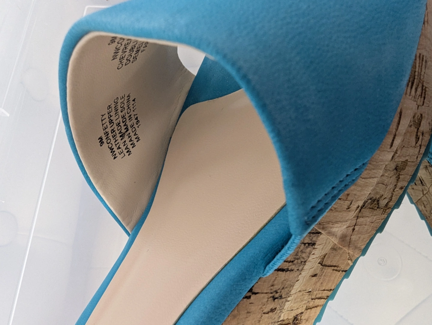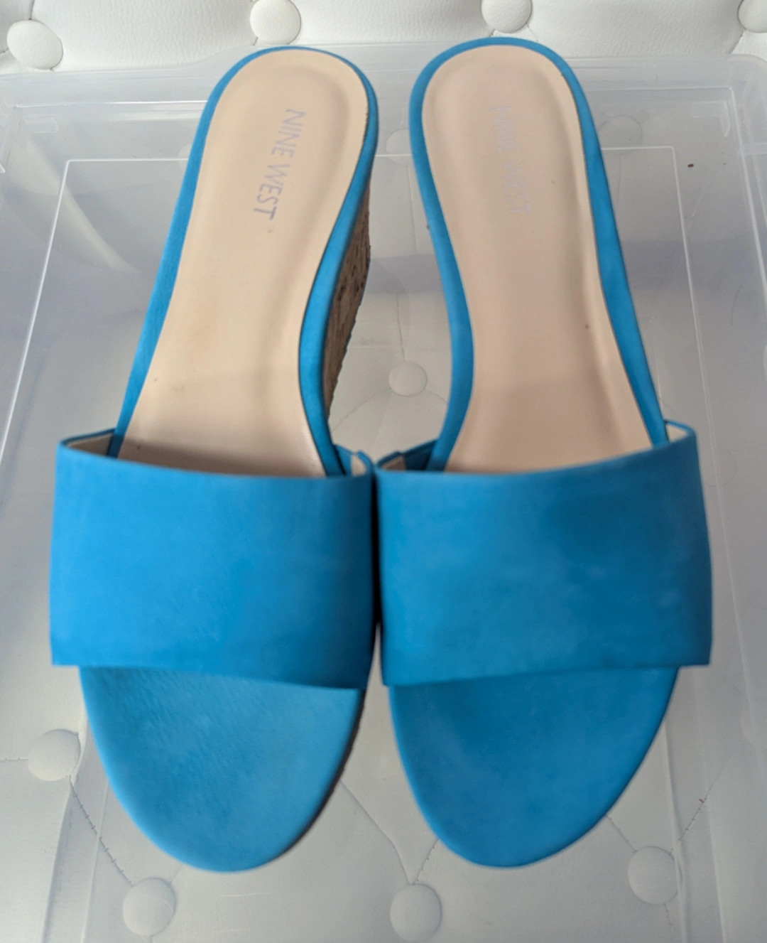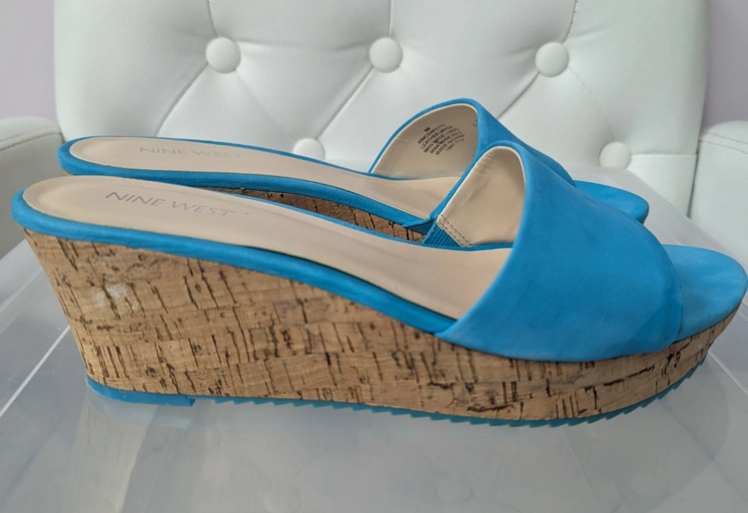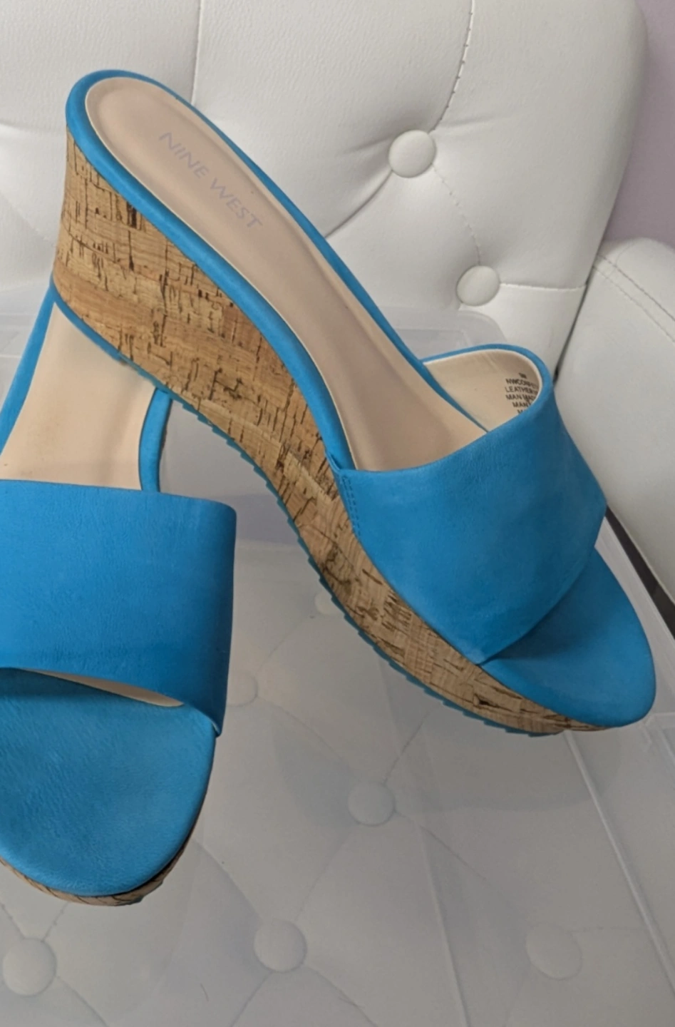 Women's Nine West blue wedge sandals. Size 9M. Cork wedge heel. Suede-like material. Open-toe, slip-on style. Pre-owned.