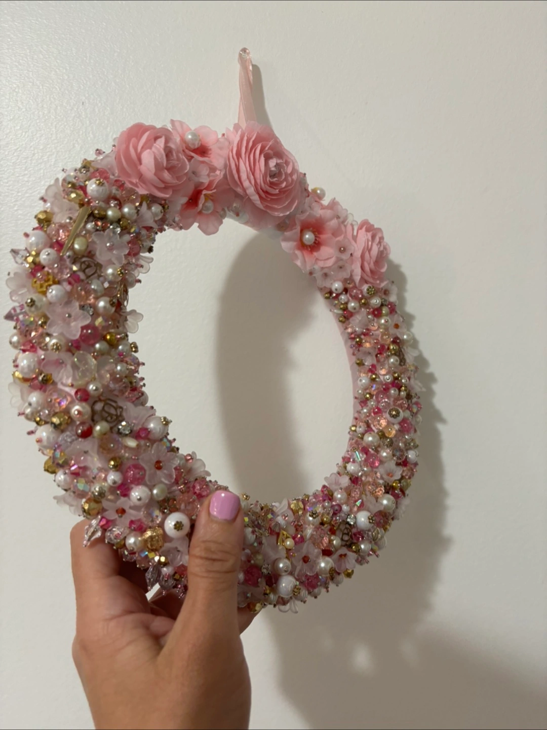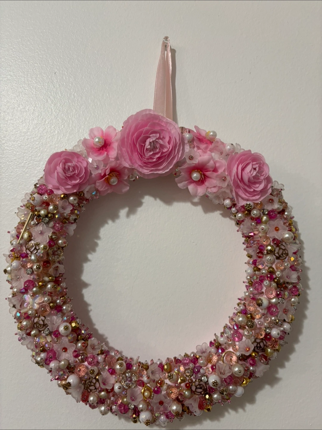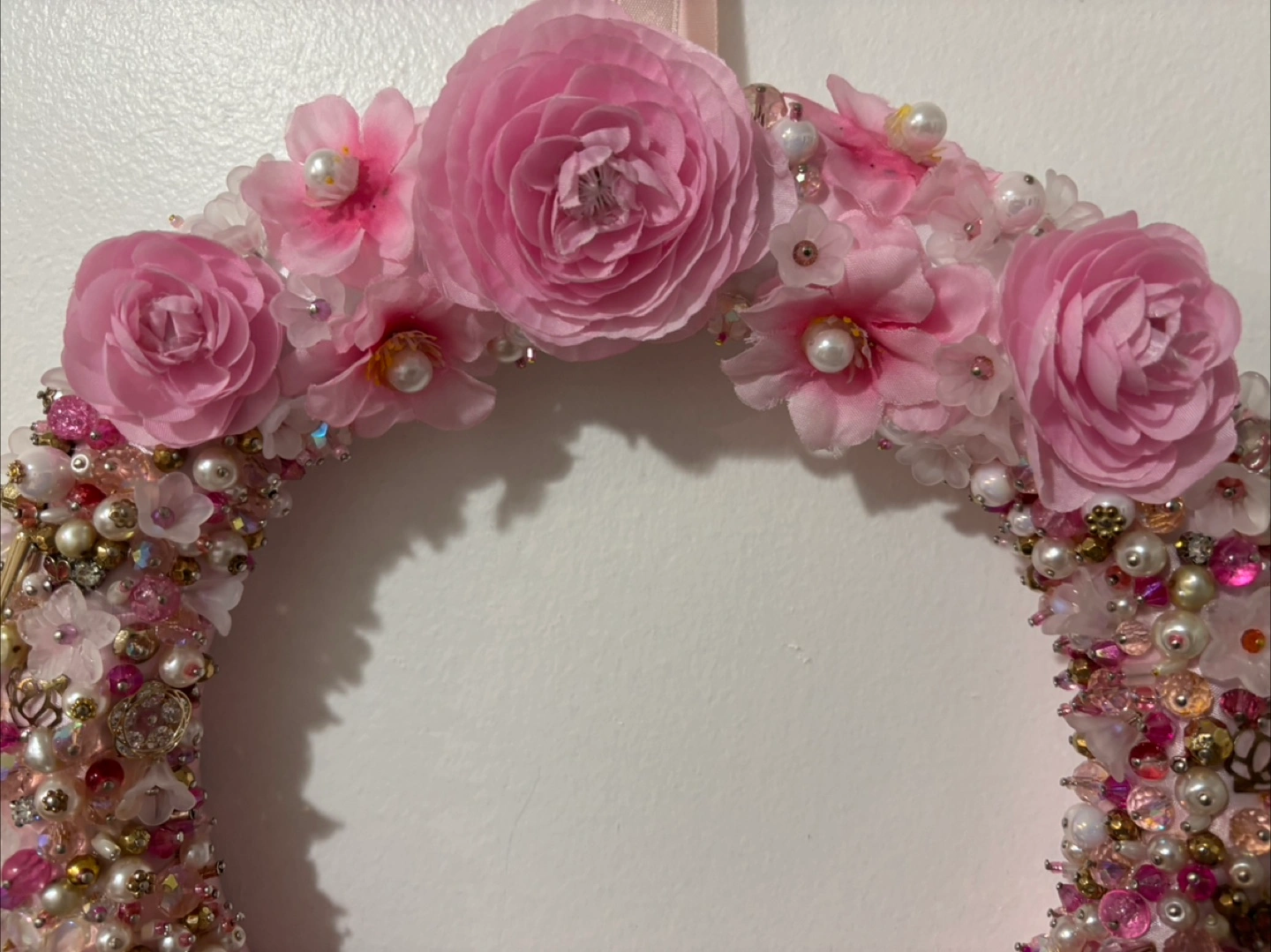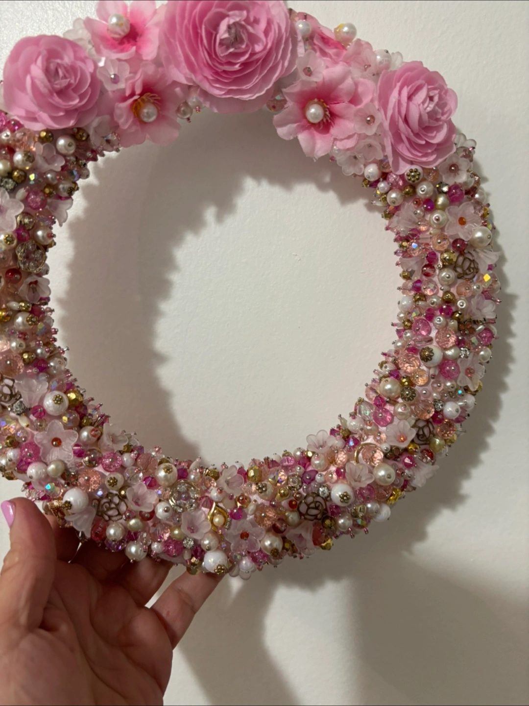 Beautiful handmade wreath. Pink, white and gold colour scheme. Features various beads, pearls, and fabric flowers. Perfect for adding a touch of elegance to your home decor. For Home decor, wedding , engagement, or baby nursing room or a gift Price firm , smoke free and pet free home pick up in Mississauga only with cash no holds
