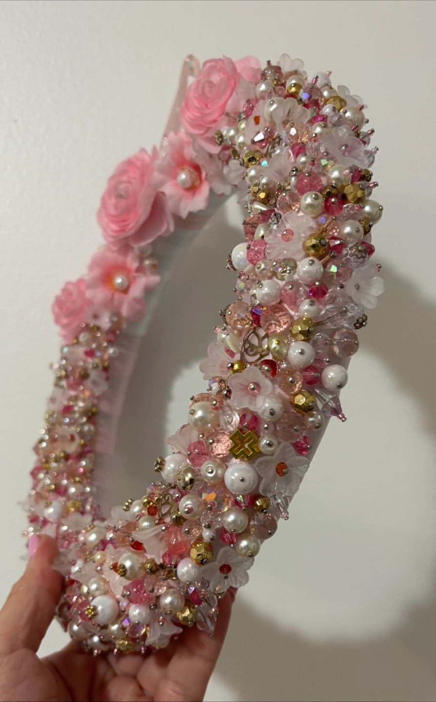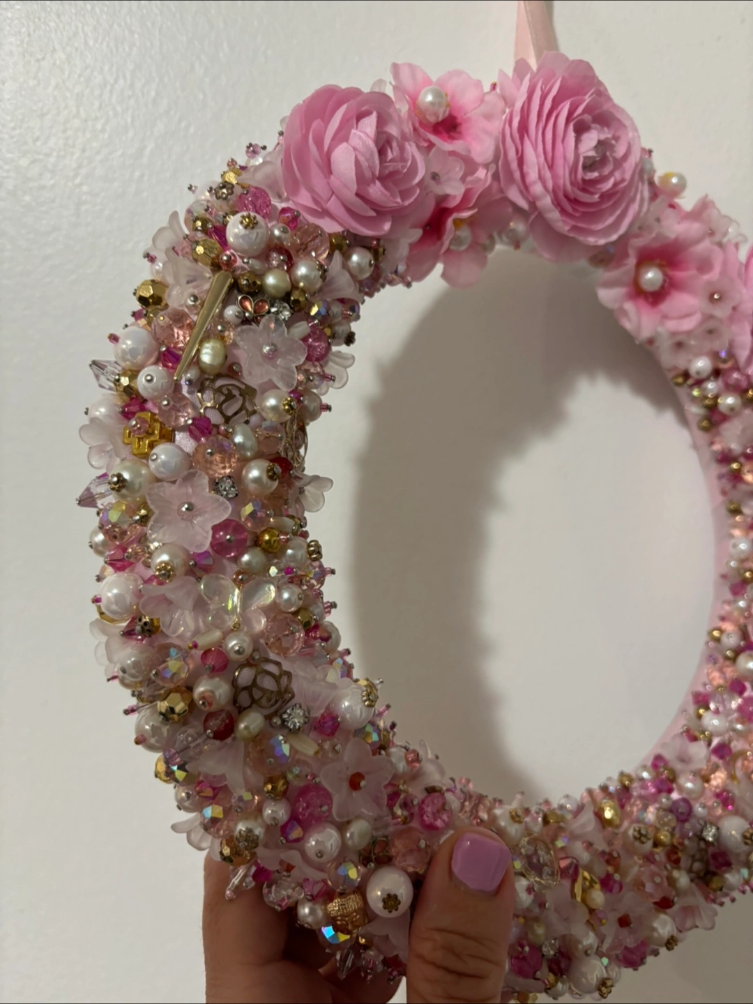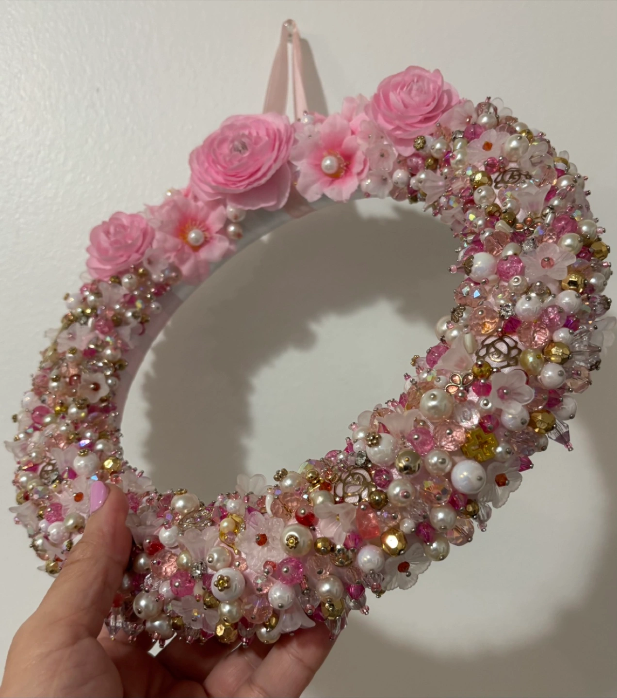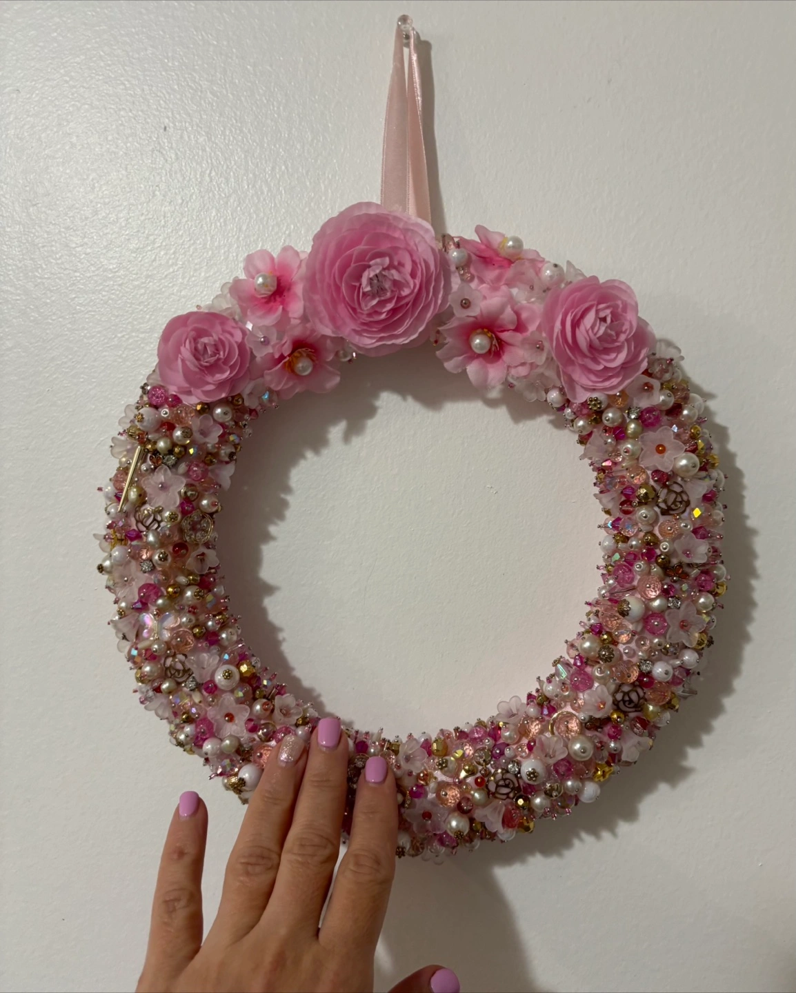 Beautiful handmade wreath. Pink, white and gold colour scheme. Features various beads, pearls, and fabric flowers. Perfect for adding a touch of elegance to your home decor. For Home decor, wedding , engagement, or baby nursing room or a gift Price firm , smoke free and pet free home pick up in Mississauga only with cash no holds