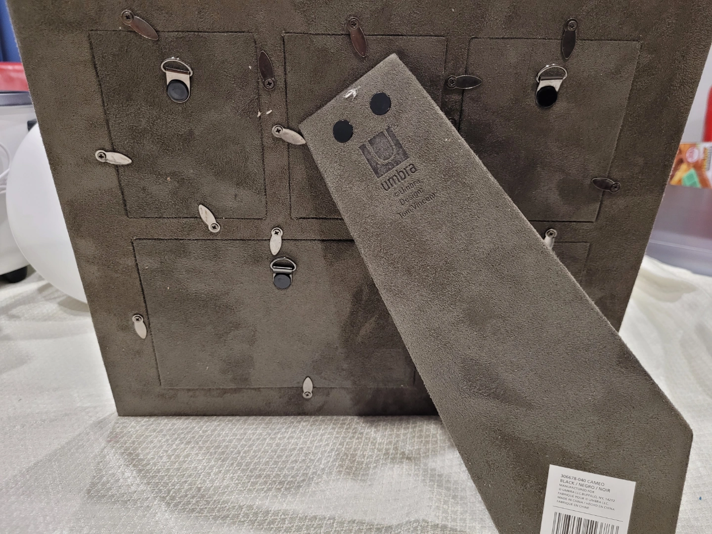 Black picture frame, holds five photos. Dark grey suede backing. Excellent condition.