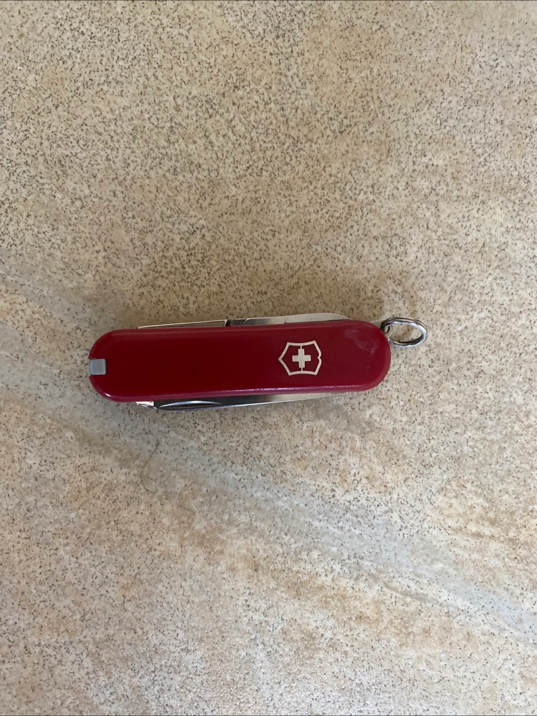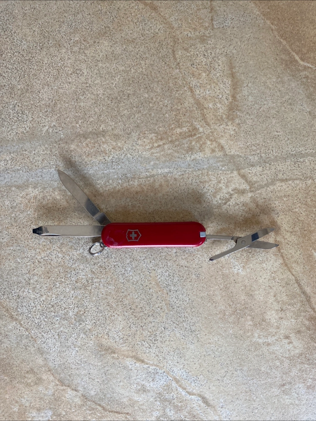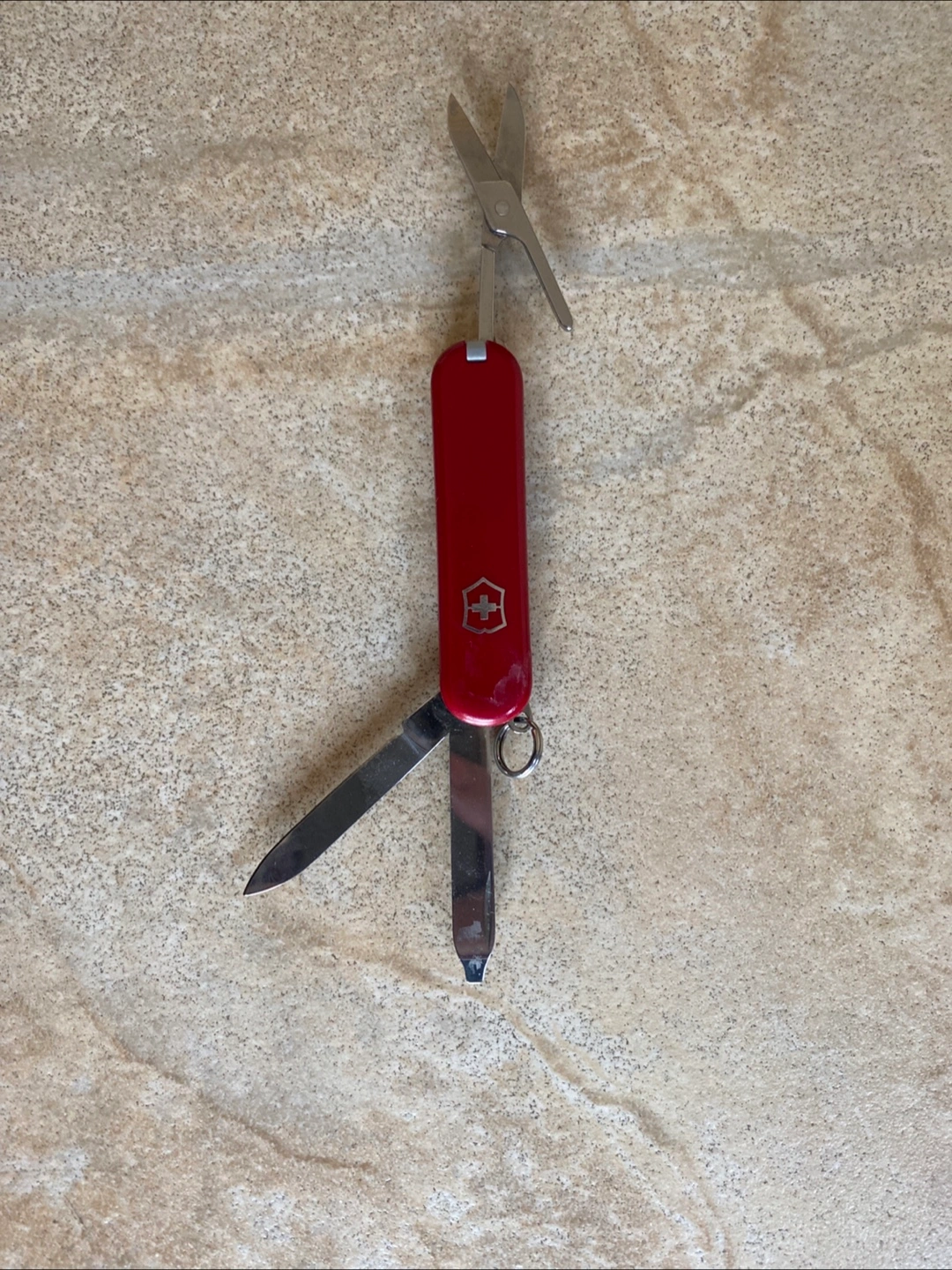 Classic SD model. Red handle. Small, lightweight, and portable. Includes scissors, blade, screwdriver, and tweezers.