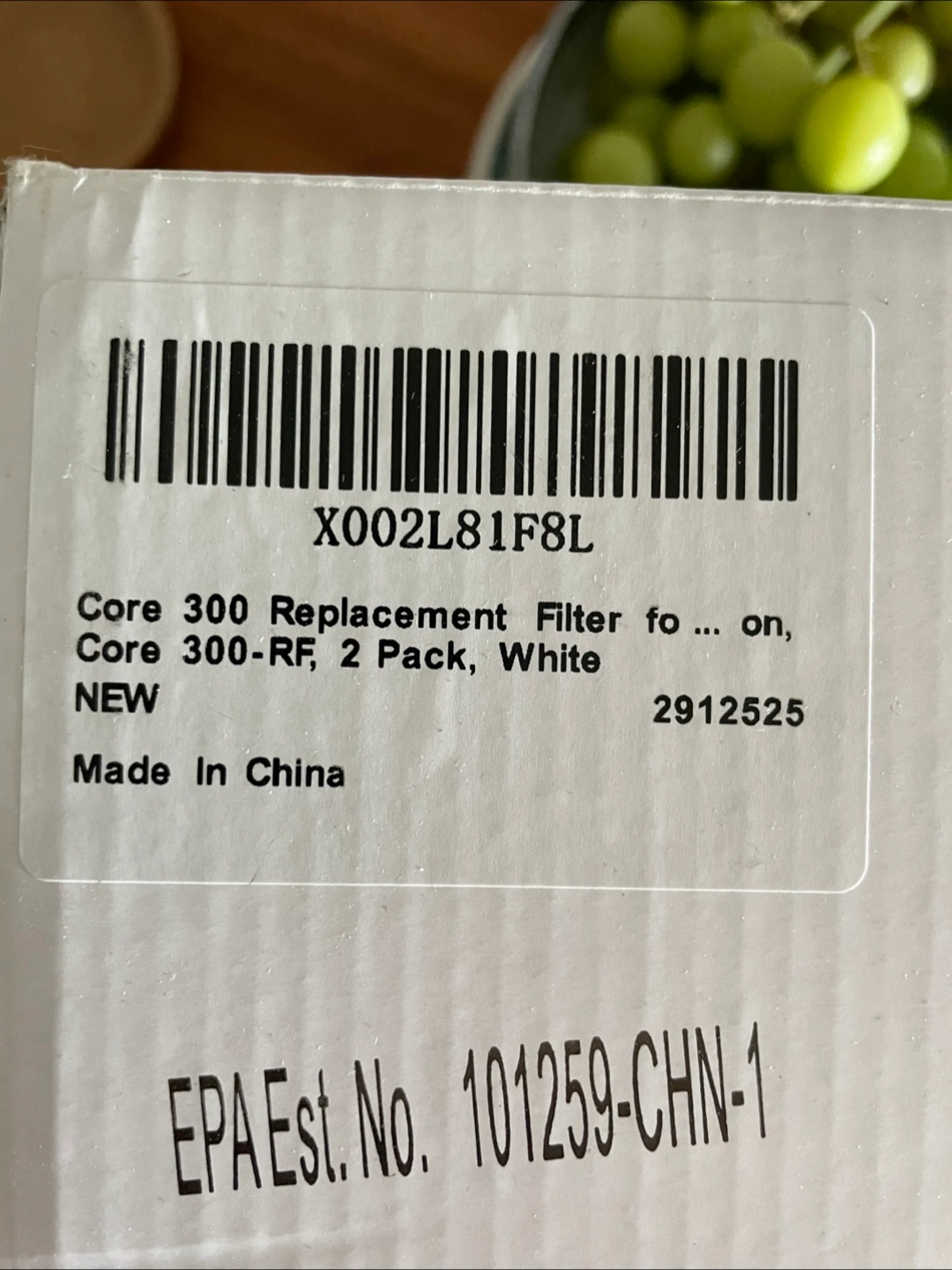 Brand new Core 300 replacement filter, two pack. White. Made in China. EPA Est. No. 101259-CHN-1 Bought these for my air filter they didn’t fit. They are 7 1/2 inches wide by five and three-quarter inch tall. Brand new never used. Free for pick ups
