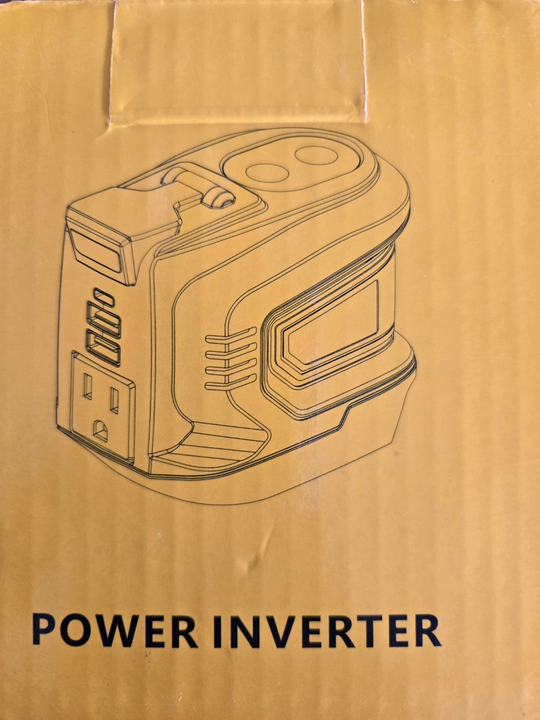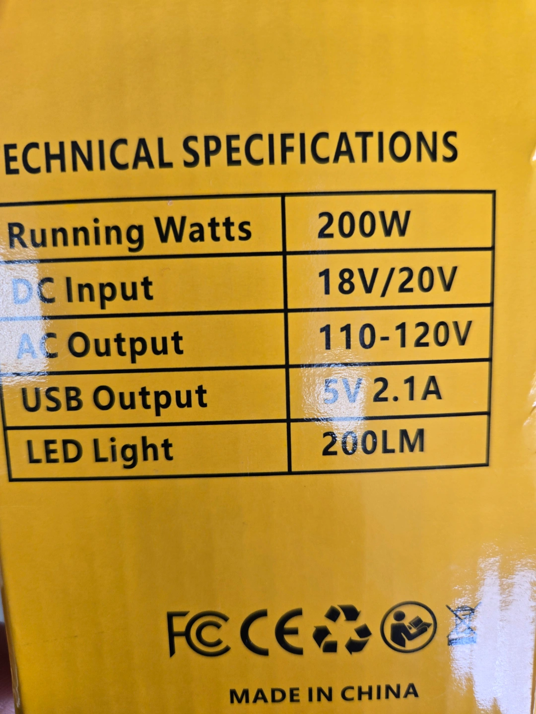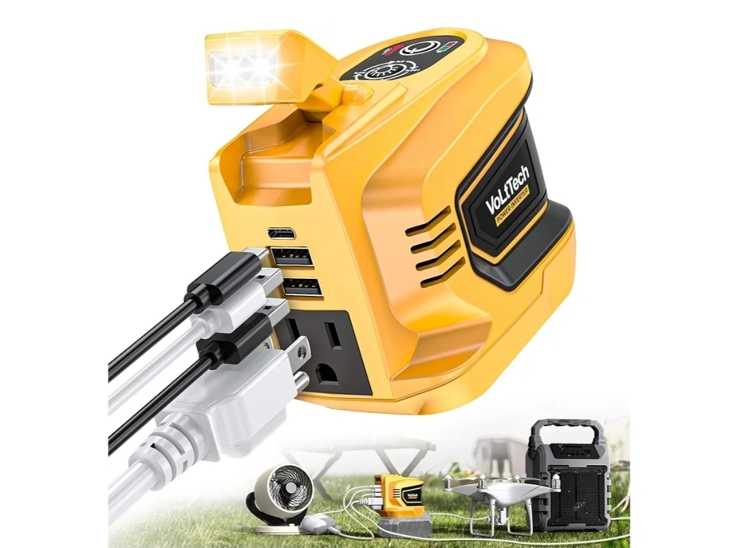 Portable power inverter. Features multiple USB ports and an AC outlet. Includes a built-in LED light. Perfect for camping or emergencies. 200W running watts. 18V/20V DC input. 110-120V AC output. 5V 2.1A USB output.