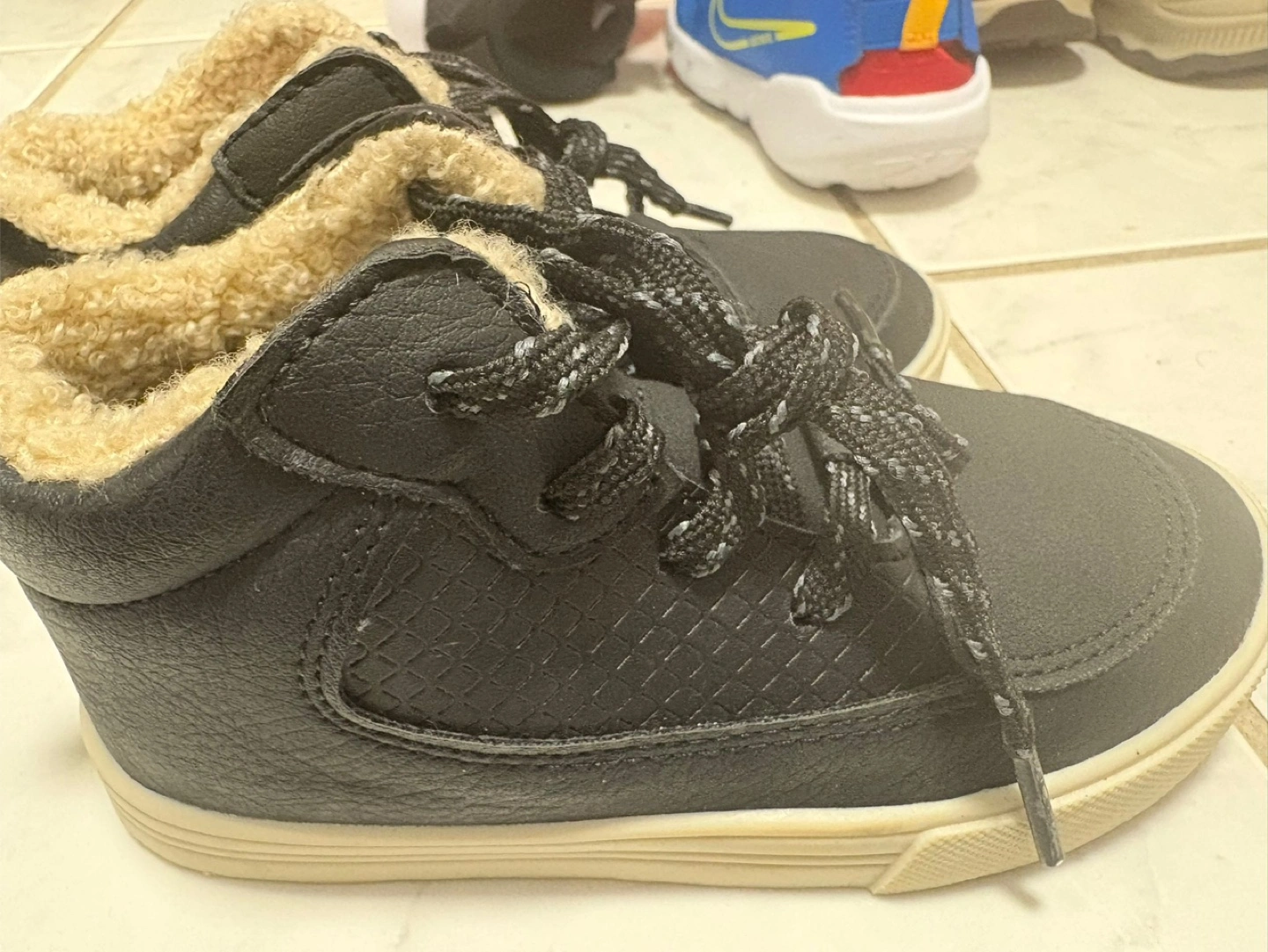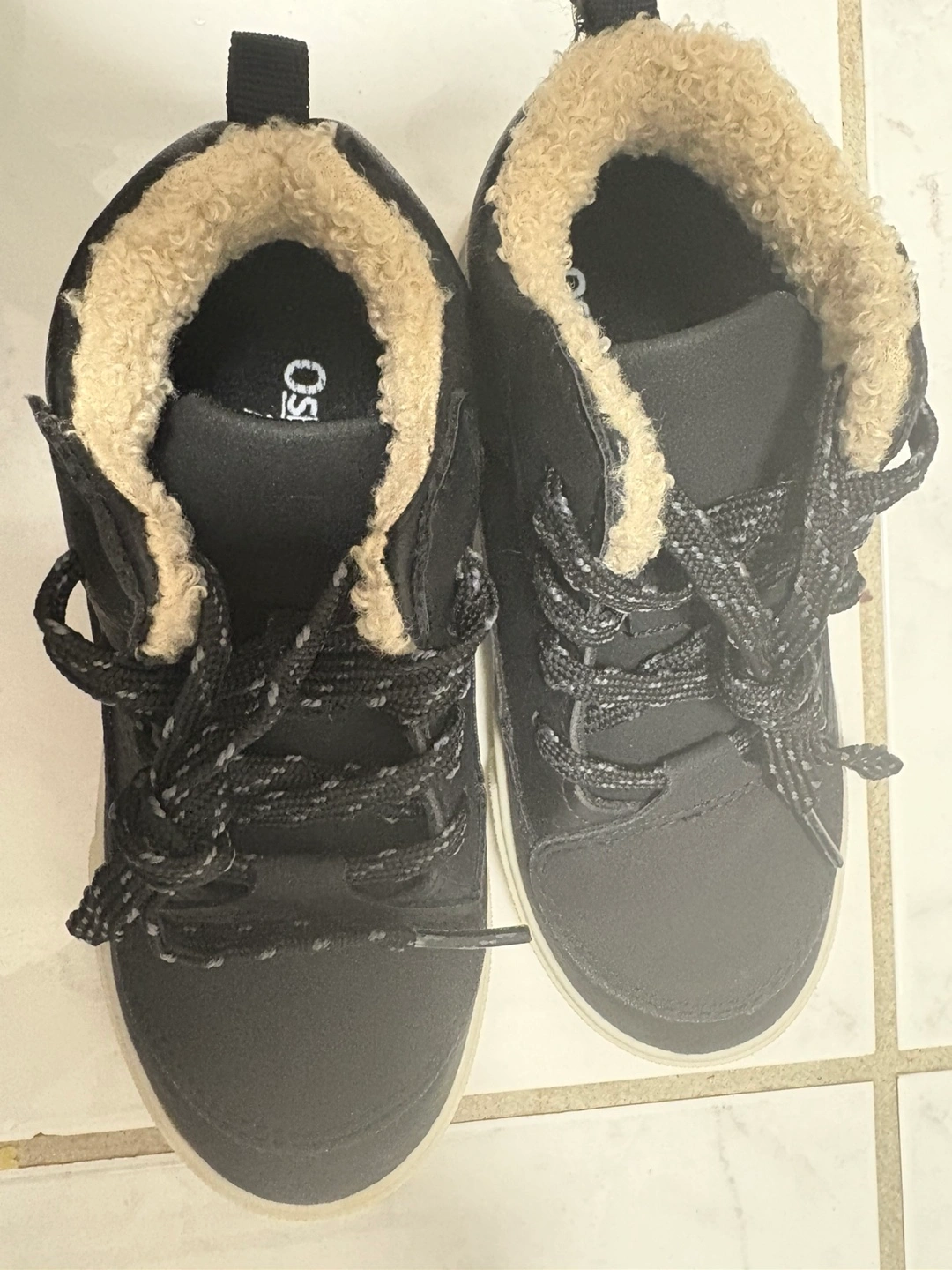 Cute black high-top boots. Faux-leather upper. Warm sherpa lining. Lace-up closure. Cream-coloured sole. Size 10.