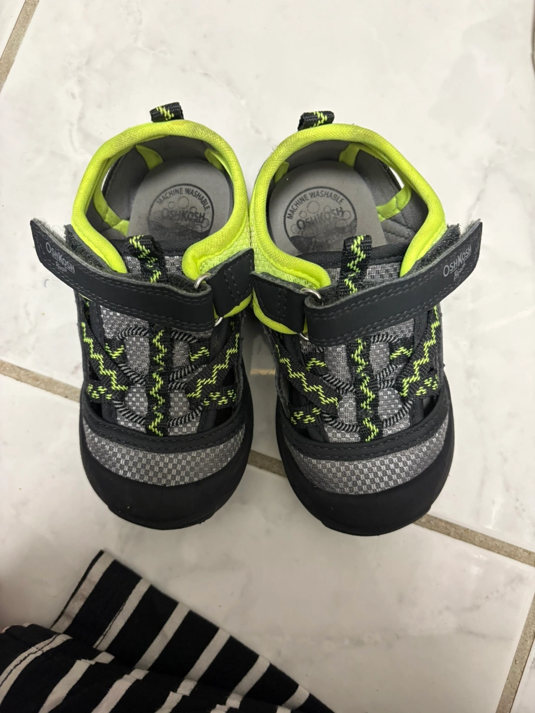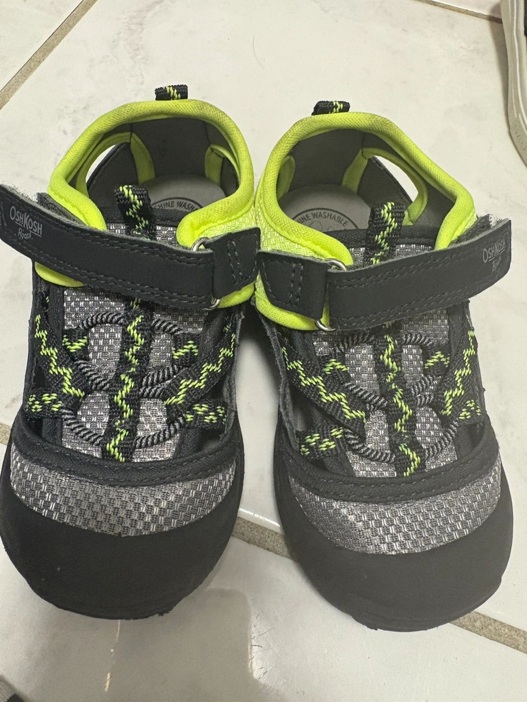 Cute baby sandals. Machine washable. Grey, black and lime green. Velcro closure. Good condition. Size 6 #Oshkosh