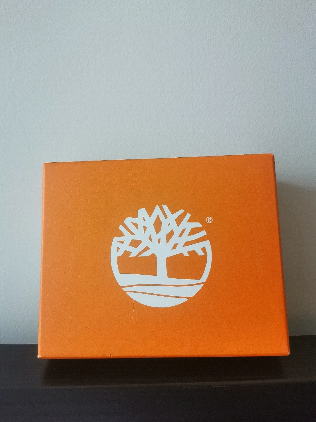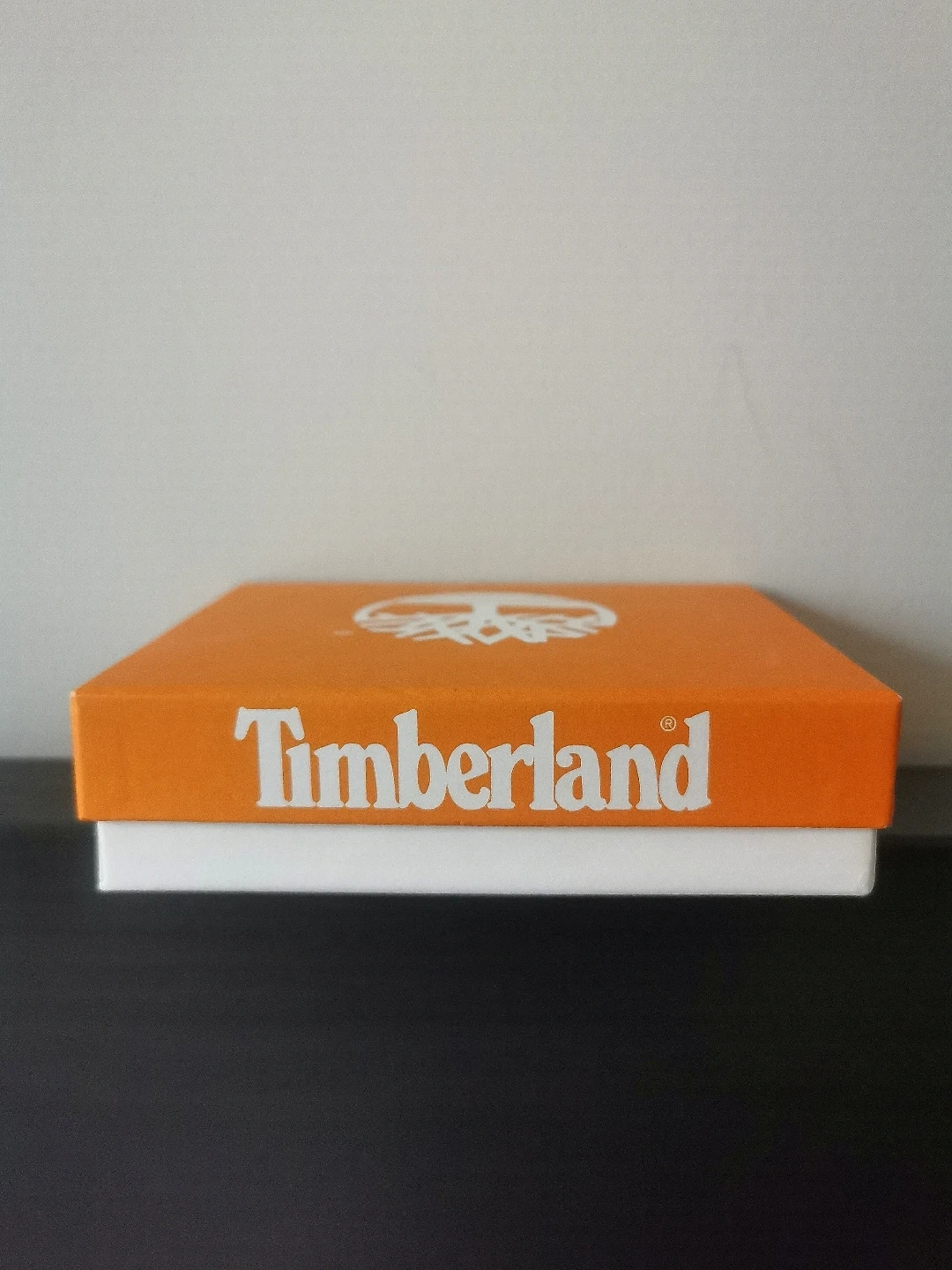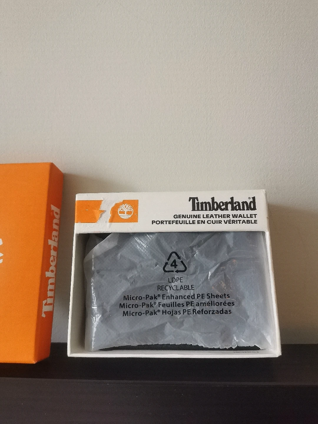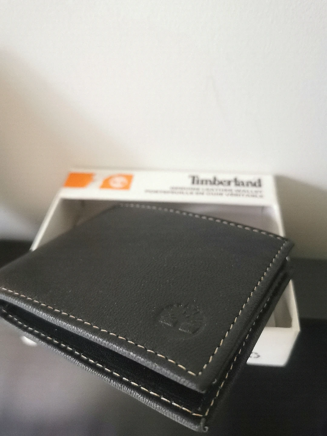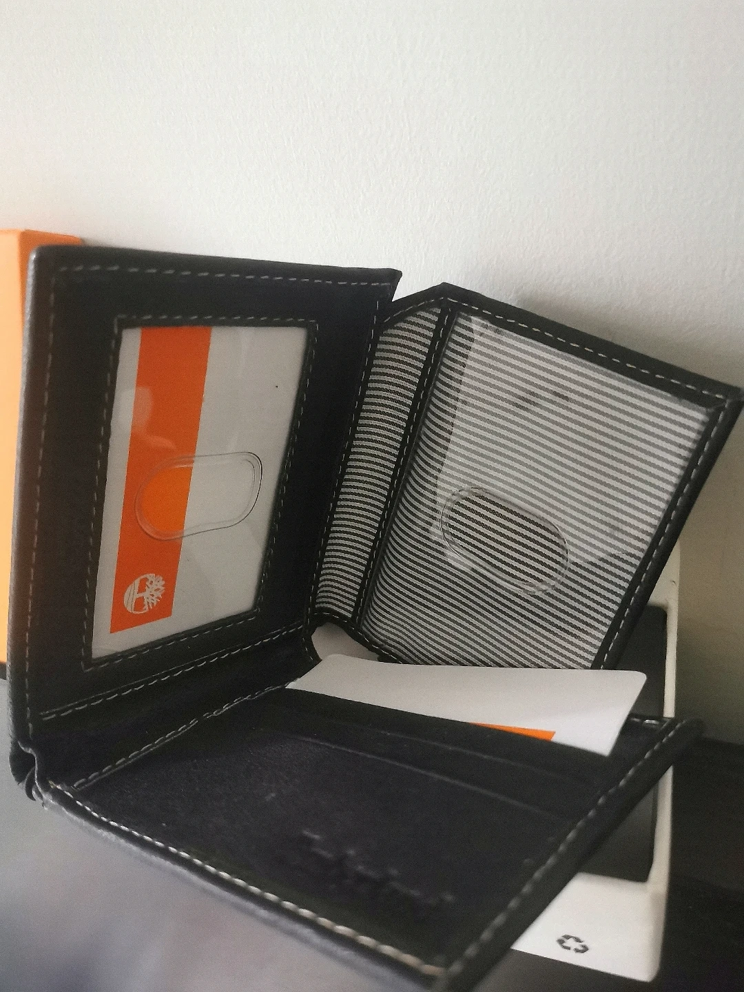 New Timberland genuine leather wallet. Black leather with contrasting stitching. Comes in original orange box. Multiple card slots and ID window.