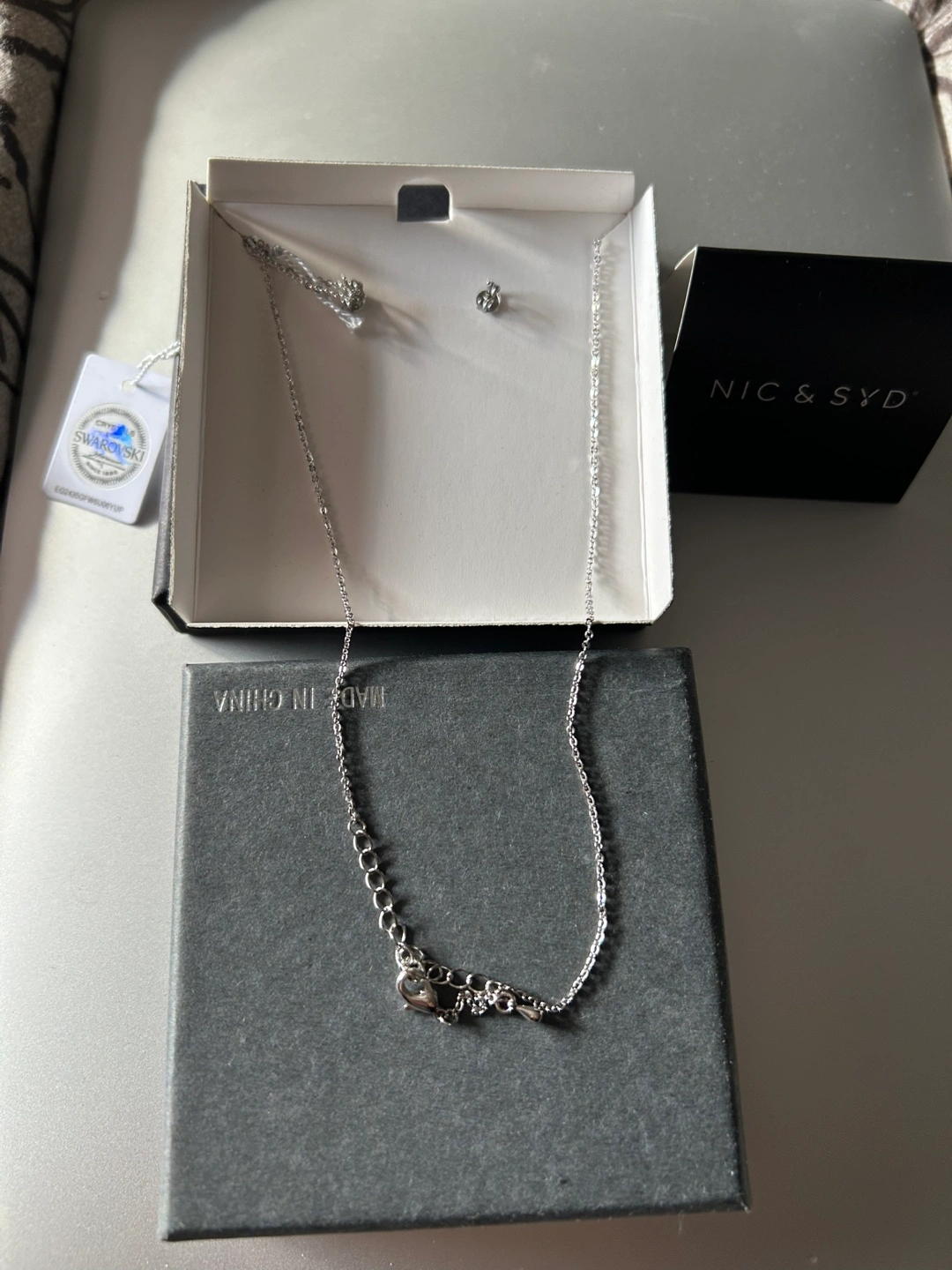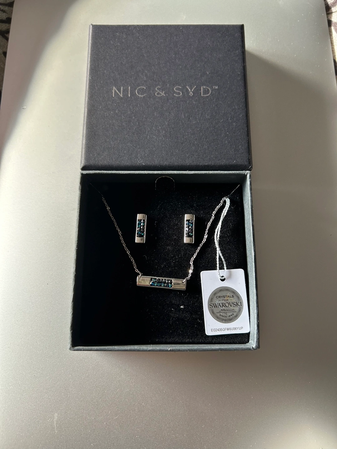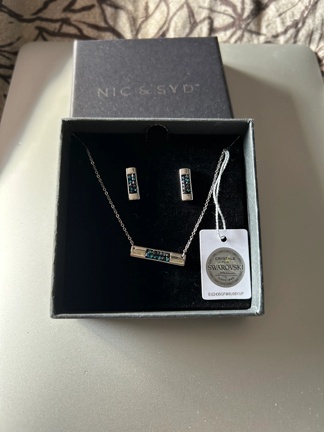 Stunning necklace and earring set. Features dark teal Swarovski crystals. Silver-toned metal. Comes in original box.