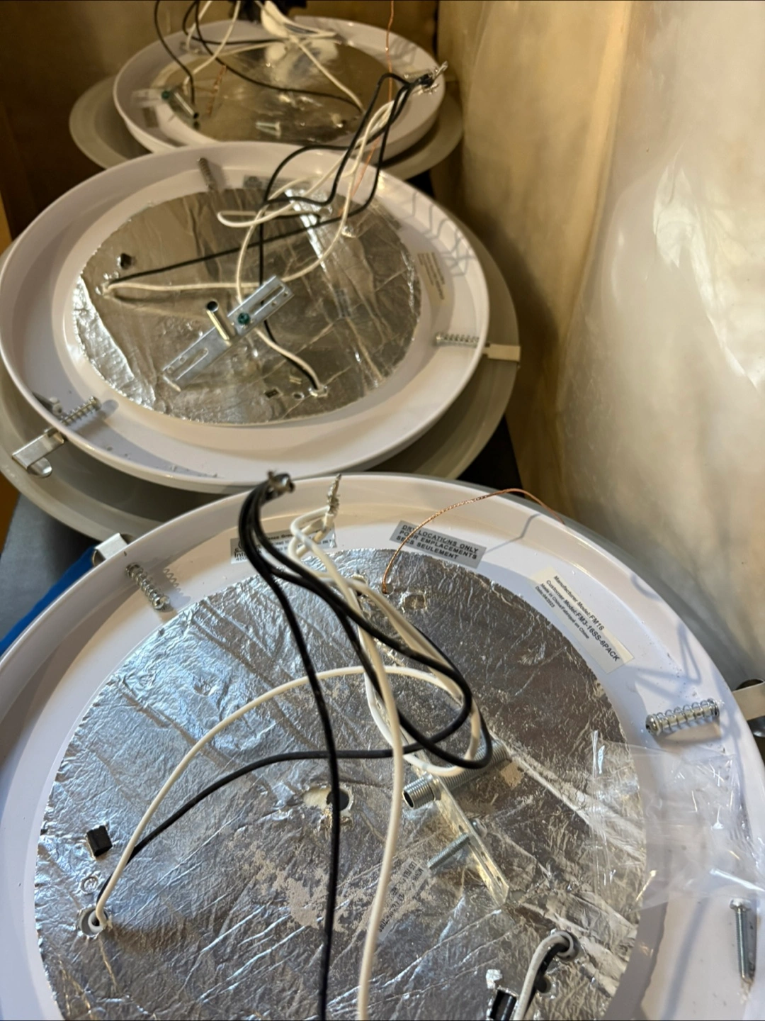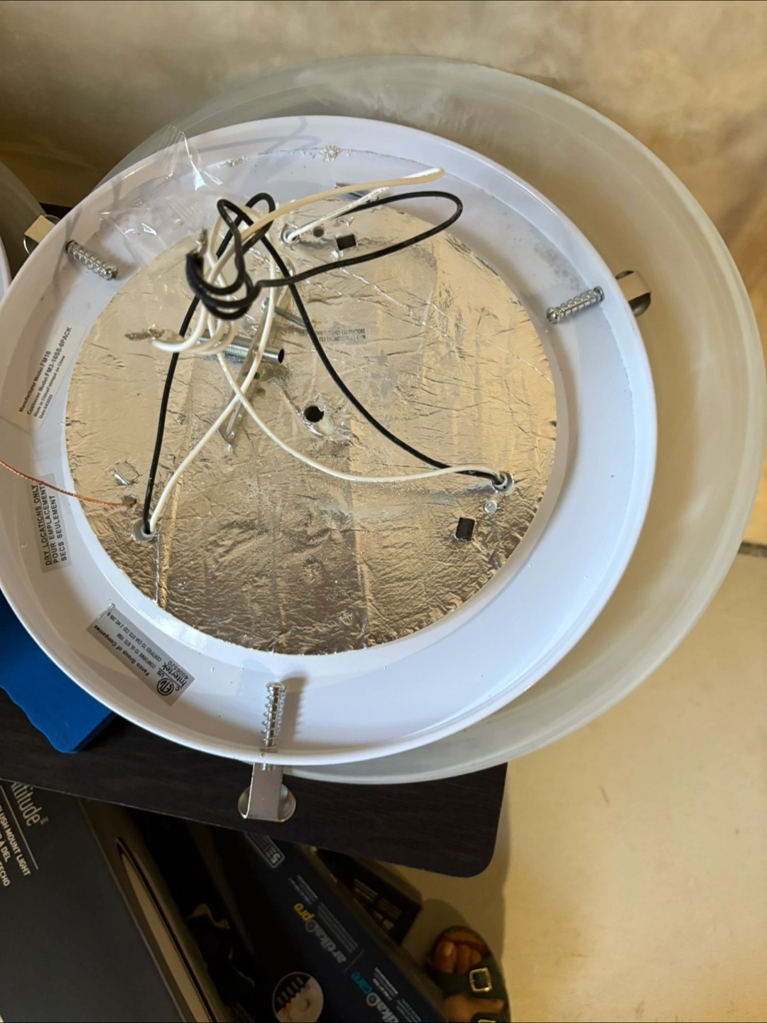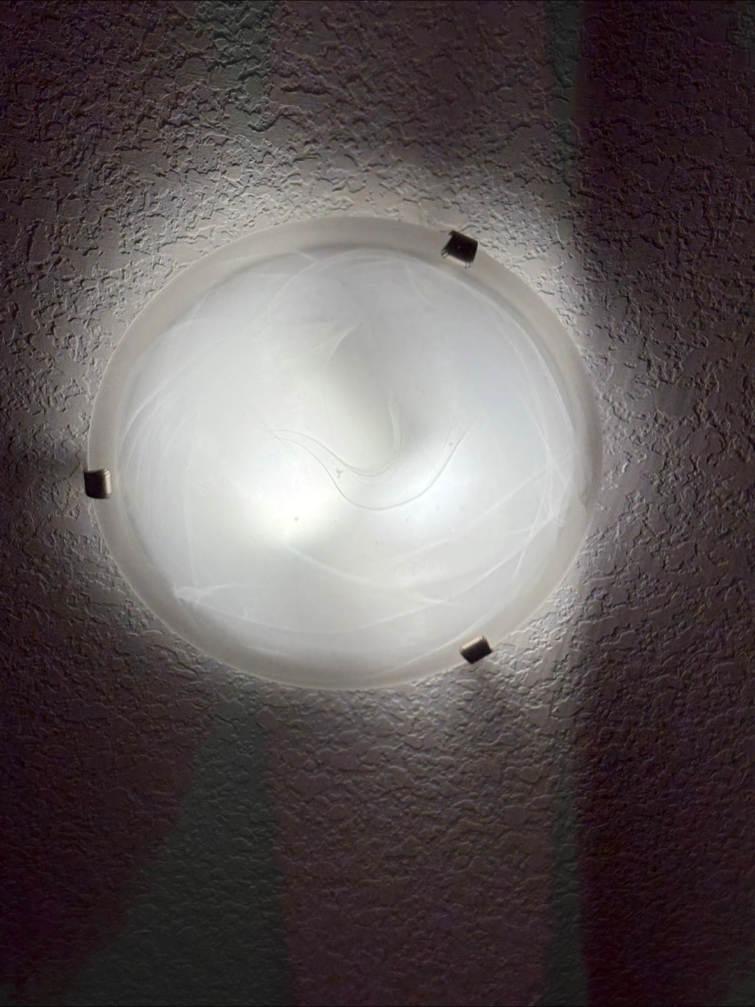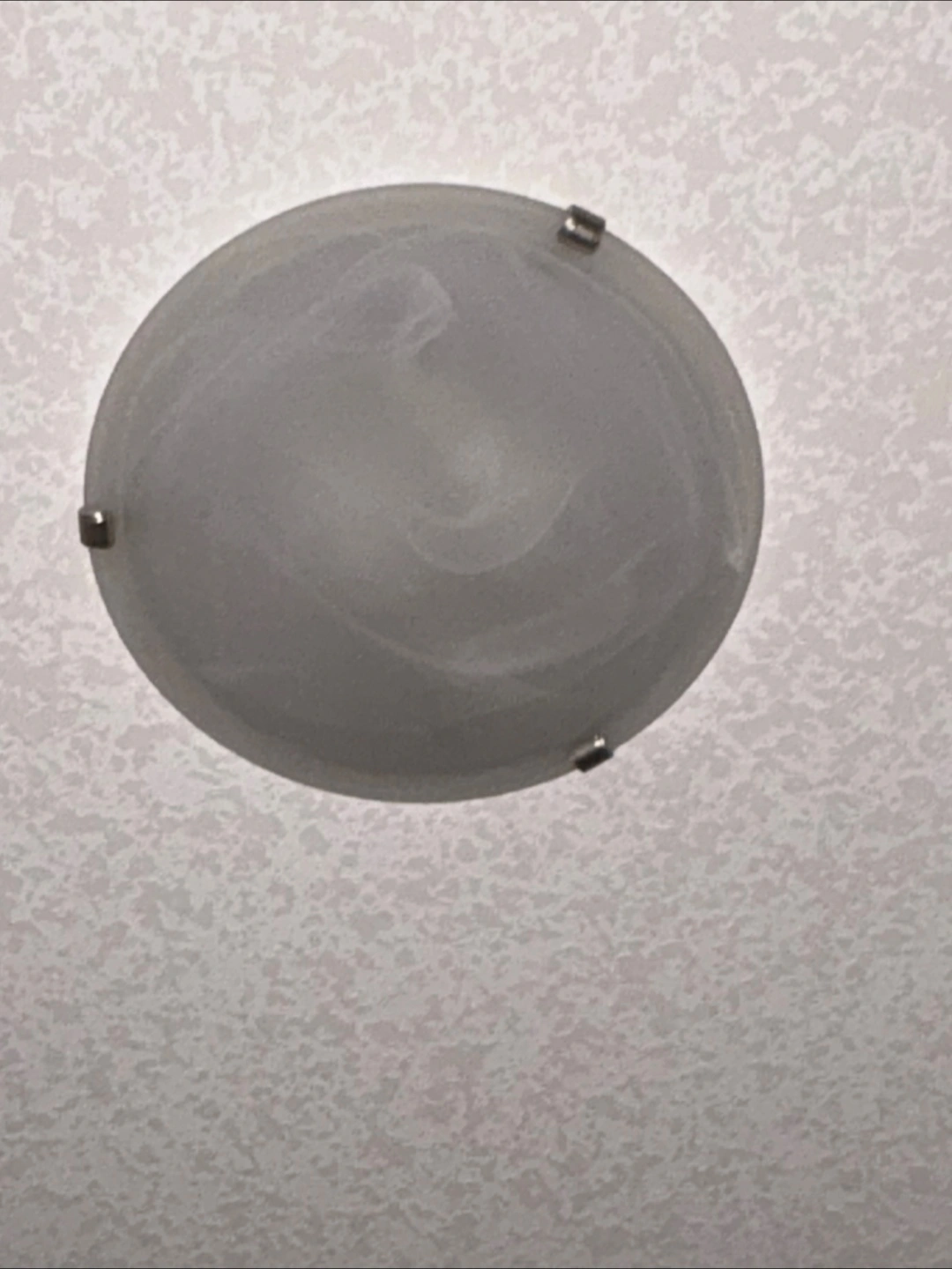 Round frosted glass shade. Simple design. For indoor use only. 3 lights, 27 watts each, 3 bulbs included in each