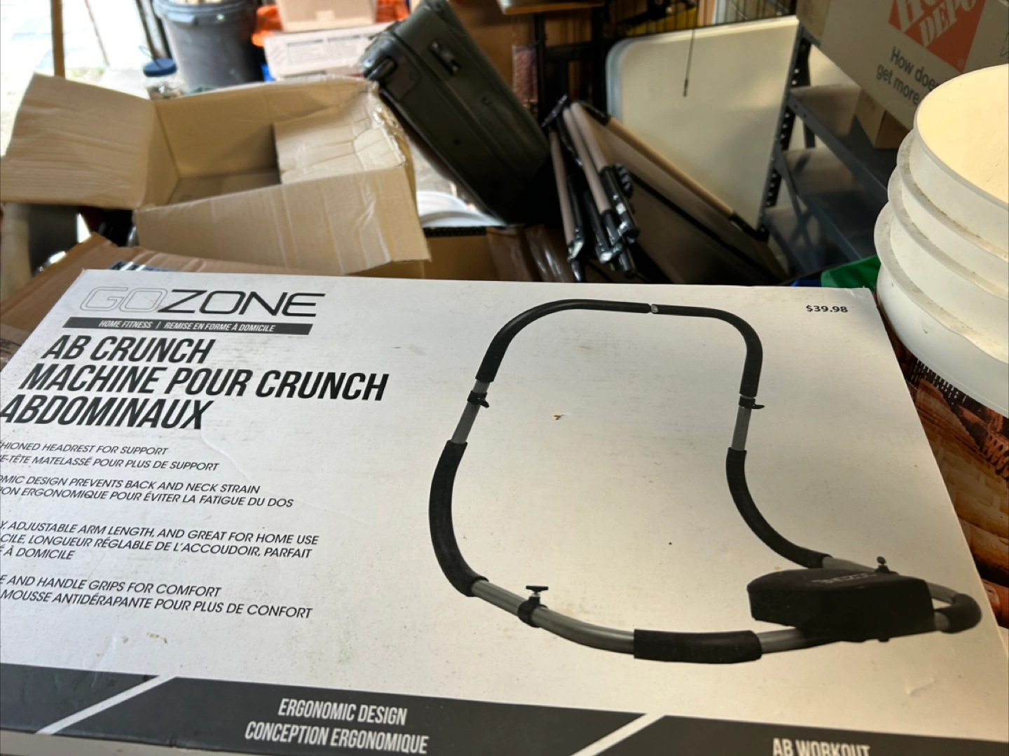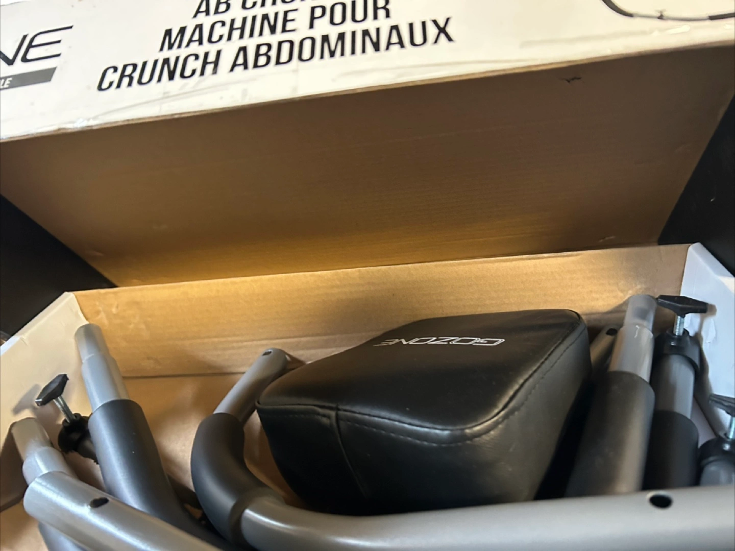 New in box ab crunch machine. Ergonomic design. Adjustable arm length. Great for home use. Includes cushioned headrest for support. Foam grips for comfort.
