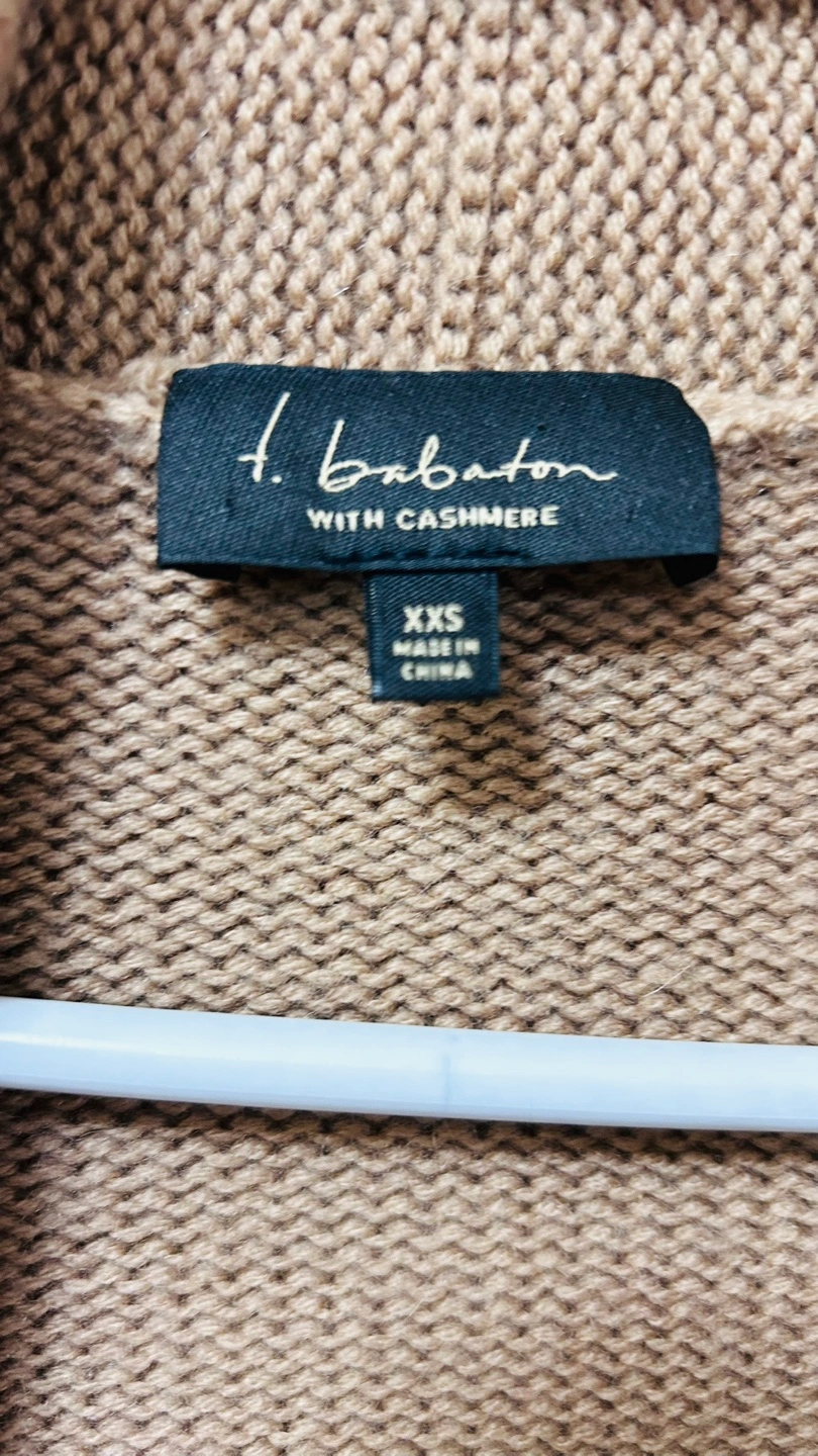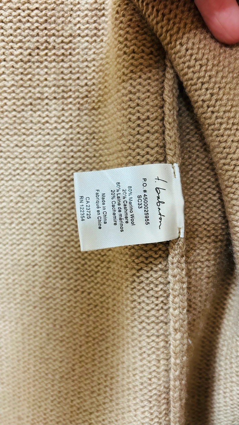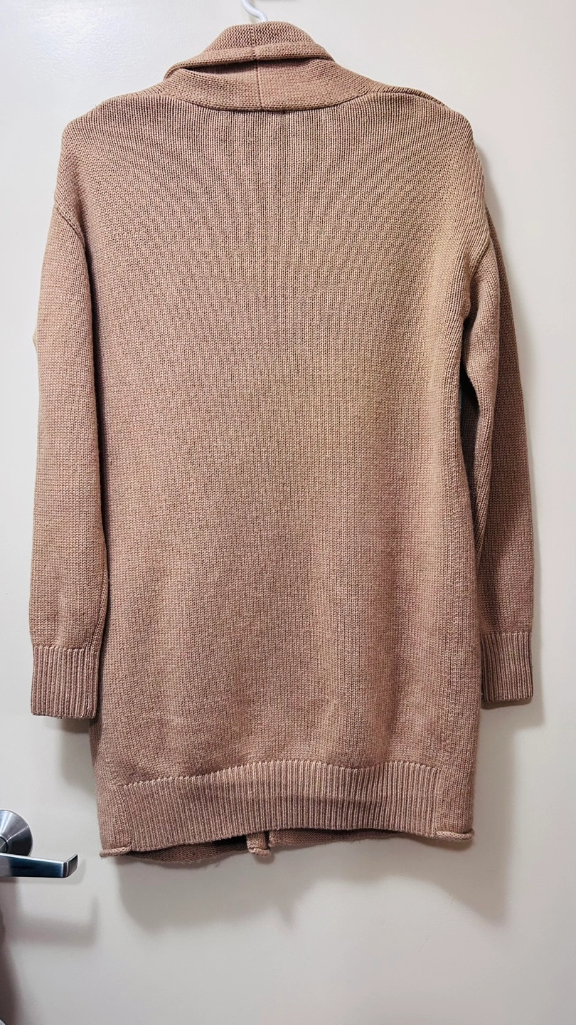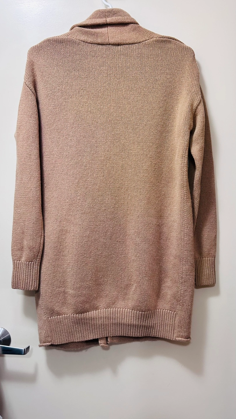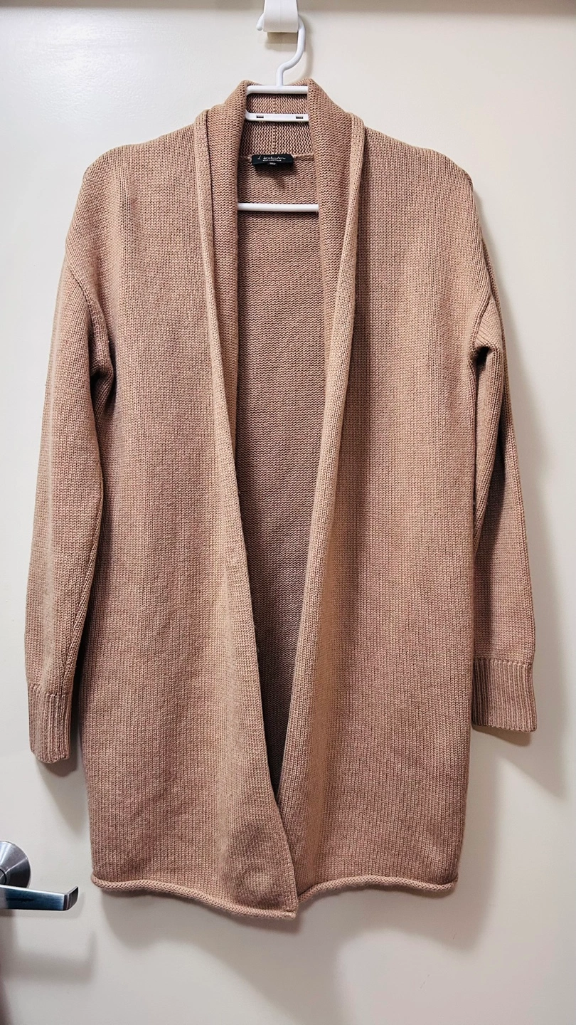 Lightweight cardigan. Open front. Long sleeves. Relaxed fit. 80% merino wool, 20% cashmere. Made in China.