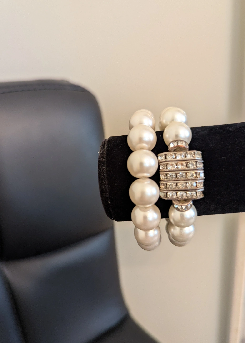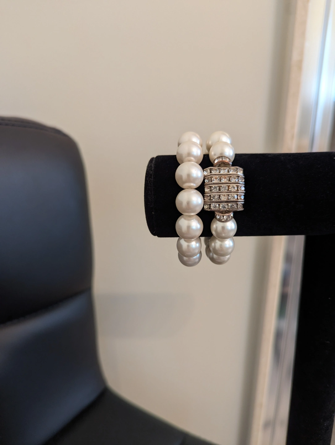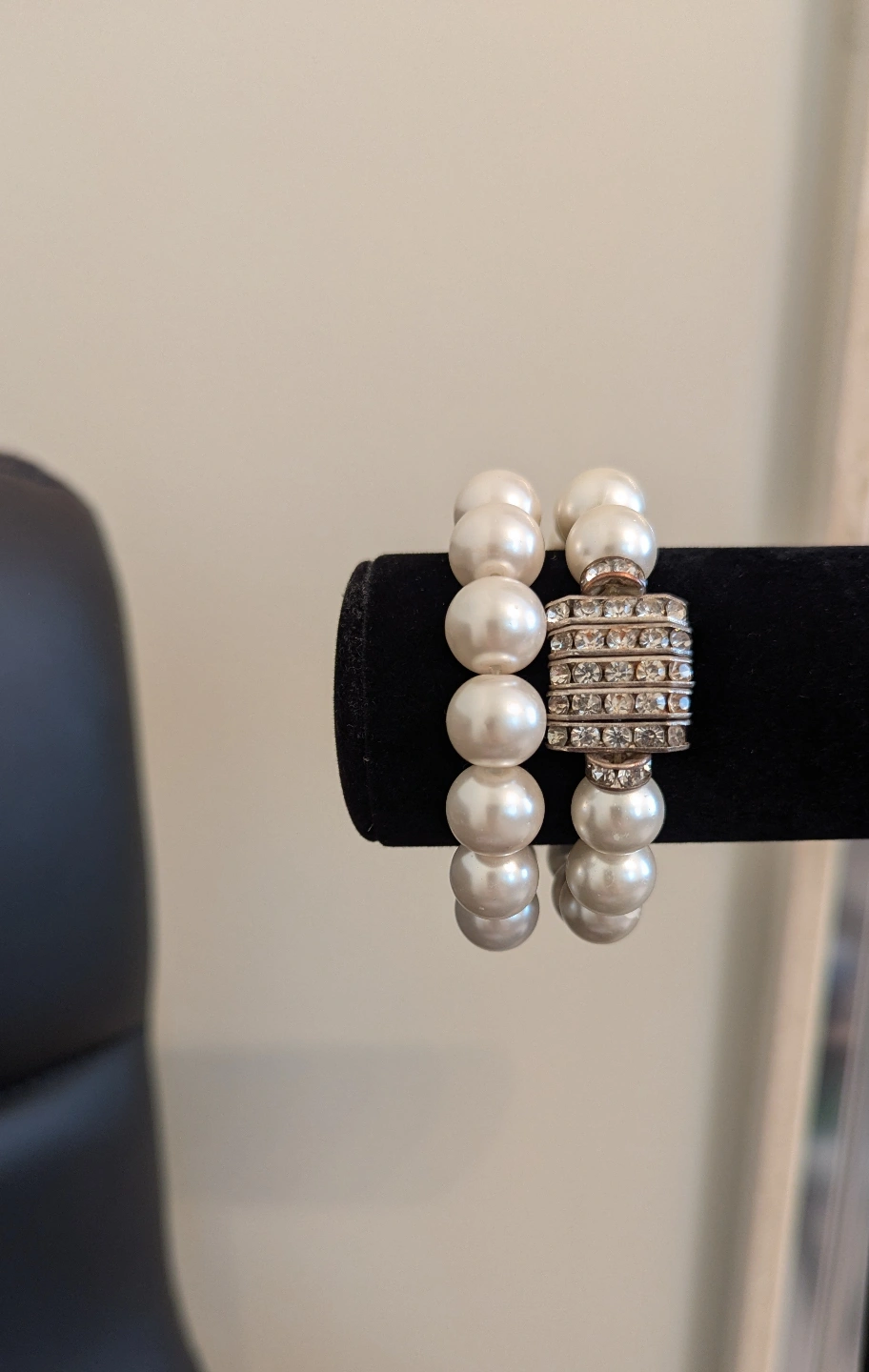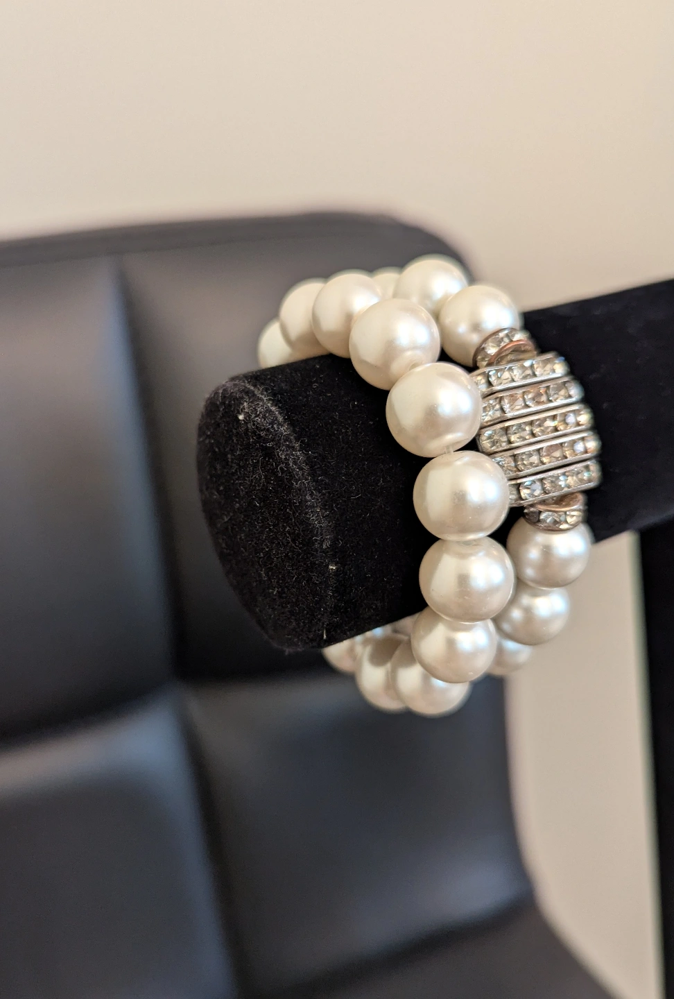 Beautiful set of two pearl bracelets. Features large, creamy-white pearls. One bracelet has a stunning rhinestone faux clasp. Perfect for adding a touch of elegance to any outfit. pickup in Richmond Hill