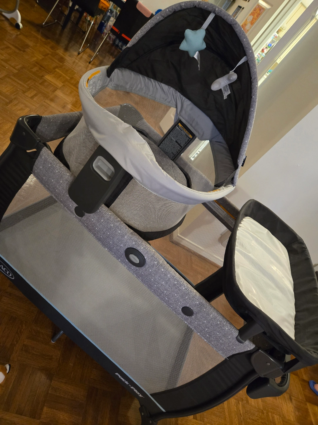 Grey and black playard. Includes bassinet and changing table. Very lightly used because we bought two. The bassinet has never been used.