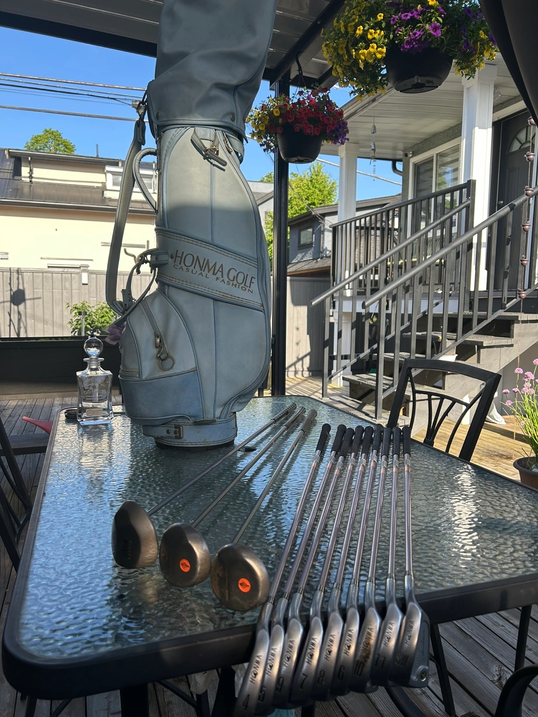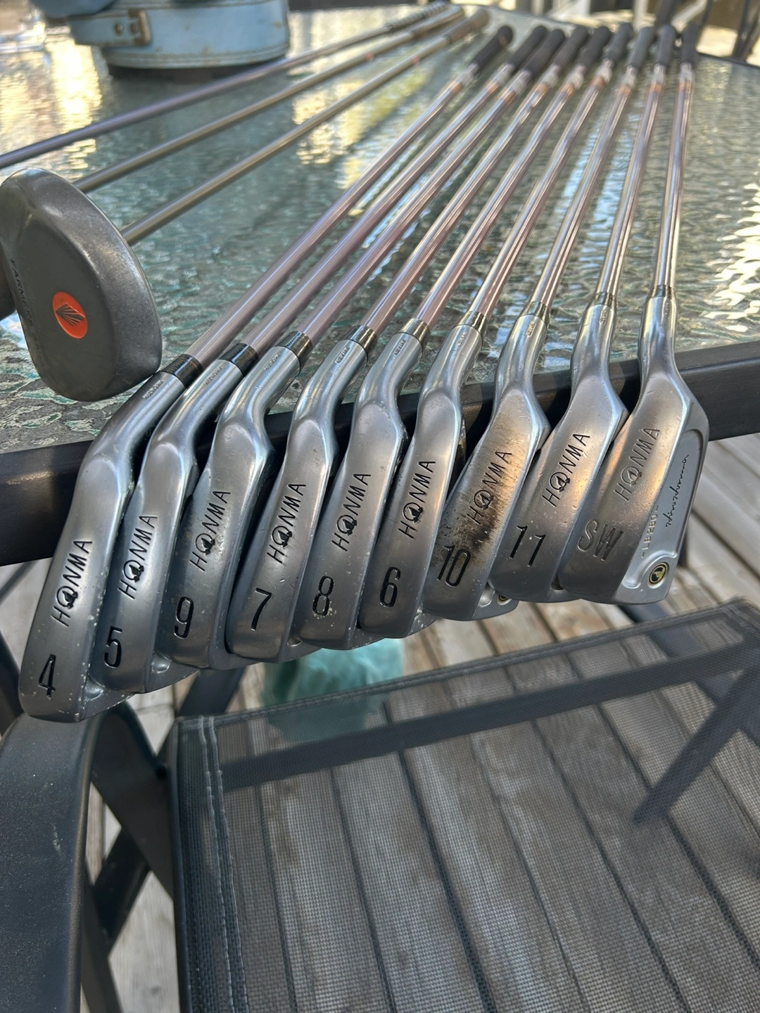 Honma Women’s Iron Set 9 Pcs T800 Carbon M50 Graffiti Grips Honma golf clubs. Includes 1, 5 & 7 woods and a Honma golf bag too . In great condition.