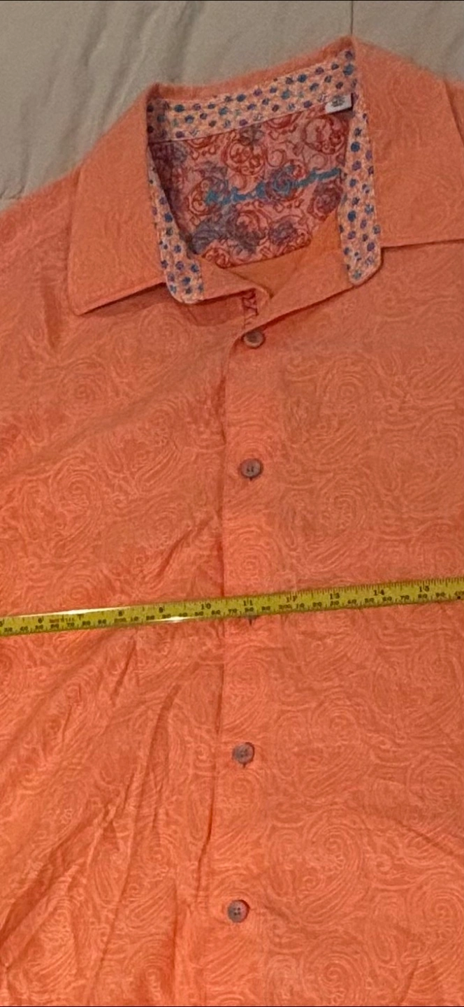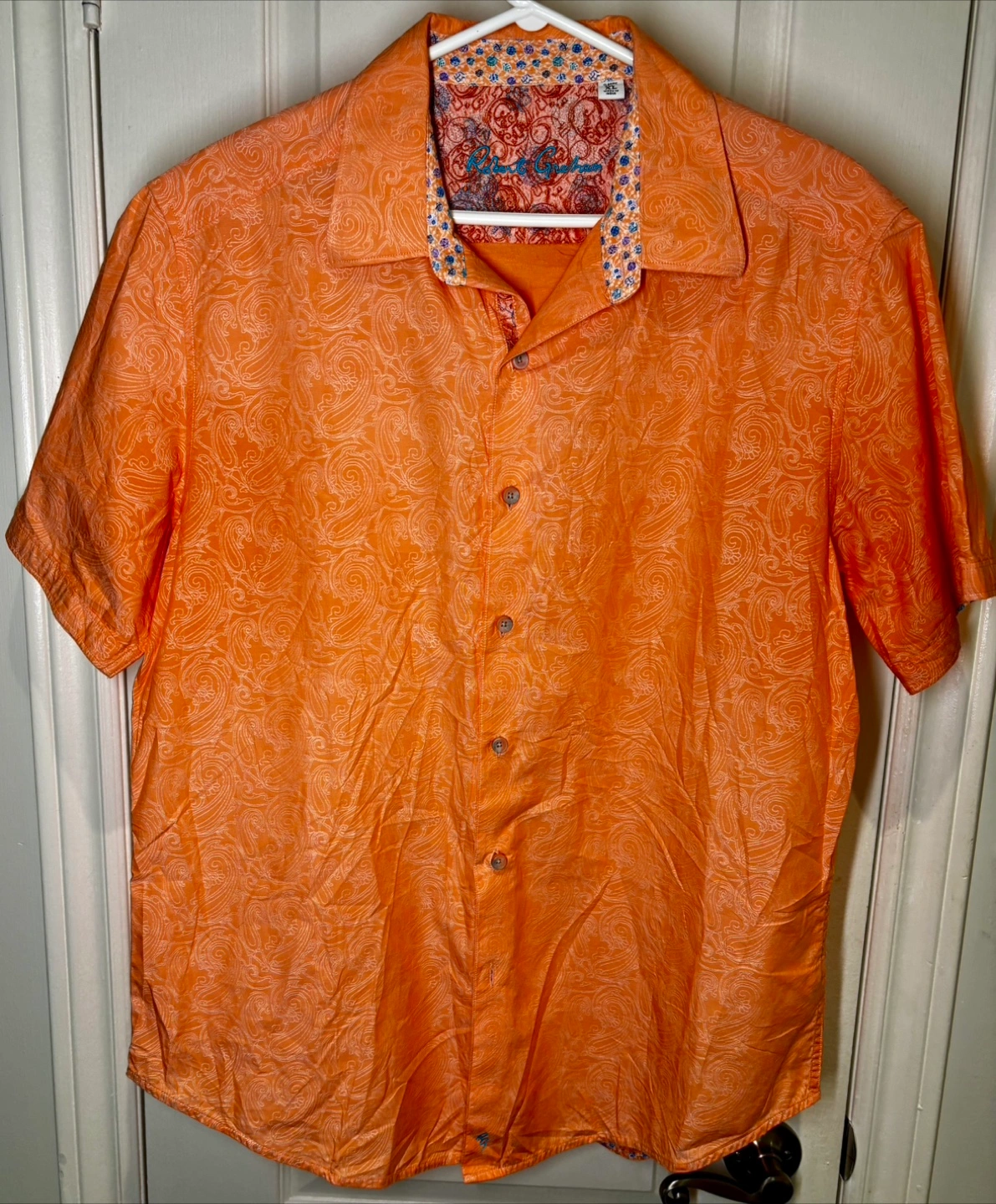Men's Robert Graham shirt. Size XL. Orange colour with a paisley pattern. Short sleeves. Button-down closure. Unique inner collar design. Pickup in Richmond Hill. Thanks for checking out our listing, we have over 200 items for sale so don’t forget to look at those and we can offer deal packages on multiple items.