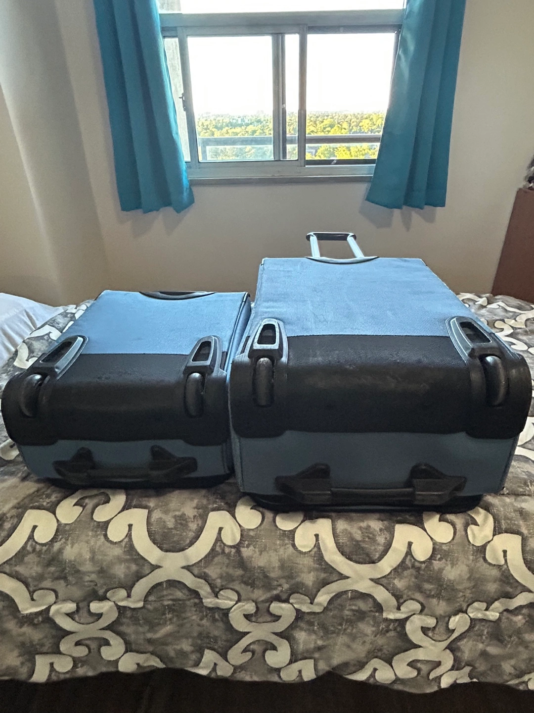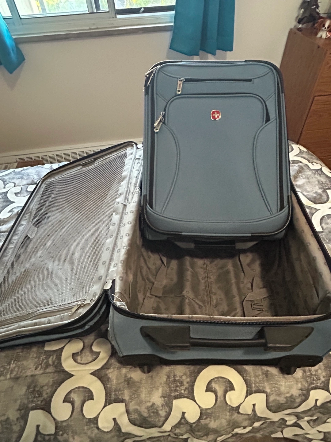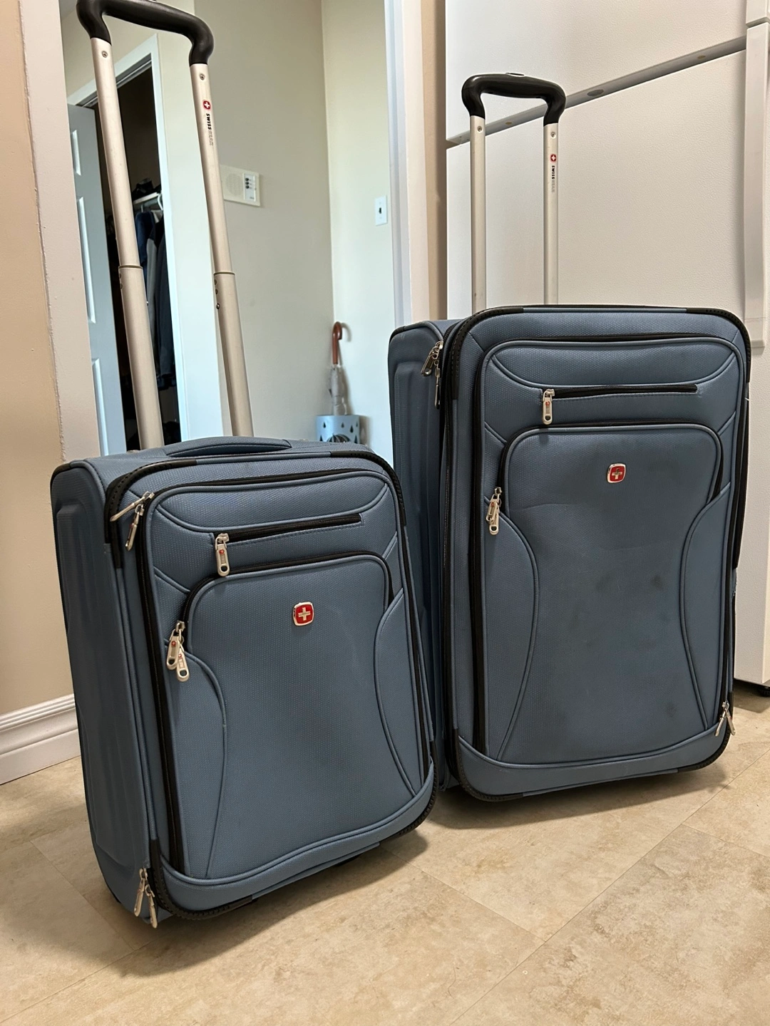 Two-piece luggage set. Swiss Gear brand. Durable fabric. Carry-on and larger checked suitcase. Two wheels on each. Multiple pockets and compartments. Excellent for travel. Larger one has some stains on front.