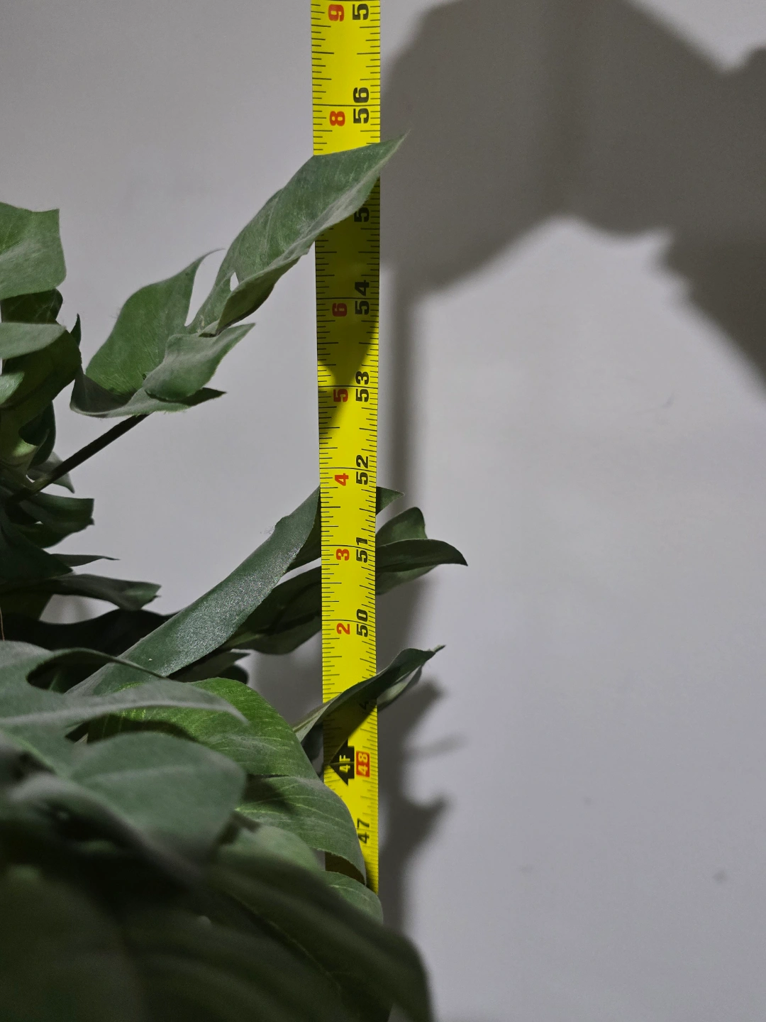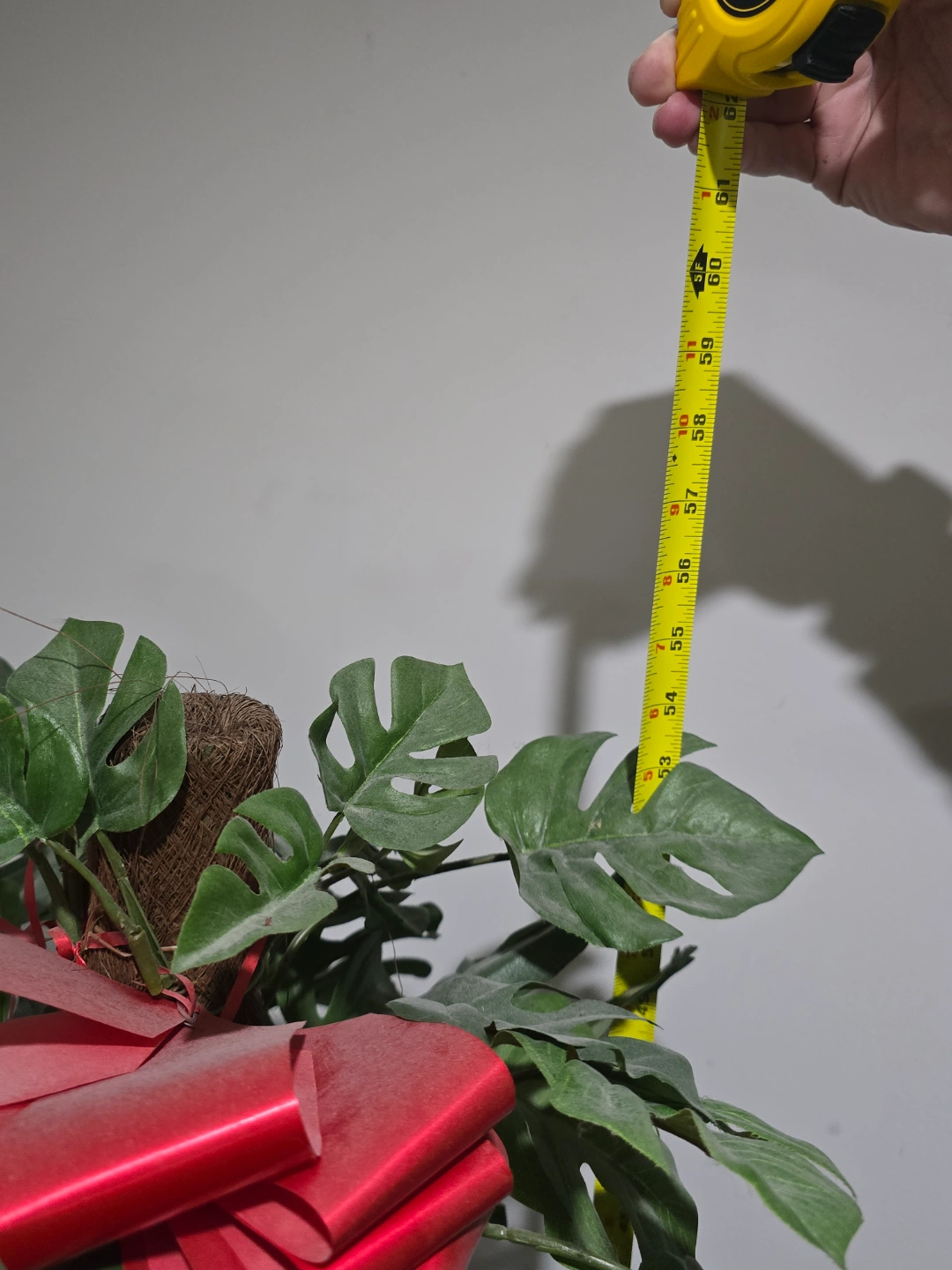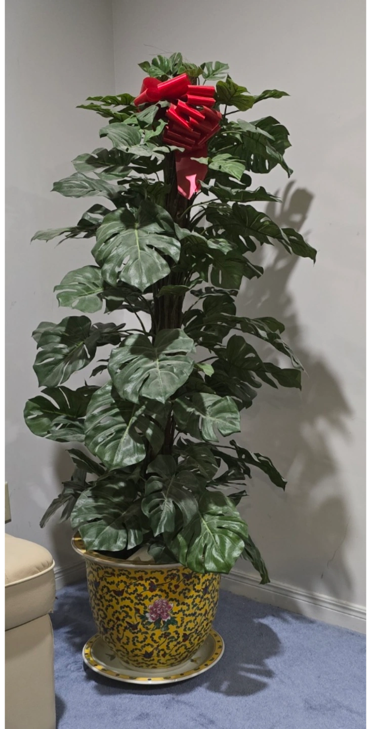 Tall artificial Monstera deliciosa plant. Planter features yellow and blue floral pattern. Approximately 60cm tall. Red decorative ribbon.