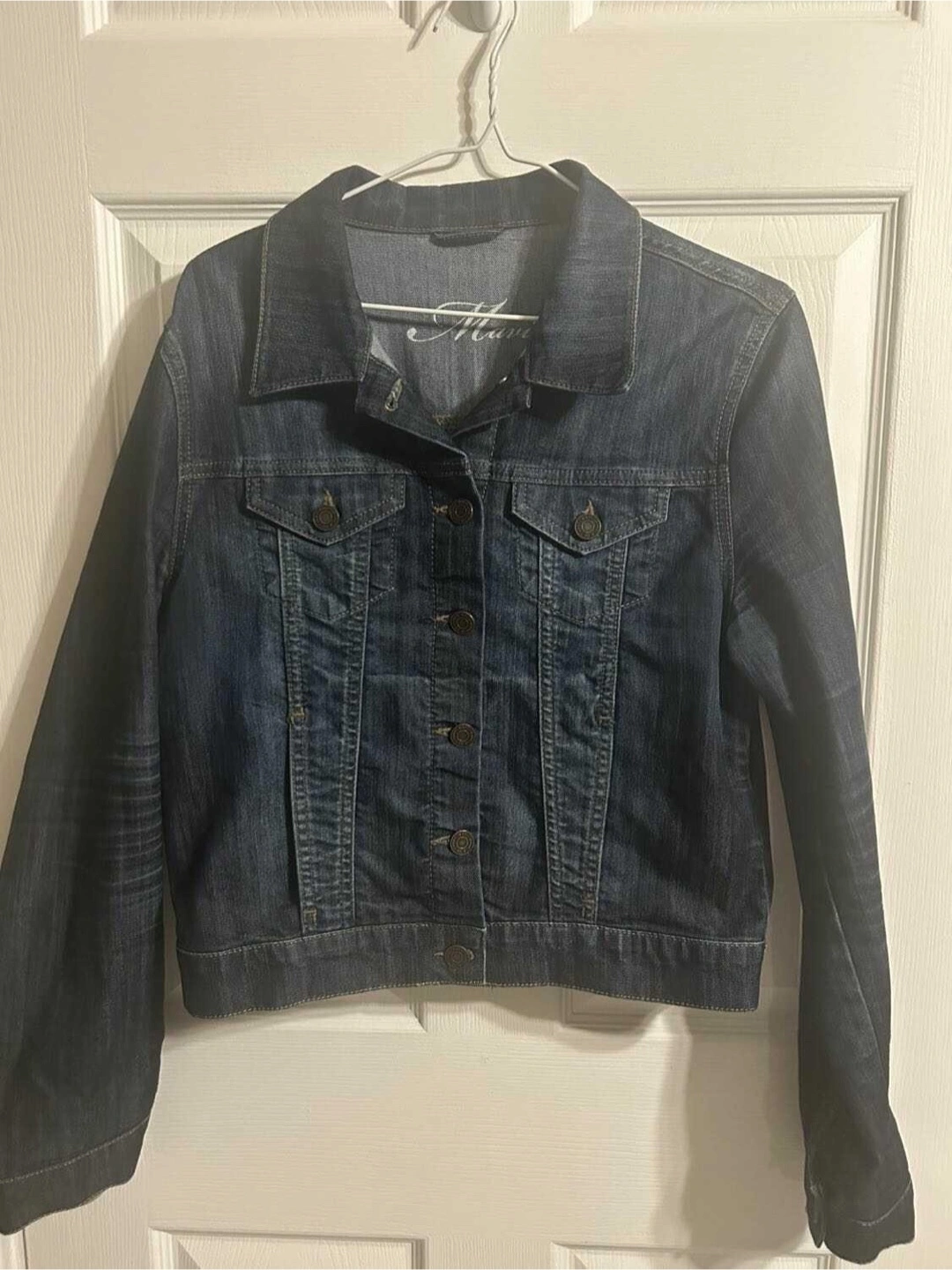 Women's dark wash denim jacket. Size XL. Button closure. Long sleeves. Classic style. Made in Turkey. Cotton & elastene
