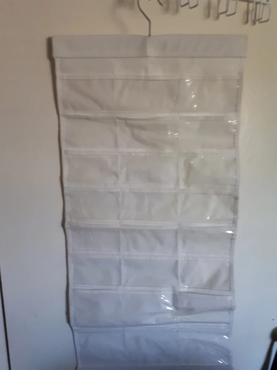 White fabric hanging organiser. Features sixteen clear vinyl pockets. Hangs from a closet rod.