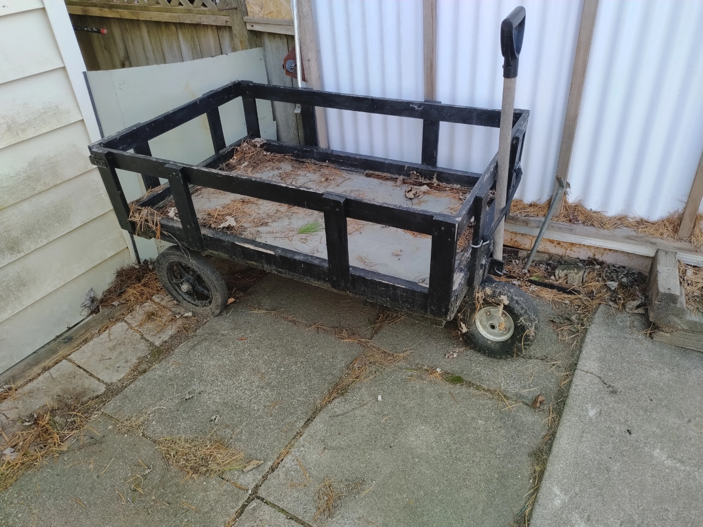 Wooden garden cart. Three wheels. the back part comes off so you can lay things down in it Good for hauling.