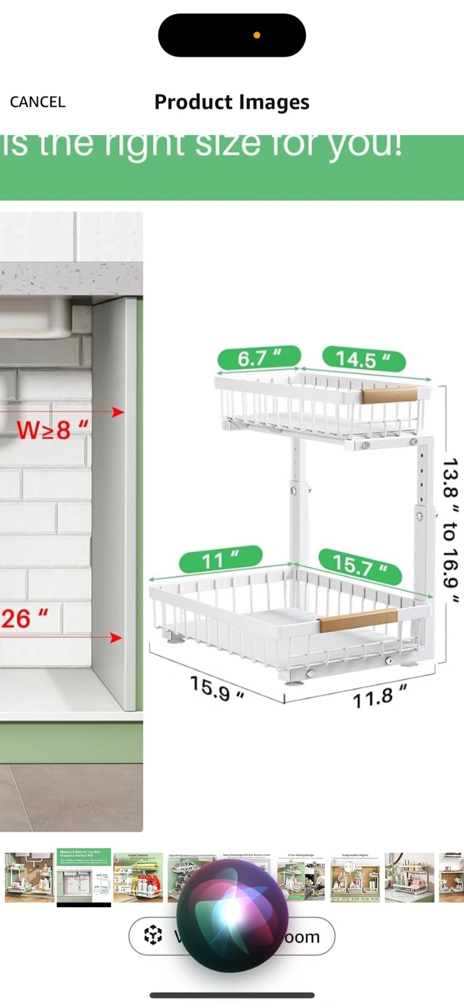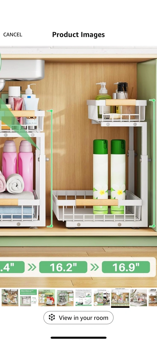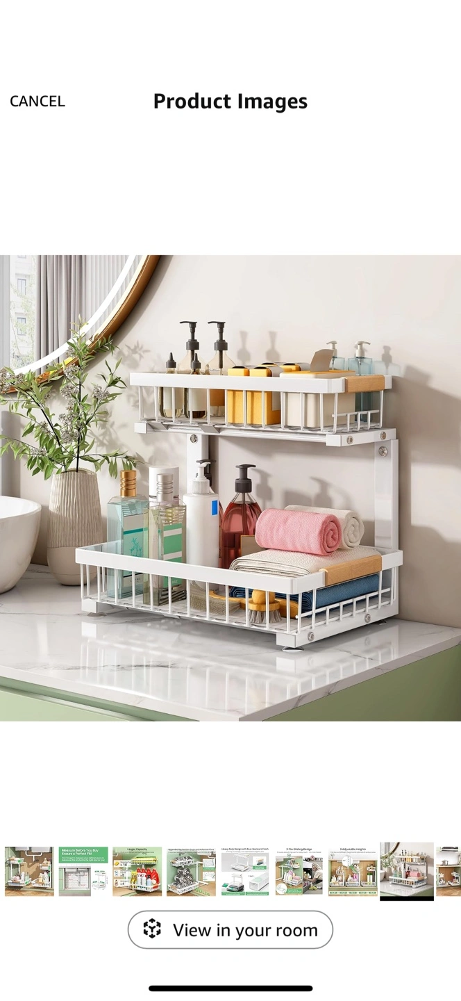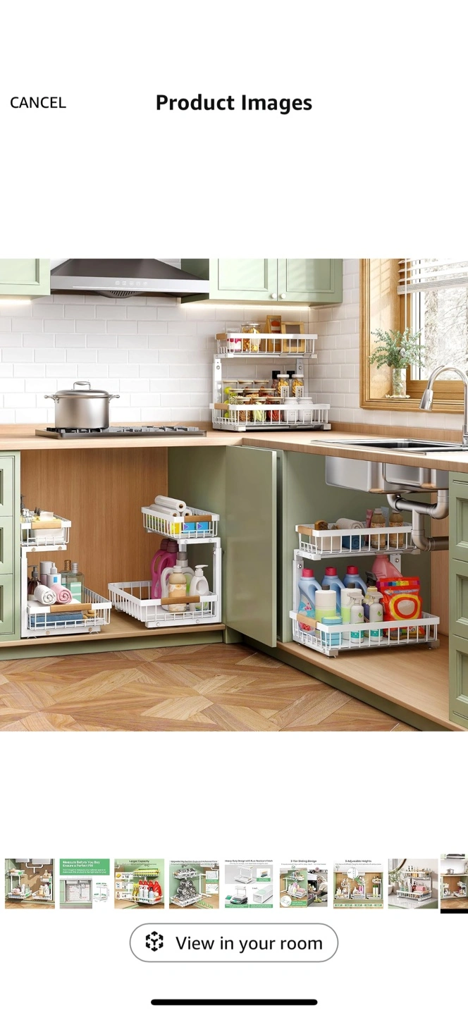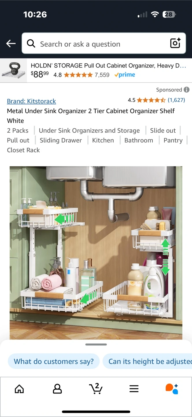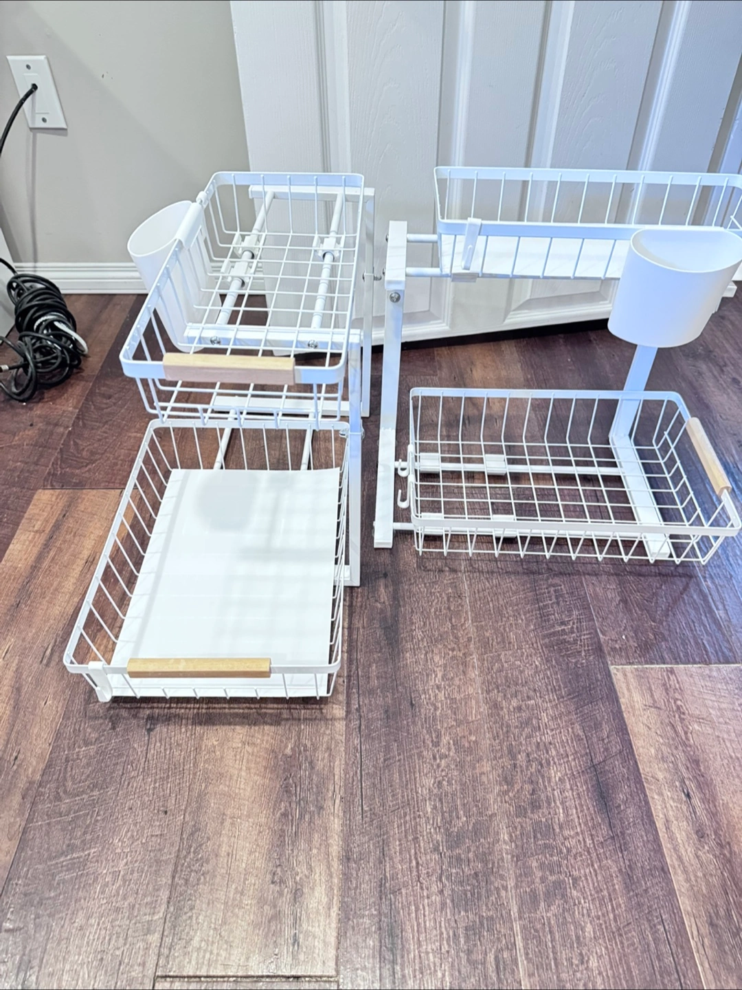 Two-tier pull-out cabinet organizer. Great for kitchen, bathroom, or pantry. Sliding drawer design. Metal construction. White finish.