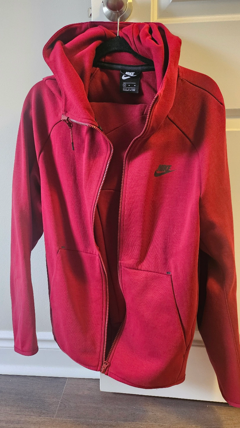 Men's Nike Tech Fleece tracksuit. Crimson red colour. Hoodie features a full zip and kangaroo pocket. Joggers have an elastic waistband and cuffs. Excellent for lounging or working out.