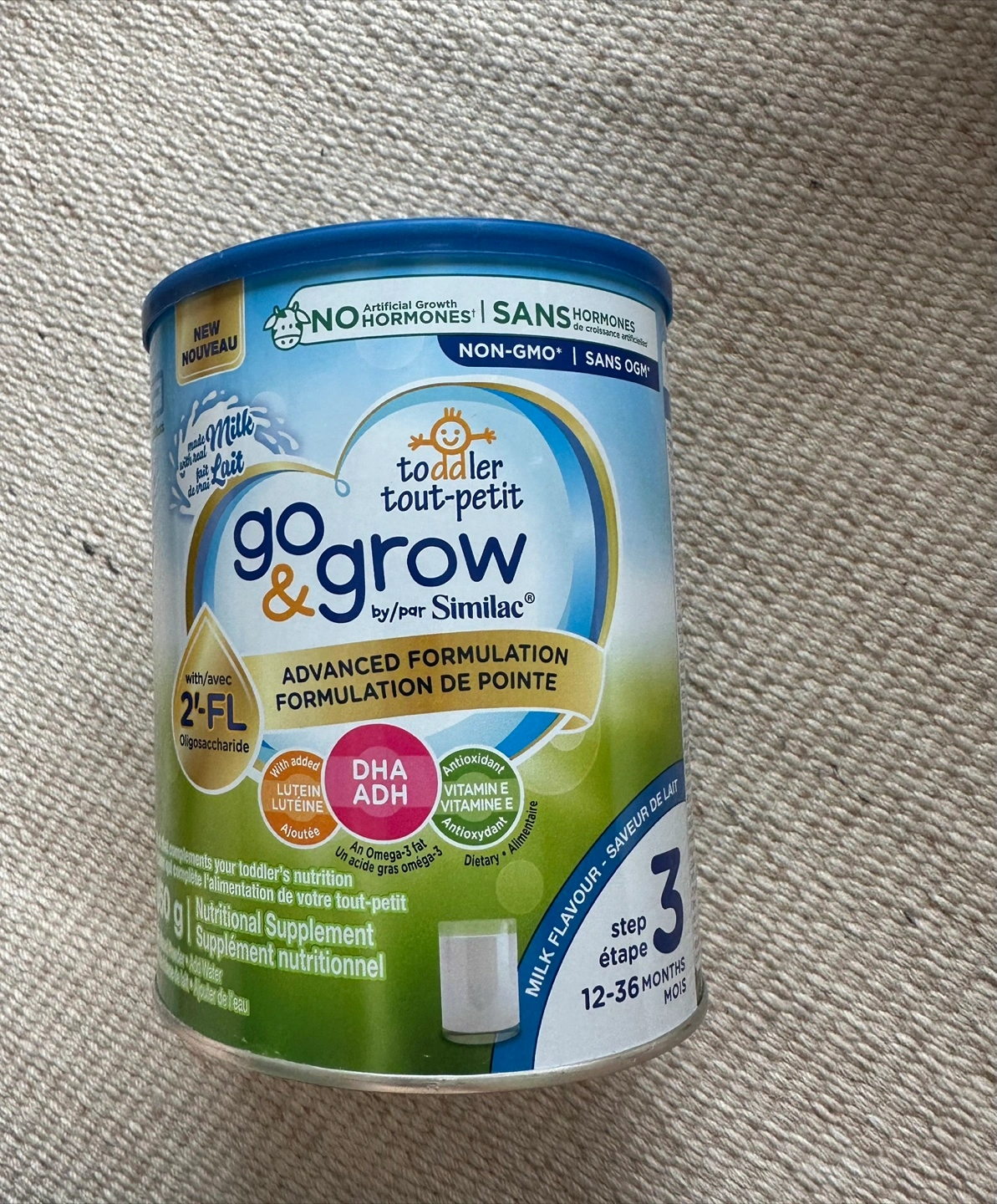 Similac Go & Grow advanced formulation toddler milk powder. Stage 3, for 12-36 months. New packaging. Milk flavour. Contains DHA, ARA, Lutein, and Vitamins.