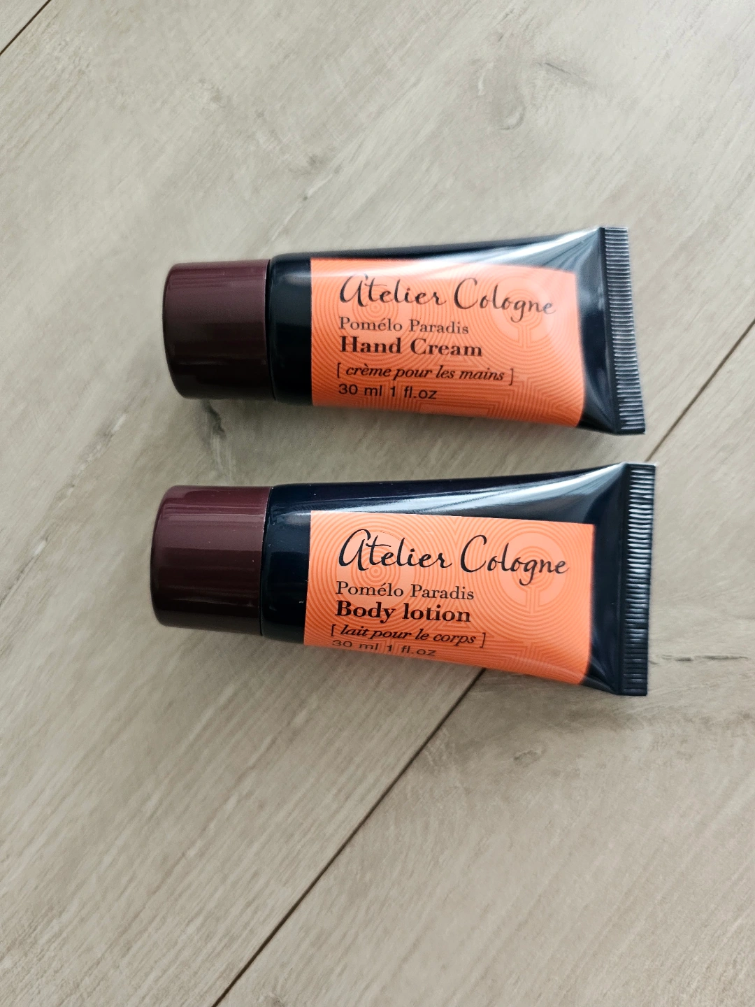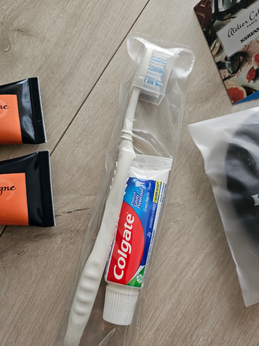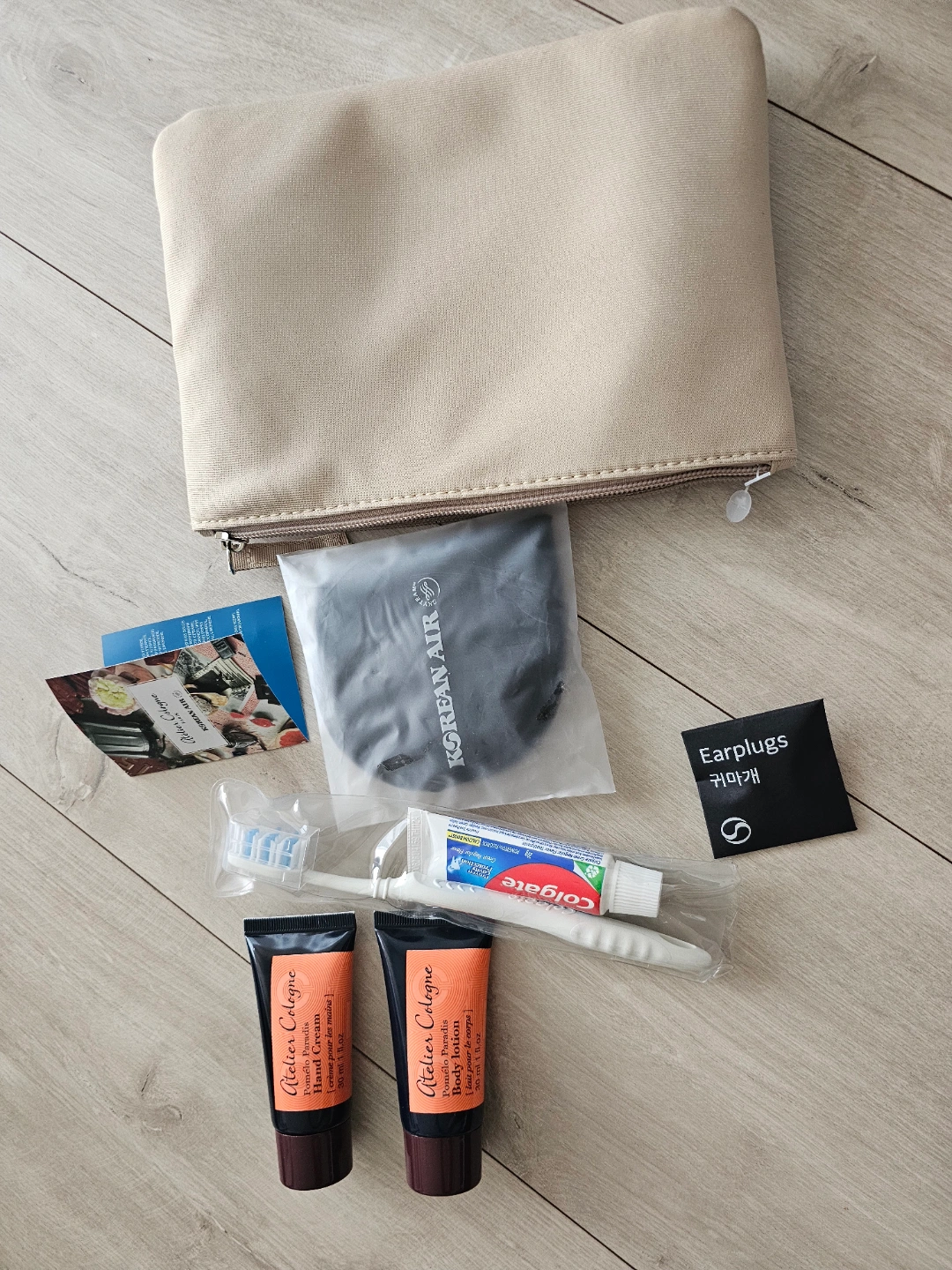 Unused Korean Air amenity kit. Includes Atelier Cologne hand cream and body lotion, Colgate toothbrush and toothpaste, eye mask, earplugs, and a beige zippered pouch. Perfect for travel. condition:NEW