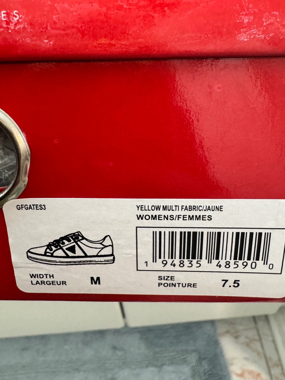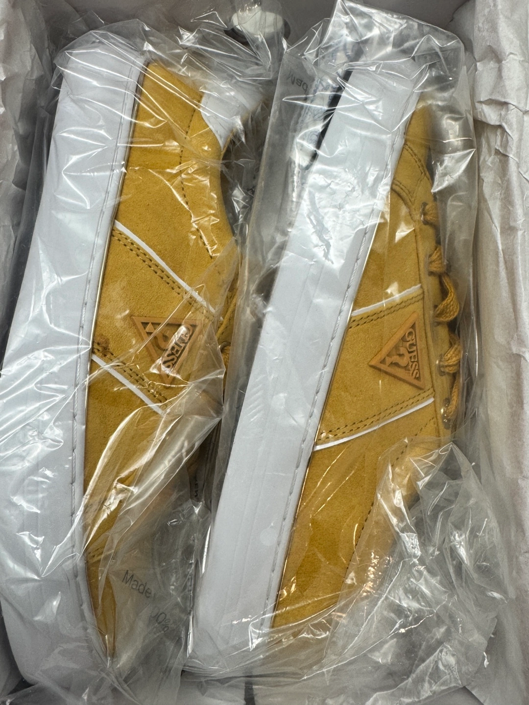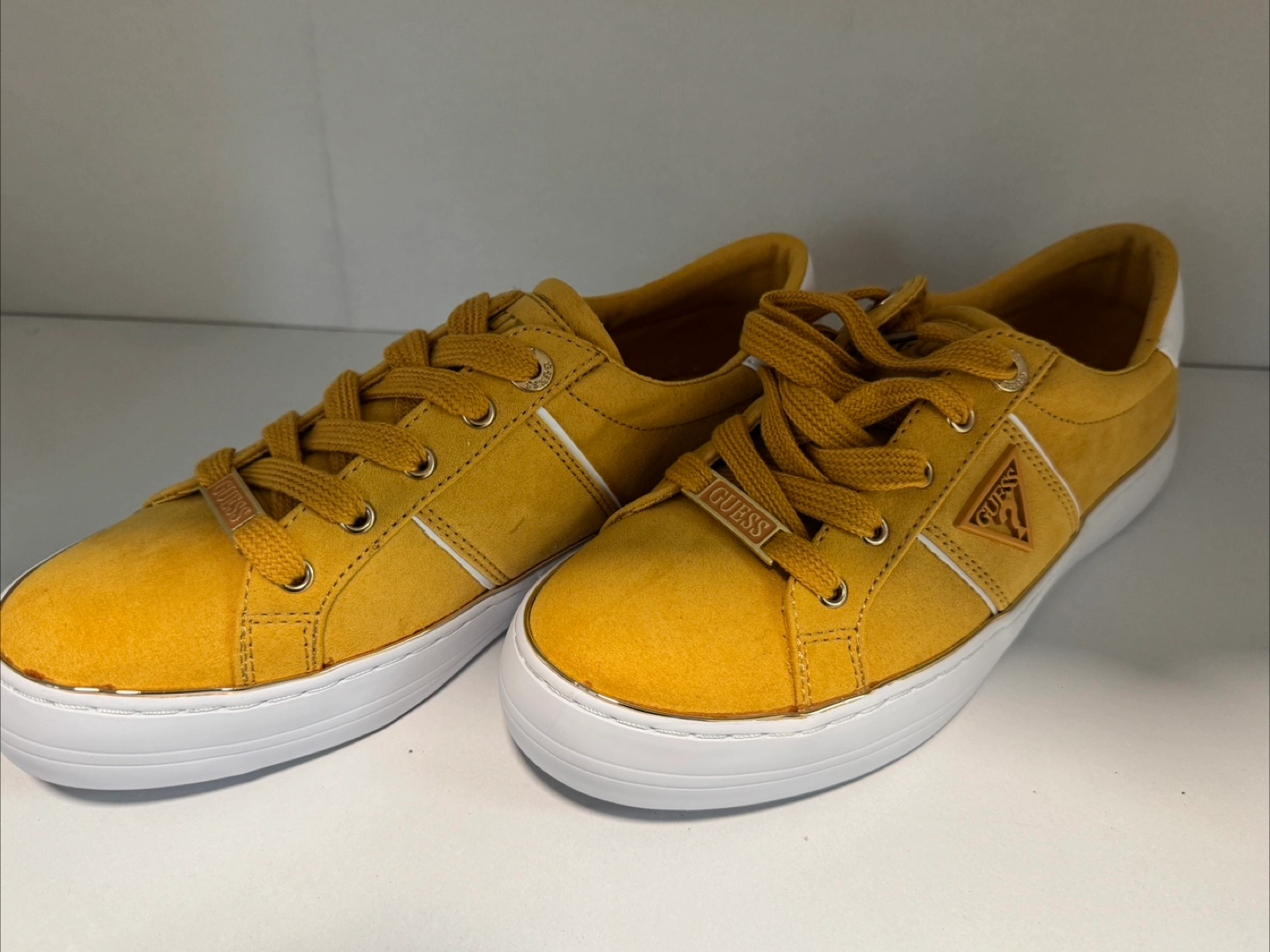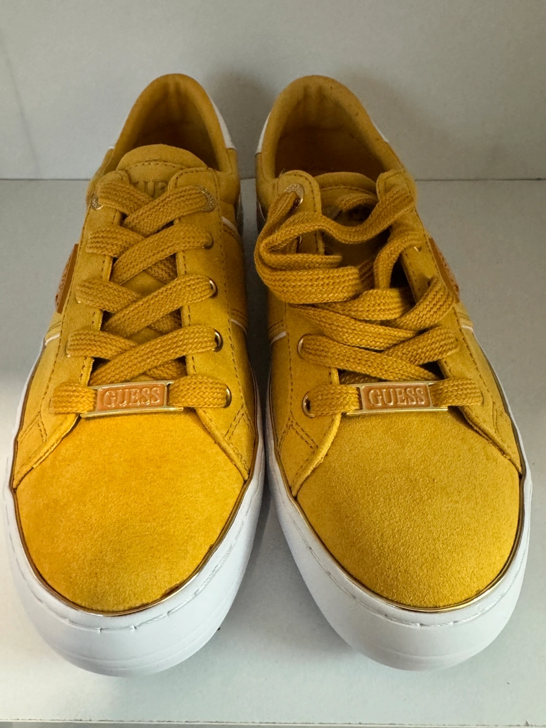 Mustard yellow suede sneakers. White sole and accents. Guess logo on tongue and side. Lace-up closure. Size 7.5 medium width.