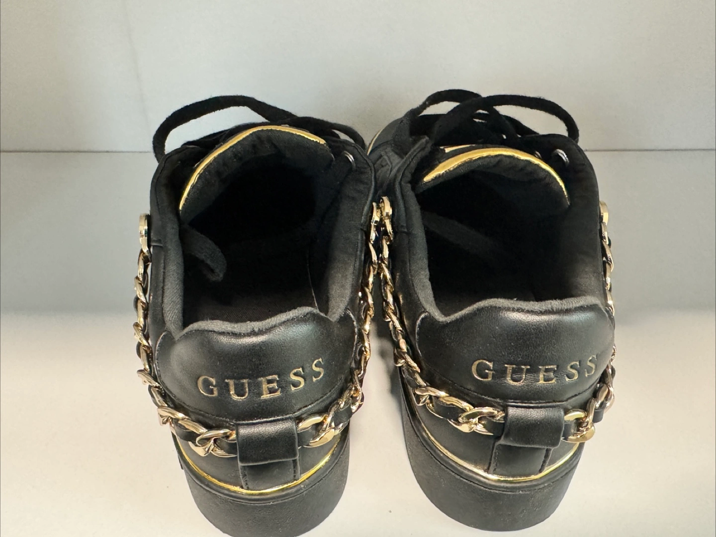 Gentle used. Selling as it. Black leather sneakers with gold accents. Features a gold chain detail. Lace-up closure. Size 7.5.
